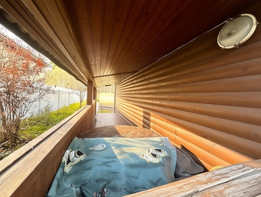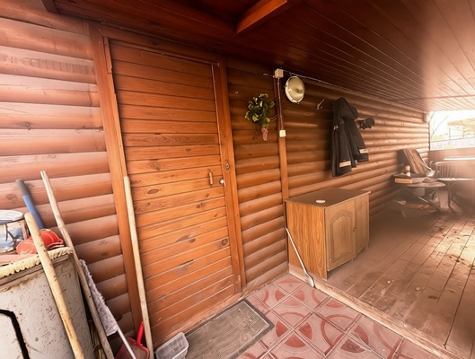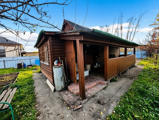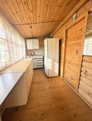 Дом одноэтажный с террасой, каркасный (внешняя облицовка фальш-бревно, внутренняя отделка - вагонка) на хорошей монолитной плите. Кухня (проходная), через которую можно попасть в гостиную-спальню.