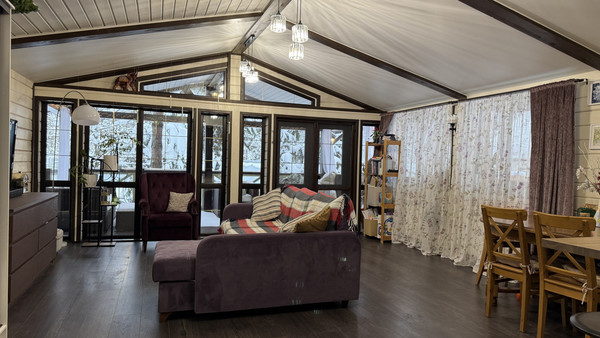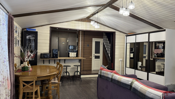 Общая площадь дома составляет 104.9 кв.м. В доме три уютных комнаты : спальня, большая детская на втором этаже и гостиная объединенная с кухней. Кухня небольшая, но в ней есть необходимое:- холодильник Bosh- Посудомоечная машина Bosh - Духовая плита Electrolux - Варочная панель Sumsung- Система фильтрации воды в том числе и питьевой АквафорВ гостиной одна из стен полностью остеклена, открывается потрясающий вид на большую веранду.