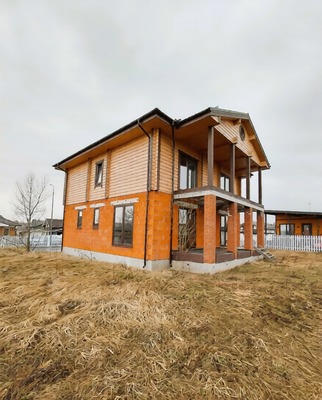 Стены:Этаж 1 - крупноформатные керамические блоки Роrоthеrm. Под первым рядом укладывают гидроизоляцию — битумная защита на 10 см шире самой стены. Для соединения блоков использован соответствующий кладочный материал — смесь Роrоthеrm ТМ.Этаж 2 – перекрытие деревянные балки, стены - клееный брус.Крыша: двускатная, металлочерепица.Окна: ПВХ, двухкамерные.Участок ровный, площадь 1332 кв.м, для ИЖС, огорожен в едином стиле красивым белым штакетником с трех сторон