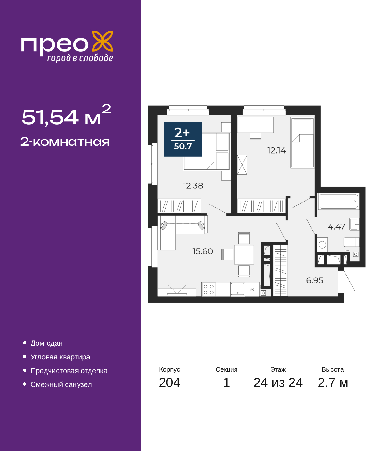 Двухкомнатная квартира с предчистовой отделкой в ЖК "Прео" на 24 этаже. Общая площадь: 51.54 кв.м., жилая: 24.52 кв.м., площадь просторной кухни-столовой: 15.6 кв.м. Квартира угловая, идеально подойдет любителям тишины и панорамных видов. В квартире один совмещенный санузел. Высота потолков 2.7 м. Квартира находится в корпусе 204. Дом монолитный, одноподъездный, высотой 24 этажа. На этаже 14 квартир. В подъезде 2 грузовых лифта. В настоящее время строительство окончено, дом сдан в 4 квартале 2024 года. Оформление сделки по договору купли-продажи. Преображенский — один из самых привлекательных районов для жизни! Это полностью самостоятельный жилой район с точки зрения инфраструктуры. Преображенский находится между Московским и Червишевским трактами в квартале улиц Закалужская — Вьюжная — Александра Протозанова. Не нужно ждать, когда появится инфраструктура — переезжайте на всё готовое. Вблизи расположены действующие школа и детский сад. В этом году откроется еще один сад, а в следующем году — школа. По соседству с Преображенским запланировано строительство городского парка «Комарово» площадью 38 гектар. За 10 минут можно доехать на автомобиле до крупных ТРЦ: «Лента», «Кристалл», «Леруа Мерлен», «Метро» и «Ашан». С 2018 года в районе открыт Соседский центр — пространство, созданное для формирования добрососедской среды, совместного досуга, общения и реализации соседских инициатив. Здесь проходят встречи соседей, а также сами жители района организовывают мероприятия. Организатором такого события может стать любой желающий. В квартирах выполнена качественная предчистовая отделка. Гладкие стены с финишным выравниванием по маякам. Ровный потолок для установки натяжного потолка. Установлены пятикамерные окна с двойным стеклопакетом (3 стекла). Дизайнерские холлы с видеонаблюдением, безбарьерным и прозрачным входом – всегда светло и спокойно. На первом этаже есть просторные колясочные, где все жители могут оставлять свои коляски и велосипеды. В Преображенском есть всё, что нужно для активного отдыха и занятий спортом. Мы сделали большое футбольное поле с безопасным покрытием. Также установили хоккейный корт, который оборудован по всем необходимым стандартам. Во дворах можно делать упражнения на специальных площадках с турниками. Весь район мы обустроили велодорожками, которые связаны в единый маршрут. У нас есть сухие фонтаны, бьющие из земли, деревья, веревки, сетки, скалодром, газон, песок и резинка — осталось просто дать своему ребенку право на свободную игру. По-настоящему хорошие дворы — это те, которые дети предпочитают соцсетям и телевизору. Аккредитация в банках: ПАО Банк «ВТБ», «Сбербанк России», ОАО «Альфа-Банк», ПАО «Газпромбанк», ПАО «Банк Уралсиб» и других. (AQID02278542)