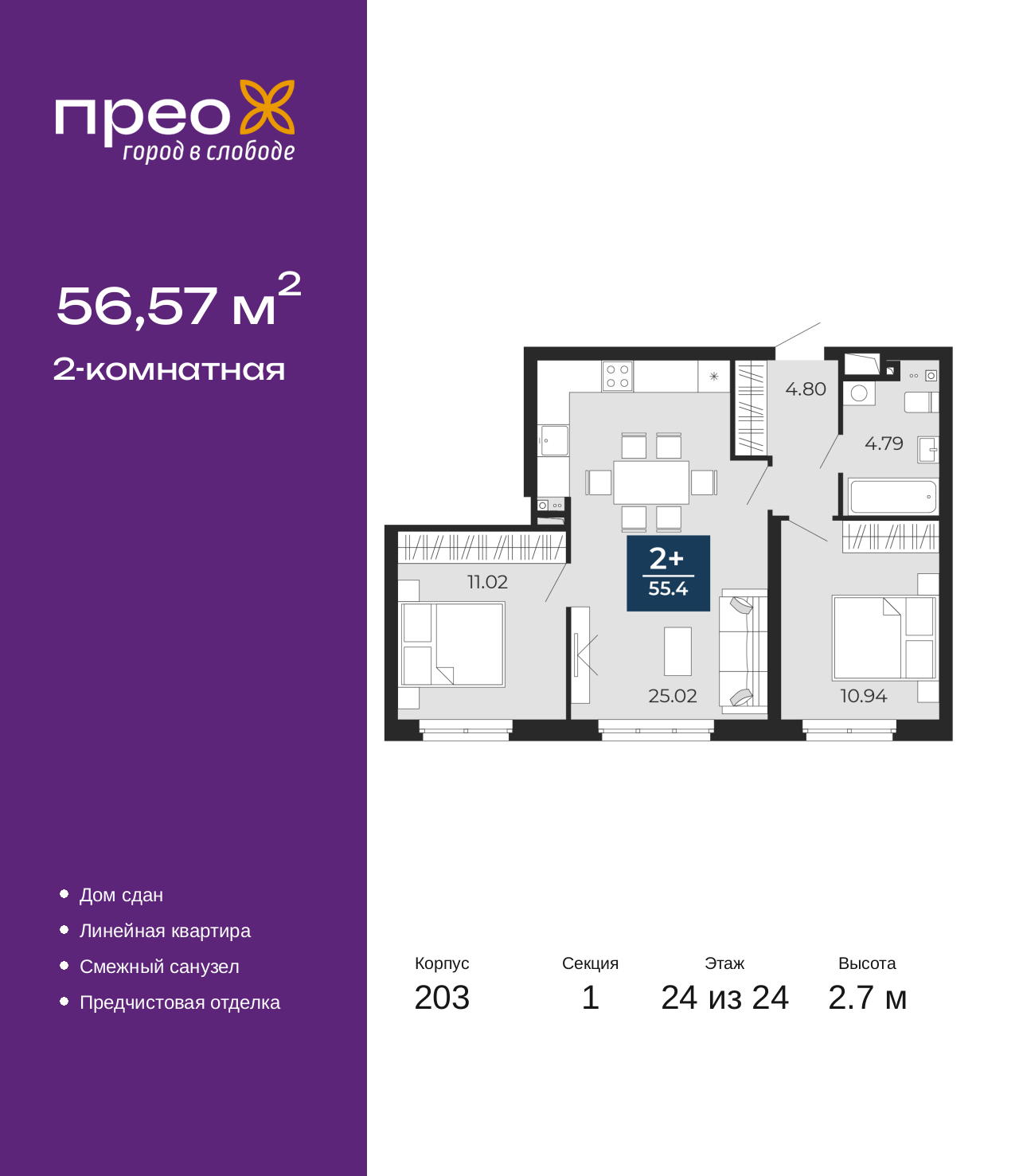 2-комн. квартира с предчистовой отделкой в ЖК "Прео" на 24 этаже. Общая площадь: 56.57 кв.м., жилая: 21.96 кв.м., площадь просторной кухни-столовой: 25.02 кв.м. Комнаты изолированные, все окна выходят на одну сторону. В квартире один совмещенный санузел. Высота потолков 2.7 м. Квартира находится в корпусе 203. Дом монолитный, одноподъездный, высотой 24 этажа. На этаже 14 квартир. В подъезде 2 грузовых лифта. Строительство окончено, дом сдан в 4 квартале 2024 года. Оформление сделки по договору купли-продажи. Преображенский — один из самых привлекательных районов для жизни! Это полностью самостоятельный жилой район с точки зрения инфраструктуры. Преображенский находится между Московским и Червишевским трактами в квартале улиц Закалужская — Вьюжная — Александра Протозанова. Не нужно ждать, когда появится инфраструктура — переезжайте на всё готовое. Вблизи расположены действующие школа и детский сад. В этом году откроется еще один сад, а в следующем году — школа. По соседству с Преображенским запланировано строительство городского парка «Комарово» площадью 38 гектар. За 10 минут можно доехать на автомобиле до крупных ТРЦ: «Лента», «Кристалл», «Леруа Мерлен», «Метро» и «Ашан». С 2018 года в районе открыт Соседский центр — пространство, созданное для формирования добрососедской среды, совместного досуга, общения и реализации соседских инициатив. Здесь проходят встречи соседей, а также сами жители района организовывают мероприятия. Организатором такого события может стать любой желающий. В квартирах выполнена качественная предчистовая отделка. Гладкие стены с финишным выравниванием по маякам. Ровный потолок для установки натяжного потолка. Установлены пятикамерные окна с двойным стеклопакетом (3 стекла). Дизайнерские холлы с видеонаблюдением, безбарьерным и прозрачным входом – всегда светло и спокойно. На первом этаже есть просторные колясочные, где все жители могут оставлять свои коляски и велосипеды. В Преображенском есть всё, что нужно для активного отдыха и занятий спортом. Мы сделали большое футбольное поле с безопасным покрытием. Также установили хоккейный корт, который оборудован по всем необходимым стандартам. Во дворах можно делать упражнения на специальных площадках с турниками. Весь район мы обустроили велодорожками, которые связаны в единый маршрут. У нас есть сухие фонтаны, бьющие из земли, деревья, веревки, сетки, скалодром, газон, песок и резинка — осталось просто дать своему ребенку право на свободную игру. По-настоящему хорошие дворы — это те, которые дети предпочитают соцсетям и телевизору. Аккредитация в банках: «Сбербанк России», ПАО Банк «ВТБ», ОАО «Альфа-Банк», ПАО «Газпромбанк», ПАО «Банк Уралсиб» и других. (AQID02278598)