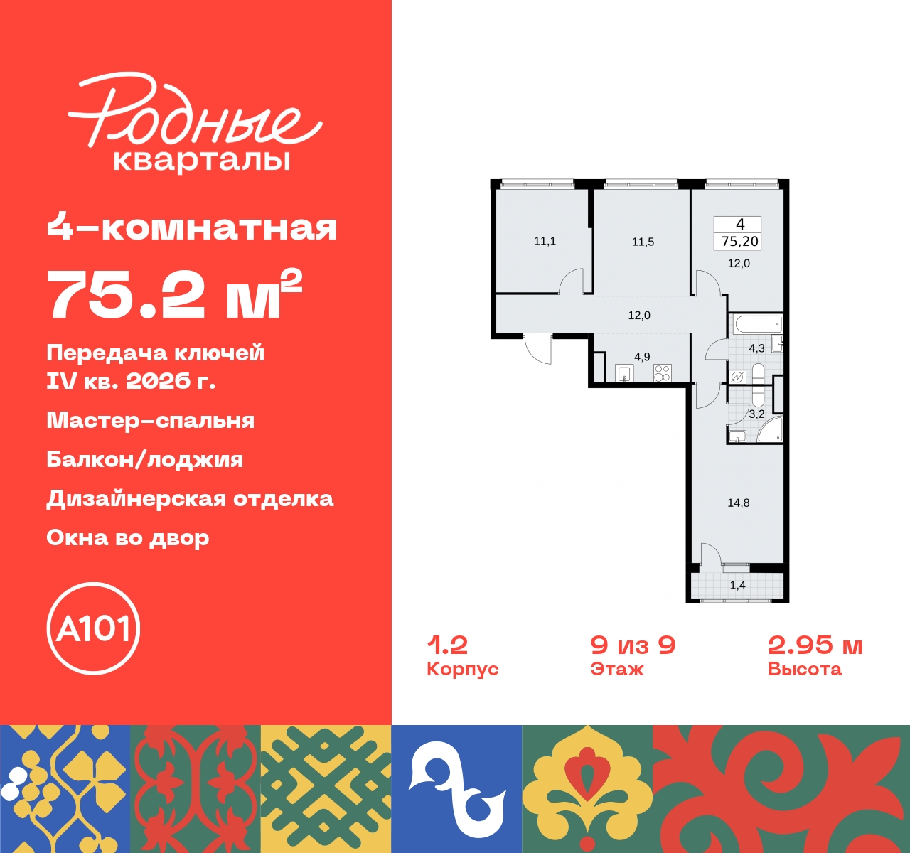 Четырехкомнатная квартира с европланировкой и отделкой в ЖК "Родные кварталы" на 9 этаже. Общая площадь: 75.2 кв.м., жилая: 49.4 кв.м., общая площадь гостиной-столовой с кухонной зоной: 16.4 кв.м. Европейская планировка, кухня и гостиная объединены в одно просторное помещение. Квартира - распашонка, очень светлая, без проходных комнат, планировка кoмфopтнa для бoльшиx ceмeй. В квартире один балкон, два совмещенных санузла. Высота потолков 2.9 м. Дом монолитный, многоподъездный, высотой 9 этажей. Квартира находится в 1-й секции в корпусе 1.2. На этаже 6 квартир. В подъезде 1 грузовой лифт. Начало строительства - 4 квартал 2023 года. Окончание строительства - 4 квартал 2026 года. Оформление сделки по договору долевого участия. Артикул квартиры по базе застройщика 96К-1.2-142. Новый жилой комплекс "Родные кварталы" строится в уютной, экологически благополучной локации на юго-западе столицы. В ближайшем окружении – ухоженные малоэтажные посёлки и живописный Ульяновский лесопарк. Благодаря этому из окон откроются вдохновляющие виды, которые не исчезнут со временем за фасадами многоэтажек. Через весь район пройдёт главный бульвар, который свяжет набережную, жилые кварталы и площади в единое дружелюбное пространство, органично наполненное узнаваемыми элементами культурных традиций разных народов. В жилом комплексе создаются условия для комфортного отдыха и занятий спортом всех жителей. Здесь можно прогуляться и отдохнуть в лесопарке на берегу ручья, позаниматься на тренажёрах под открытым небом и спортивных площадках. Для малышей построят игровые комплексы, развивающие силу, координацию и ловкость. Всего в жилом комплексе будет оборудовано 6 га территории для спокойного отдыха и около 9 га — для активного. Подъезды в домах освещены в любое время суток, входы и вестибюль хорошо просматриваются с улицы. Витражное остекление обеспечивает приток естественного света днём, а вечером зажигаются светильники. В отделке домов используется сочетание вентилируемого фасада с облицовкой из фибробетонной плитки и штукатуркой. Комфортная высота домов соразмерна человеку и в среднем составляет 10 этажей. Все дома обеспечены собственными подземными паркингами. В них размещаются машино-места и кладовые. В паркинг или кладовую можно спуститься на лифте или по лестнице. В комплексе появятся бытовые сервисы, магазины, аптеки и другие торгово-бытовые объекты. В жилом районе «Родные кварталы» будут построены: - образовательный центр: школа на 1300 учеников и детский сад на 250 малышей, - два детских сада на 200 мест каждый (один из них сдаётся в 1-й очереди). В транспортной доступности уже работают: - школа № 41 и детский сад — по Боровскому шоссе, - школа № 2057 и детский сад — на запад от района, в дер. Марушкино. ЖК «Родные кварталы» строится в Новомосковском округе столицы, в 15 минутах на автомобиле от аэропорта «Внуково». Район обеспечен удобными выездами на три крупные современные автотрассы. Здесь уже работает и активно развивается система наземного общественного транспорта, включая междугородние рейсы. Интенсивное развитие локации обеспечивают две действующие станции крупных транспортных линий: метро (станция «Внуково») и МЦД (станция «Толстопальцево»). (AQID02317749)