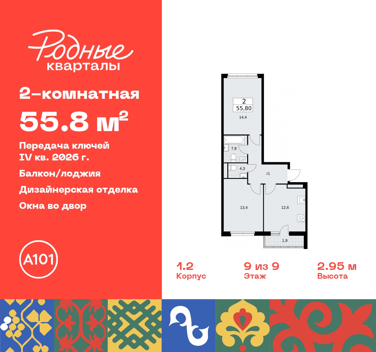 Двухкомнатная квартира с отделкой в ЖК "Родные кварталы" на 9 этаже. Общая площадь: 55.8 кв.м., жилая: 27.8 кв.м., площадь просторной кухни-столовой: 12.6 кв.м. Квартира - распашонка, без проходных комнат, окна выходят на paзные стороны дома. В квартире один балкон, один совмещенный и один раздельный санузел. Высота потолков 2.9 м. Дом монолитный, многоподъездный, высотой 9 этажей. Квартира находится в 6-й секции в корпусе 1.2. На этаже 5 квартир. В подъезде 1 грузовой лифт. Начало строительства - 4 квартал 2023 года. Окончание строительства - 4 квартал 2026 года. Оформление сделки по договору долевого участия. Артикул квартиры по базе застройщика 96К-1.2-383. Новый жилой комплекс "Родные кварталы" строится в уютной, экологически благополучной локации на юго-западе столицы. В ближайшем окружении – ухоженные малоэтажные посёлки и живописный Ульяновский лесопарк. Благодаря этому из окон откроются вдохновляющие виды, которые не исчезнут со временем за фасадами многоэтажек. Через весь район пройдёт главный бульвар, который свяжет набережную, жилые кварталы и площади в единое дружелюбное пространство, органично наполненное узнаваемыми элементами культурных традиций разных народов. В жилом комплексе создаются условия для комфортного отдыха и занятий спортом всех жителей. Здесь можно прогуляться и отдохнуть в лесопарке на берегу ручья, позаниматься на тренажёрах под открытым небом и спортивных площадках. Для малышей построят игровые комплексы, развивающие силу, координацию и ловкость. Всего в жилом комплексе будет оборудовано 6 га территории для спокойного отдыха и около 9 га — для активного. Подъезды в домах освещены в любое время суток, входы и вестибюль хорошо просматриваются с улицы. Витражное остекление обеспечивает приток естественного света днём, а вечером зажигаются светильники. В отделке домов используется сочетание вентилируемого фасада с облицовкой из фибробетонной плитки и штукатуркой. Комфортная высота домов соразмерна человеку и в среднем составляет 10 этажей. Все дома обеспечены собственными подземными паркингами. В них размещаются машино-места и кладовые. В паркинг или кладовую можно спуститься на лифте или по лестнице. В комплексе появятся бытовые сервисы, магазины, аптеки и другие торгово-бытовые объекты. В жилом районе «Родные кварталы» будут построены: - образовательный центр: школа на 1300 учеников и детский сад на 250 малышей, - два детских сада на 200 мест каждый (один из них сдаётся в 1-й очереди). В транспортной доступности уже работают: - школа № 41 и детский сад — по Боровскому шоссе, - школа № 2057 и детский сад — на запад от района, в дер. Марушкино. ЖК «Родные кварталы» строится в Новомосковском округе столицы, в 15 минутах на автомобиле от аэропорта «Внуково». Район обеспечен удобными выездами на три крупные современные автотрассы. Здесь уже работает и активно развивается система наземного общественного транспорта, включая междугородние рейсы. Интенсивное развитие локации обеспечивают две действующие станции крупных транспортных линий: метро (станция «Внуково») и МЦД (станция «Толстопальцево»). (AQID02318141)