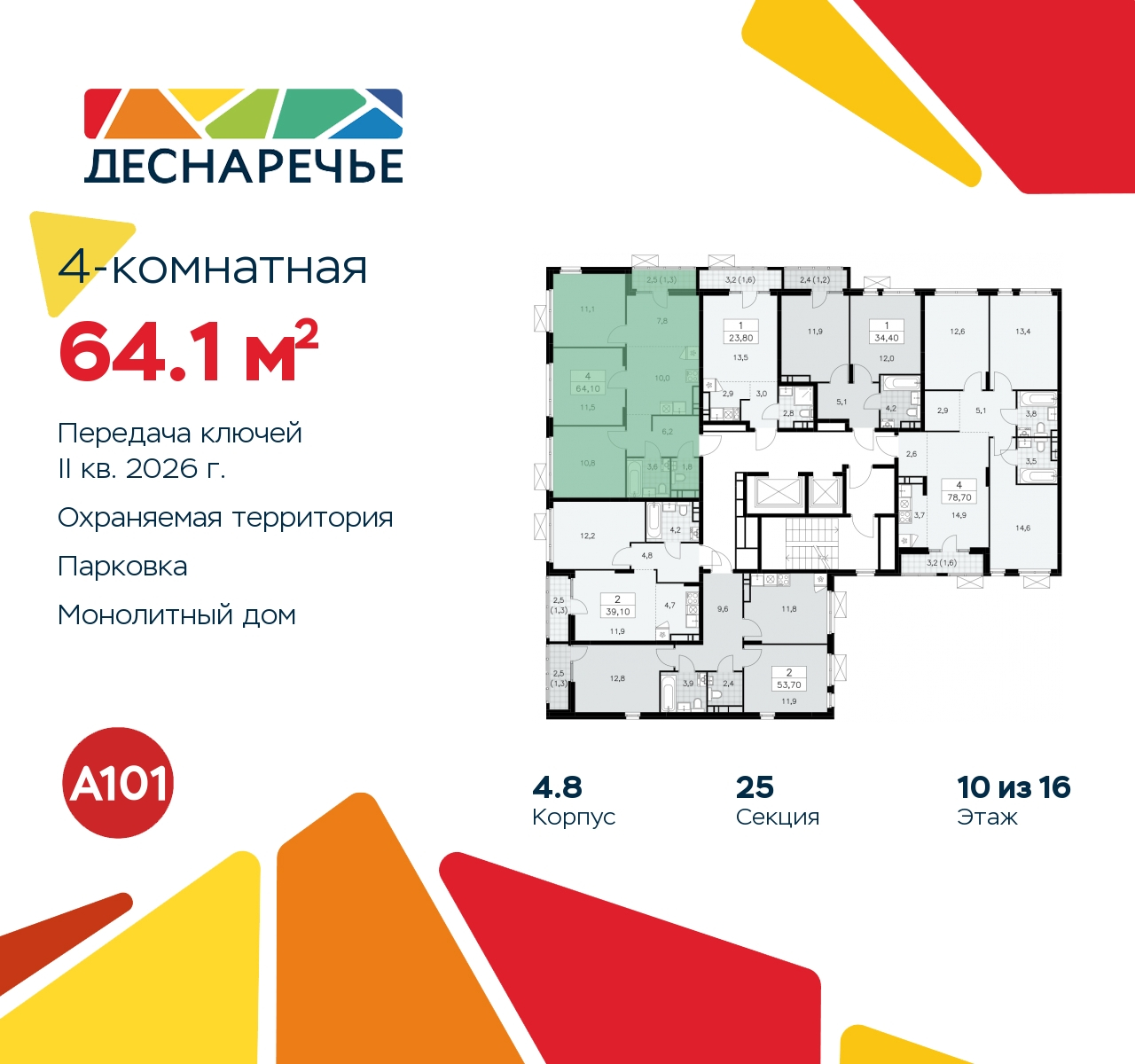 Просторная 4-комн. квартира с европланировкой и отделкой в ЖК "Деснаречье" на 10 этаже. Общая площадь: 64.1 кв.м., жилая: 41.2 кв.м., суммарная площадь гостиной-столовой с кухонной зоной: 17.8 кв.м. Европланировка, зона гостиной комнаты объединена с кухней. Угловая квартира, очень светлая, естественная вентиляция при открытии окон. В квартире одна лоджия, один совмещенный и один раздельный санузел. Высота потолков 2.99 м. Эта квартира будет сдана с дизайнеркой отделкой "под ключ". Специально для вас мы разработали несколько решений дизайнерской отделки. В отделке используются только современный высококлассные материалы, на все работы предоставляется гарантия. В таком случае вы оплачиваете отделку в сегодняшних ценах, а эту стоимость вы можете разнести в ипотечных платежах. Дом монолитный, многоподъездный, переменной этажности, от 7 до 16 этажей. Квартира находится в 4-й секции высотой 12 этажей в корпусе 4.8. На этаже 6 квартир. В подъезде 1 пассажирский и 1 грузовой лифт. Начало строительства - 3 квартал 2023 года. Окончание строительства - 2 квартал 2026 года. Оформление сделки по договору долевого участия. Артикул квартиры по базе застройщика 88К-4.8-1941. Масштабный проект "Деснаречье" на юго-западе Москвы, который включает три новых района («квартала»), объединённые общей идеей – воплотить в реальность мечты современных жителей столицы об интересном, комфортном и разноплановом городском пространстве в окружении рек и лесов, словно сошедших с полотен русских живописцев: - «Берег» оценят все, кому близка водная стихия: плеск волн, солнечные блики и прогулки вдоль тихого течения речи. - «Лес» утопает в зелени парков и лесов. Здесь соблюдён идеальный баланс загородного спокойствия и столичного комфорта. - «Парк», самый энергичный и яркий, отличается высокой концентрацией пространств для спорта и творчества. Жилой комплекс "Деснаречье" расположится в 12 км от МКАД по современному Калужскому шоссе. Внешний облик зданий соответствует современному стилю и стандартам, характерным и для других популярных проектов ГК «А101»: сочетание контрастных тонов, большое количество остекления, в котором отражается небо, гармония с природным окружением. Весь город - в вашем районе. Находиться на территории «15-минутного города» значит иметь всё необходимое для полноценной жизни в шаговой доступности. Маршруты в районе «Деснаречье» выстроены так, чтобы добраться до магазинов, парков, школ, салонов услуг и других объектов можно было всего за несколько минут пешком или на велосипеде. Двор закрытый от машин – это тишина, комфорт и безопасность, поэтому все машино-места (включая «семейные» и увеличенные, с возможностью установки роллетных шкафов) находятся в подземном паркинге. В паркинги можно спуститься на лифте из любого подъезда или по лестнице. Рядом с «Деснаречьем» в 2027 году планируется открытие станции метро «Десна», до которой будет удобно добраться пешком или на велосипеде. Дорога на автомобиле до перехватывающих парковок станций «Ольховая» и «Прокшино» займёт около 10 минут. В процессе реализации проекта будут появляться новые маршруты общественного транспорта по районам. Уже сейчас на Калужском шоссе развита сеть наземного транспорта: два десятка автобусов и маршрутных такси прибывают на остановки с интервалом 5–10 минут. (AQID02265243)