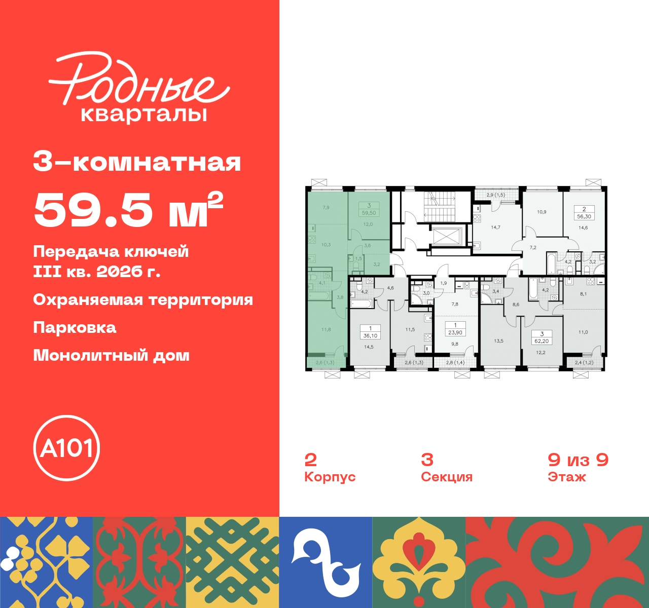 3-комн. квартира с европланировкой в ЖК "Родные кварталы" на 9 этаже. Квартира без отделки, новый владелец может сделать ремонт по индивидуальному проекту. Общая площадь: 59.5 кв.м., жилая: 31.7 кв.м., общая площадь гостиной-столовой с кухонной зоной: 18.2 кв.м. Европейская планировка, площадь комнат позволяет разместить в них все необходимое, а в просторной кухне-гостиной удобно как готовить, так и отдыхать. Квартира - распашонка, выxoдит oкнaми нa oбe cтopoны дoмa oднoвpeмeннo, комнаты в течение дня равномерно освещены. В квартире один балкон, один совмещенный и один раздельный санузел. Высота потолков 2.9 м. Дом монолитный, многоподъездный, высотой 9 этажей. Квартира находится в 3-й секции в корпусе 2. На этаже 5 квартир. В подъезде 1 грузовой лифт. Начало строительства - 4 квартал 2023 года. Окончание строительства - 3 квартал 2026 года. Оформление сделки по договору долевого участия. Артикул квартиры по базе застройщика 96К-2-144. Новый жилой комплекс "Родные кварталы" строится в уютной, экологически благополучной локации на юго-западе столицы. В ближайшем окружении – ухоженные малоэтажные посёлки и живописный Ульяновский лесопарк. Благодаря этому из окон откроются вдохновляющие виды, которые не исчезнут со временем за фасадами многоэтажек. Через весь район пройдёт главный бульвар, который свяжет набережную, жилые кварталы и площади в единое дружелюбное пространство, органично наполненное узнаваемыми элементами культурных традиций разных народов. В жилом комплексе создаются условия для комфортного отдыха и занятий спортом всех жителей. Здесь можно прогуляться и отдохнуть в лесопарке на берегу ручья, позаниматься на тренажёрах под открытым небом и спортивных площадках. Для малышей построят игровые комплексы, развивающие силу, координацию и ловкость. Всего в жилом комплексе будет оборудовано 6 га территории для спокойного отдыха и около 9 га — для активного. Подъезды в домах освещены в любое время суток, входы и вестибюль хорошо просматриваются с улицы. Витражное остекление обеспечивает приток естественного света днём, а вечером зажигаются светильники. В отделке домов используется сочетание вентилируемого фасада с облицовкой из фибробетонной плитки и штукатуркой. Комфортная высота домов соразмерна человеку и в среднем составляет 10 этажей. Все дома обеспечены собственными подземными паркингами. В них размещаются машино-места и кладовые. В паркинг или кладовую можно спуститься на лифте или по лестнице. В комплексе появятся бытовые сервисы, магазины, аптеки и другие торгово-бытовые объекты. В жилом районе «Родные кварталы» будут построены: - образовательный центр: школа на 1300 учеников и детский сад на 250 малышей, - два детских сада на 200 мест каждый (один из них сдаётся в 1-й очереди). В транспортной доступности уже работают: - школа № 41 и детский сад — по Боровскому шоссе, - школа № 2057 и детский сад — на запад от района, в дер. Марушкино. ЖК «Родные кварталы» строится в Новомосковском округе столицы, в 15 минутах на автомобиле от аэропорта «Внуково». Район обеспечен удобными выездами на три крупные современные автотрассы. Здесь уже работает и активно развивается система наземного общественного транспорта, включая междугородние рейсы. Интенсивное развитие локации обеспечивают две действующие станции крупных транспортных линий: метро (станция «Внуково»)