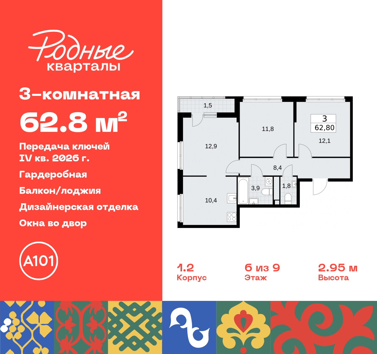 3-комн. квартира от застройщика с отделкой в ЖК "Родные кварталы" на 6 этаже. Общая площадь: 62.8 кв.м., жилая: 36.8 кв.м., площадь просторной кухни-столовой: 10.4 кв.м. Угловая квартира, идеально подойдет любителям тишины и панорамных видов. В квартире одна лоджия, один совмещенный и один раздельный санузел. Высота потолков 2.9 м. Имеется ниша под гардероб. Дом монолитный, многоподъездный, высотой 9 этажей. Квартира находится в 1-й секции в корпусе 1.2. На этаже 6 квартир. В подъезде 1 грузовой лифт. Начало строительства - 4 квартал 2023 года. Окончание строительства - 4 квартал 2026 года. Оформление сделки по договору долевого участия. Артикул квартиры по базе застройщика 96К-1.2-129. Новый жилой комплекс "Родные кварталы" строится в уютной, экологически благополучной локации на юго-западе столицы. В ближайшем окружении – ухоженные малоэтажные посёлки и живописный Ульяновский лесопарк. Благодаря этому из окон откроются вдохновляющие виды, которые не исчезнут со временем за фасадами многоэтажек. Через весь район пройдёт главный бульвар, который свяжет набережную, жилые кварталы и площади в единое дружелюбное пространство, органично наполненное узнаваемыми элементами культурных традиций разных народов. В жилом комплексе создаются условия для комфортного отдыха и занятий спортом всех жителей. Здесь можно прогуляться и отдохнуть в лесопарке на берегу ручья, позаниматься на тренажёрах под открытым небом и спортивных площадках. Для малышей построят игровые комплексы, развивающие силу, координацию и ловкость. Всего в жилом комплексе будет оборудовано 6 га территории для спокойного отдыха и около 9 га — для активного. Подъезды в домах освещены в любое время суток, входы и вестибюль хорошо просматриваются с улицы. Витражное остекление обеспечивает приток естественного света днём, а вечером зажигаются светильники. В отделке домов используется сочетание вентилируемого фасада с облицовкой из фибробетонной плитки и штукатуркой. Комфортная высота домов соразмерна человеку и в среднем составляет 10 этажей. Все дома обеспечены собственными подземными паркингами. В них размещаются машино-места и кладовые. В паркинг или кладовую можно спуститься на лифте или по лестнице. В комплексе появятся бытовые сервисы, магазины, аптеки и другие торгово-бытовые объекты. В жилом районе «Родные кварталы» будут построены: - образовательный центр: школа на 1300 учеников и детский сад на 250 малышей, - два детских сада на 200 мест каждый (один из них сдаётся в 1-й очереди). В транспортной доступности уже работают: - школа № 41 и детский сад — по Боровскому шоссе, - школа № 2057 и детский сад — на запад от района, в дер. Марушкино. ЖК «Родные кварталы» строится в Новомосковском округе столицы, в 15 минутах на автомобиле от аэропорта «Внуково». Район обеспечен удобными выездами на три крупные современные автотрассы. Здесь уже работает и активно развивается система наземного общественного транспорта, включая междугородние рейсы. Интенсивное развитие локации обеспечивают две действующие станции крупных транспортных линий: метро (станция «Внуково») и МЦД (станция «Толстопальцево»). (AQID02317736)