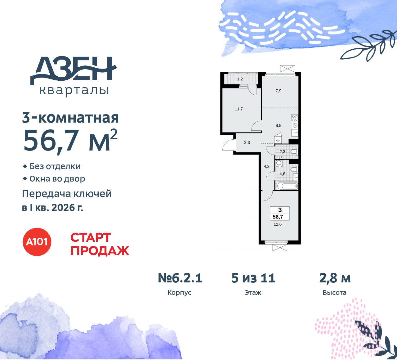 3-комн. квартира с европланировкой в ЖК "Дзен-кварталы" на 5 этаже. Квартира без отделки, после получения ключей можно делать ремонт. Общая площадь: 56.7 кв.м., жилая: 32.2 кв.м., общая площадь гостиной-столовой с кухонной зоной: 16.7 кв.м. Европейская планировка, зона гостиной комнаты объединена с кухней. Квартира - распашонка, без проходных комнат, окна выходят на paзные стороны дома. В квартире одна лоджия, один совмещенный и один раздельный санузел. Высота потолков 2.8 м. Эта квартира предлагается без отделки. Будут установлены стеклопакеты с повышенной тепло- и шумоизоляцией, в квартиру заведены все коммуникации. Вы сможете в полном объеме реализовать ваши идеи обустройства вашего комфортного дома. Дом монолитный, многоподъездный, переменной этажности, от 8 до 11 этажей. Квартира находится в 3-й секции высотой 11 этажей в корпусе 6.2.1. На этаже 5 квартир. В подъезде 1 пассажирский и 1 грузовой лифт. Начало строительства - 4 квартал 2023 года. Окончание строительства - 1 квартал 2026 года. Оформление сделки по договору долевого участия. Артикул квартиры по базе застройщика 41К-6.2.1-107. В шаговой доступности от жилого комплекса находятся станции метро (расстояние по прямой): «Новомосковская (Коммунарка)» (800 м), «Новомосковская» (800 м), «Потапово» (1.1 км), также недалеко от этого корпуса находятся станции метро: «Коммунарка», «Улица Горчакова», «Бульвар адмирала Ушакова», «Ольховая», «Бунинская аллея». Новый район «Дзен-кварталы» возводится на юго-западе столицы – вдоль береговой линии живописного Ивановского пруда и реки Варварки. В основе проекта – «сочетание несочетаемого», гармония простого и утончённого, природного и урбанистического – стиль Japandi, объединяющий скандинавскую функциональность и восточную созерцательность. В приятном соседстве с домами нового района живописный Ивановский пруд — его береговая линия проходит по территории «Дзен-кварталов». Здесь будет благоустроена набережная для отдыха жителей нового района — по авторскому проекту Группы компаний «А101». На территории района появятся два детских сада и крупный образовательный комплекс, в состав которого войдут детский сад и школа. Все они будут спроектированы на основе собственной концепции образовательной среды ГК «А101», разработанной экспертами в области педагогики, детский психологии и эргономики учебных пространств. Фасадные решения выполнены в современном архитектурном стиле, основанном на сочетании японского минимализма и скандинавской функциональности. Использованы природные оттенки спокойного японского пейзажа, материалы, имитирующие натуральные поверхности – штукатурка, облицовочная плитка разных размеров и текстур. Подобный стилистический подход делает пространство созерцательными и гармоничным. Для комфортного хранения габаритных и сезонных вещей на уровне подземного этажа спланированы удобные кладовые помещения. Доступ в них осуществляется на лифте. Отличная транспортная доступность. 2 станции метро, "Коммунарка" и "Потапово" в минутной шаговой доступности. Обстановки общественного транспорт, транспортные развязки и удобный выезд на трассу Солнцево – Бутово – Варшавское шоссе. (AQID02328411)
