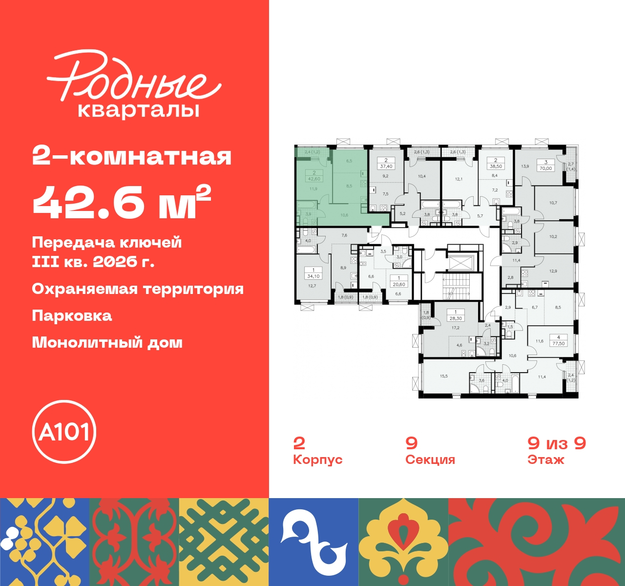 2-комн. квартира с европланировкой в ЖК "Родные кварталы" на 9 этаже. Квартира без отделки, после выдачи ключей можно делать ремонт. Общая площадь: 42.6 кв.м., жилая: 18.4 кв.м., общая площадь гостиной-столовой с кухонной зоной: 15 кв.м. Европейская планировка, кухня-гостиная - идеальный вариант для тех, кто любит часто принимать гостей. Комнаты изолированные, все окна выходят на одну сторону. В квартире одна лоджия, один совмещенный санузел. Высота потолков 2.9 м. Дом монолитный, многоподъездный, высотой 9 этажей. Квартира находится в 9-й секции в корпусе 2. На этаже 8 квартир. В подъезде 1 грузовой лифт. Начало строительства - 4 квартал 2023 года. Окончание строительства - 3 квартал 2026 года. Оформление сделки по договору долевого участия. Артикул квартиры по базе застройщика 96К-2-435. ПРЕДЛОЖЕНИЯ ОТ ЗАСТРОЙЩИКА В ОКТЯБРЕ 2025: Ипотека от 13,9 % для всех! На весь срок. "Семейная ипотека" вернулась. Ставка от 3,5 % на весь срок! Без удорожания! Выгодное ипотечное комбо: Ипотека от 2200 р./мес. и от 6 % после рождения ребёнка! Ипотека для всех "Держи пять!" - ставка 5 % на 2 года! *более подробную информацию по скидкам и акциям уточняйте в отделе продаж Новый жилой комплекс "Родные кварталы" строится в уютной, экологически благополучной локации на юго-западе столицы. В ближайшем окружении – ухоженные малоэтажные посёлки и живописный Ульяновский лесопарк. Благодаря этому из окон откроются вдохновляющие виды, которые не исчезнут со временем за фасадами многоэтажек. Через весь район пройдёт главный бульвар, который свяжет набережную, жилые кварталы и площади в единое дружелюбное пространство, органично наполненное узнаваемыми элементами культурных традиций разных народов. В жилом комплексе создаются условия для комфортного отдыха и занятий спортом всех жителей. Здесь можно прогуляться и отдохнуть в лесопарке на берегу ручья, позаниматься на тренажёрах под открытым небом и спортивных площадках. Для малышей построят игровые комплексы, развивающие силу, координацию и ловкость. Всего в жилом комплексе будет оборудовано 6 га территории для спокойного отдыха и около 9 га — для активного. Подъезды в домах освещены в любое время суток, входы и вестибюль хорошо просматриваются с улицы. Витражное остекление обеспечивает приток естественного света днём, а вечером зажигаются светильники. В отделке домов используется сочетание вентилируемого фасада с облицовкой из фибробетонной плитки и штукатуркой. Комфортная высота домов соразмерна человеку и в среднем составляет 10 этажей. Все дома обеспечены собственными подземными паркингами. В них размещаются машино-места и кладовые. В паркинг или кладовую можно спуститься на лифте или по лестнице. В комплексе появятся бытовые сервисы, магазины, аптеки и другие торгово-бытовые объекты. В жилом районе «Родные кварталы» будут построены: - образовательный центр: школа на 1300 учеников и детский сад на 250 малышей, - два детских сада на 200 мест каждый (один из них сдаётся в 1-й очереди). В транспортной доступности уже работают: - школа № 41 и детский сад — по Боровскому шоссе, - школа № 2057 и детский сад — на запад от района, в дер. Марушкино. ЖК «Родные кварталы» строится в Новомосковском округе столицы, в 15 минутах на автомобиле от аэропорта «Внуково». Район обеспечен удобными выездами на три крупные современные автотрассы. Здесь уже работает и активн