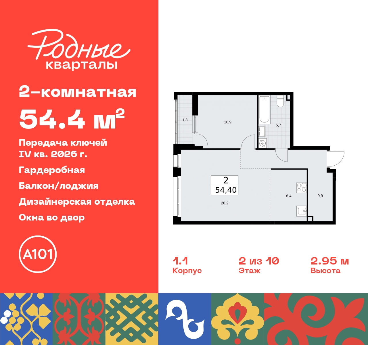 Просторная 2-комн. квартира с европланировкой и отделкой в ЖК "Родные кварталы" на 2 этаже. Общая площадь: 54.4 кв.м., жилая: 31.1 кв.м., суммарная площадь гостиной-столовой с кухонной зоной: 26.6 кв.м. Европланировка, кухня и гостиная объединены в одно просторное помещение. Комнаты изолированные, все окна выходят на одну сторону. В квартире одна лоджия, один совмещенный санузел. Высота потолков 2.9 м. Имеется ниша под гардероб. Квартира находится в корпусе 1.1. Дом монолитный, одноподъездный, высотой 10 этажей. На этаже 11 квартир. В подъезде 1 пассажирский и 1 грузовой лифт. Начало строительства - 4 квартал 2023 года. Окончание строительства - 4 квартал 2026 года. Оформление сделки по договору долевого участия. Артикул квартиры по базе застройщика 96К-1.1-7. ПРЕДЛОЖЕНИЯ ОТ ЗАСТРОЙЩИКА В ОКТЯБРЕ 2025: Ипотека от 13,9 % для всех! На весь срок. "Семейная ипотека" вернулась. Ставка от 3,5 % на весь срок! Без удорожания! Выгодное ипотечное комбо: Ипотека от 2200 р./мес. и от 6 % после рождения ребёнка! Ипотека для всех "Держи пять!" - ставка 5 % на 2 года! *более подробную информацию по скидкам и акциям уточняйте в отделе продаж Новый жилой комплекс "Родные кварталы" строится в уютной, экологически благополучной локации на юго-западе столицы. В ближайшем окружении – ухоженные малоэтажные посёлки и живописный Ульяновский лесопарк. Благодаря этому из окон откроются вдохновляющие виды, которые не исчезнут со временем за фасадами многоэтажек. Через весь район пройдёт главный бульвар, который свяжет набережную, жилые кварталы и площади в единое дружелюбное пространство, органично наполненное узнаваемыми элементами культурных традиций разных народов. В жилом комплексе создаются условия для комфортного отдыха и занятий спортом всех жителей. Здесь можно прогуляться и отдохнуть в лесопарке на берегу ручья, позаниматься на тренажёрах под открытым небом и спортивных площадках. Для малышей построят игровые комплексы, развивающие силу, координацию и ловкость. Всего в жилом комплексе будет оборудовано 6 га территории для спокойного отдыха и около 9 га — для активного. Подъезды в домах освещены в любое время суток, входы и вестибюль хорошо просматриваются с улицы. Витражное остекление обеспечивает приток естественного света днём, а вечером зажигаются светильники. В отделке домов используется сочетание вентилируемого фасада с облицовкой из фибробетонной плитки и штукатуркой. Комфортная высота домов соразмерна человеку и в среднем составляет 10 этажей. Все дома обеспечены собственными подземными паркингами. В них размещаются машино-места и кладовые. В паркинг или кладовую можно спуститься на лифте или по лестнице. В комплексе появятся бытовые сервисы, магазины, аптеки и другие торгово-бытовые объекты. В жилом районе «Родные кварталы» будут построены: - образовательный центр: школа на 1300 учеников и детский сад на 250 малышей, - два детских сада на 200 мест каждый (один из них сдаётся в 1-й очереди). В транспортной доступности уже работают: - школа № 41 и детский сад — по Боровскому шоссе, - школа № 2057 и детский сад — на запад от района, в дер. Марушкино. ЖК «Родные кварталы» строится в Новомосковском округе столицы, в 15 минутах на автомобиле от аэропорта «Внуково». Район обеспечен удобными выездами на три крупные современные автотрассы. Здесь уже работает и активно развивается система наземно