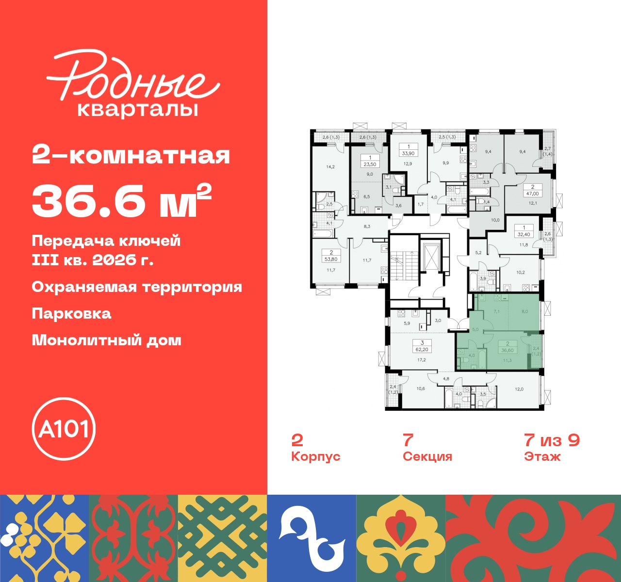 Продается 2-комн. квартира с европланировкой в ЖК "Родные кварталы" на 7 этаже. Квартира без отделки, полностью готова к чистовой отделке и дальнейшему ремонту. Общая площадь: 36.6 кв.м., жилая: 19.3 кв.м., суммарная площадь гостиной-столовой с кухонной зоной: 15.1 кв.м. Европланировка, кухня и гостиная объединены в одно просторное помещение. Комнаты изолированные, все окна выходят на одну сторону. В квартире одна лоджия, один совмещенный санузел. Высота потолков 2.9 м. Имеется ниша под гардероб. Дом монолитный, многоподъездный, высотой 9 этажей. Квартира находится в 7-й секции в корпусе 2. На этаже 7 квартир. В подъезде 1 грузовой лифт. Начало строительства - 4 квартал 2023 года. Окончание строительства - 3 квартал 2026 года. Оформление сделки по договору долевого участия. Артикул квартиры по базе застройщика 96К-2-321. ПРЕДЛОЖЕНИЯ ОТ ЗАСТРОЙЩИКА В ОКТЯБРЕ 2025: Ипотека от 13,9 % для всех! На весь срок. "Семейная ипотека" вернулась. Ставка от 3,5 % на весь срок! Без удорожания! Выгодное ипотечное комбо: Ипотека от 2200 р./мес. и от 6 % после рождения ребёнка! Ипотека для всех "Держи пять!" - ставка 5 % на 2 года! *более подробную информацию по скидкам и акциям уточняйте в отделе продаж Новый жилой комплекс "Родные кварталы" строится в уютной, экологически благополучной локации на юго-западе столицы. В ближайшем окружении – ухоженные малоэтажные посёлки и живописный Ульяновский лесопарк. Благодаря этому из окон откроются вдохновляющие виды, которые не исчезнут со временем за фасадами многоэтажек. Через весь район пройдёт главный бульвар, который свяжет набережную, жилые кварталы и площади в единое дружелюбное пространство, органично наполненное узнаваемыми элементами культурных традиций разных народов. В жилом комплексе создаются условия для комфортного отдыха и занятий спортом всех жителей. Здесь можно прогуляться и отдохнуть в лесопарке на берегу ручья, позаниматься на тренажёрах под открытым небом и спортивных площадках. Для малышей построят игровые комплексы, развивающие силу, координацию и ловкость. Всего в жилом комплексе будет оборудовано 6 га территории для спокойного отдыха и около 9 га — для активного. Подъезды в домах освещены в любое время суток, входы и вестибюль хорошо просматриваются с улицы. Витражное остекление обеспечивает приток естественного света днём, а вечером зажигаются светильники. В отделке домов используется сочетание вентилируемого фасада с облицовкой из фибробетонной плитки и штукатуркой. Комфортная высота домов соразмерна человеку и в среднем составляет 10 этажей. Все дома обеспечены собственными подземными паркингами. В них размещаются машино-места и кладовые. В паркинг или кладовую можно спуститься на лифте или по лестнице. В комплексе появятся бытовые сервисы, магазины, аптеки и другие торгово-бытовые объекты. В жилом районе «Родные кварталы» будут построены: - образовательный центр: школа на 1300 учеников и детский сад на 250 малышей, - два детских сада на 200 мест каждый (один из них сдаётся в 1-й очереди). В транспортной доступности уже работают: - школа № 41 и детский сад — по Боровскому шоссе, - школа № 2057 и детский сад — на запад от района, в дер. Марушкино. ЖК «Родные кварталы» строится в Новомосковском округе столицы, в 15 минутах на автомобиле от аэропорта «Внуково». Район обеспечен удобными выездами на три крупные современные автот