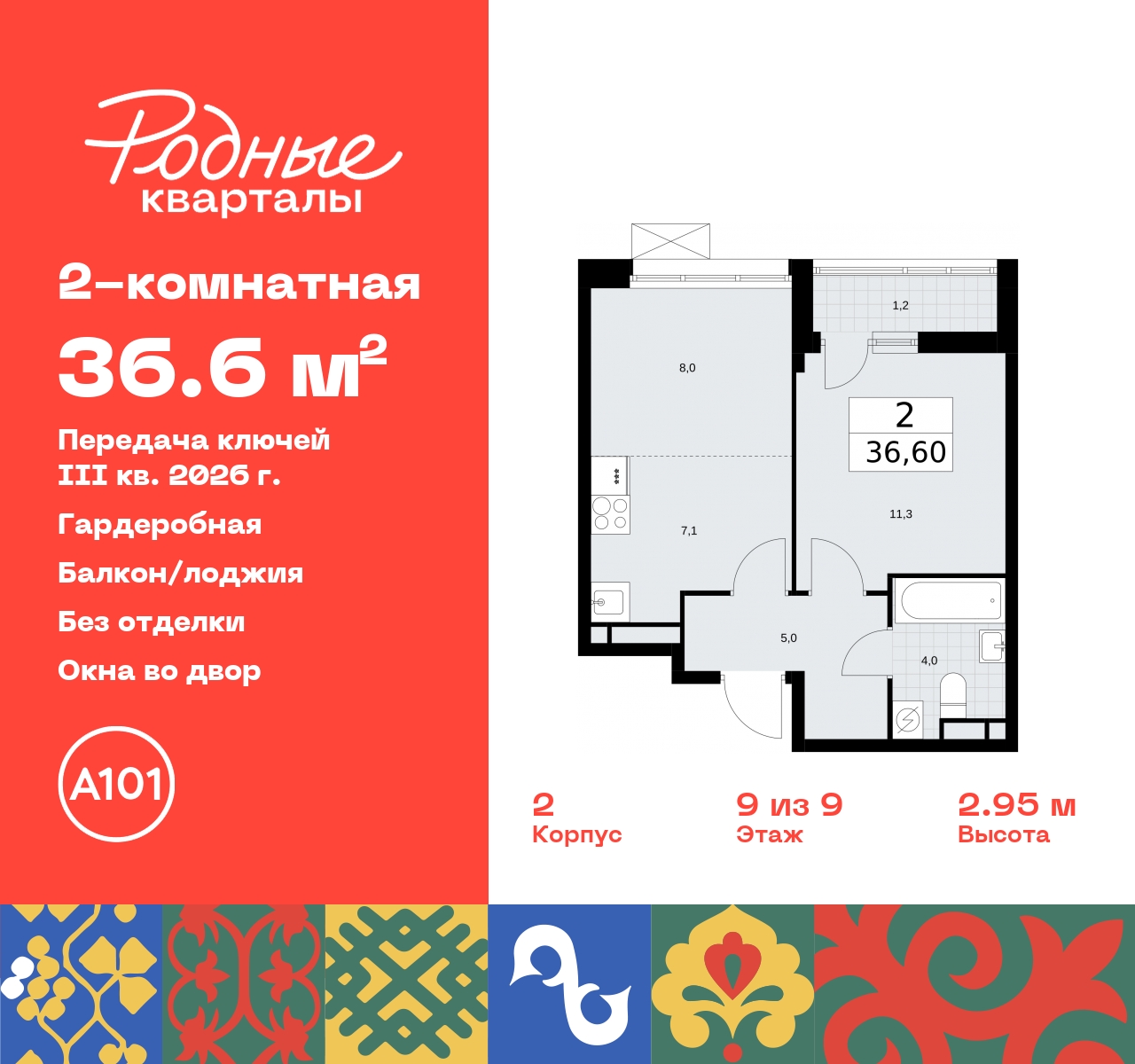 2-комн. квартира с европланировкой от застройщика в ЖК "Родные кварталы" на 9 этаже. Квартира без отделки, полностью готова к чистовой отделке и дальнейшему ремонту. Общая площадь: 36.6 кв.м., жилая: 19.3 кв.м., суммарная площадь гостиной-столовой с кухонной зоной: 15.1 кв.м. Европейская планировка, кухня-гостиная - идеальный вариант для тех, кто любит часто принимать гостей. Комнаты изолированные, все окна выходят на одну сторону. В квартире одна лоджия, один совмещенный санузел. Высота потолков 2.9 м. Имеется ниша под гардероб. Дом монолитный, многоподъездный, высотой 9 этажей. Квартира находится в 7-й секции в корпусе 2. На этаже 7 квартир. В подъезде 1 грузовой лифт. Начало строительства - 4 квартал 2023 года. Окончание строительства - 3 квартал 2026 года. Оформление сделки по договору долевого участия. Артикул квартиры по базе застройщика 96К-2-335. ПРЕДЛОЖЕНИЯ ОТ ЗАСТРОЙЩИКА В ОКТЯБРЕ 2025: Ипотека от 13,9 % для всех! На весь срок. "Семейная ипотека" вернулась. Ставка от 3,5 % на весь срок! Без удорожания! Выгодное ипотечное комбо: Ипотека от 2200 р./мес. и от 6 % после рождения ребёнка! Ипотека для всех "Держи пять!" - ставка 5 % на 2 года! *более подробную информацию по скидкам и акциям уточняйте в отделе продаж Новый жилой комплекс "Родные кварталы" строится в уютной, экологически благополучной локации на юго-западе столицы. В ближайшем окружении – ухоженные малоэтажные посёлки и живописный Ульяновский лесопарк. Благодаря этому из окон откроются вдохновляющие виды, которые не исчезнут со временем за фасадами многоэтажек. Через весь район пройдёт главный бульвар, который свяжет набережную, жилые кварталы и площади в единое дружелюбное пространство, органично наполненное узнаваемыми элементами культурных традиций разных народов. В жилом комплексе создаются условия для комфортного отдыха и занятий спортом всех жителей. Здесь можно прогуляться и отдохнуть в лесопарке на берегу ручья, позаниматься на тренажёрах под открытым небом и спортивных площадках. Для малышей построят игровые комплексы, развивающие силу, координацию и ловкость. Всего в жилом комплексе будет оборудовано 6 га территории для спокойного отдыха и около 9 га — для активного. Подъезды в домах освещены в любое время суток, входы и вестибюль хорошо просматриваются с улицы. Витражное остекление обеспечивает приток естественного света днём, а вечером зажигаются светильники. В отделке домов используется сочетание вентилируемого фасада с облицовкой из фибробетонной плитки и штукатуркой. Комфортная высота домов соразмерна человеку и в среднем составляет 10 этажей. Все дома обеспечены собственными подземными паркингами. В них размещаются машино-места и кладовые. В паркинг или кладовую можно спуститься на лифте или по лестнице. В комплексе появятся бытовые сервисы, магазины, аптеки и другие торгово-бытовые объекты. В жилом районе «Родные кварталы» будут построены: - образовательный центр: школа на 1300 учеников и детский сад на 250 малышей, - два детских сада на 200 мест каждый (один из них сдаётся в 1-й очереди). В транспортной доступности уже работают: - школа № 41 и детский сад — по Боровскому шоссе, - школа № 2057 и детский сад — на запад от района, в дер. Марушкино. ЖК «Родные кварталы» строится в Новомосковском округе столицы, в 15 минутах на автомобиле от аэропорта «Внуково». Район обеспечен удобными выездами 