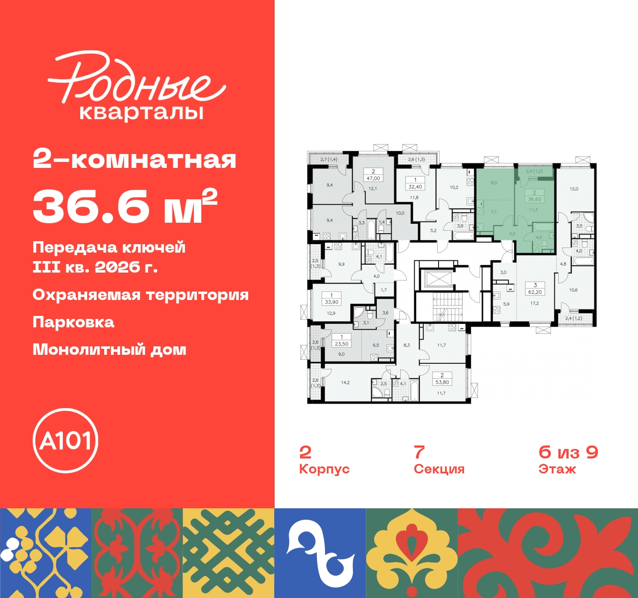 Просторная 2-комн. квартира с европланировкой в ЖК "Родные кварталы" на 6 этаже. Квартира без отделки, после получения ключей можно делать ремонт. Общая площадь: 36.6 кв.м., жилая: 19.3 кв.м., общая площадь гостиной-столовой с кухонной зоной: 15.1 кв.м. Европейская планировка, кухня-гостиная - идеальный вариант для тех, кто любит часто принимать гостей. Комнаты изолированные, все окна выходят на одну сторону. В квартире одна лоджия, один совмещенный санузел. Высота потолков 2.9 м. Имеется ниша под гардероб. Дом монолитный, многоподъездный, высотой 9 этажей. Квартира находится в 7-й секции в корпусе 2. На этаже 7 квартир. В подъезде 1 грузовой лифт. Начало строительства - 4 квартал 2023 года. Окончание строительства - 3 квартал 2026 года. Оформление сделки по договору долевого участия. Артикул квартиры по базе застройщика 96К-2-314. ПРЕДЛОЖЕНИЯ ОТ ЗАСТРОЙЩИКА В ОКТЯБРЕ 2025: Ипотека от 13,9 % для всех! На весь срок. "Семейная ипотека" вернулась. Ставка от 3,5 % на весь срок! Без удорожания! Выгодное ипотечное комбо: Ипотека от 2200 р./мес. и от 6 % после рождения ребёнка! Ипотека для всех "Держи пять!" - ставка 5 % на 2 года! *более подробную информацию по скидкам и акциям уточняйте в отделе продаж Новый жилой комплекс "Родные кварталы" строится в уютной, экологически благополучной локации на юго-западе столицы. В ближайшем окружении – ухоженные малоэтажные посёлки и живописный Ульяновский лесопарк. Благодаря этому из окон откроются вдохновляющие виды, которые не исчезнут со временем за фасадами многоэтажек. Через весь район пройдёт главный бульвар, который свяжет набережную, жилые кварталы и площади в единое дружелюбное пространство, органично наполненное узнаваемыми элементами культурных традиций разных народов. В жилом комплексе создаются условия для комфортного отдыха и занятий спортом всех жителей. Здесь можно прогуляться и отдохнуть в лесопарке на берегу ручья, позаниматься на тренажёрах под открытым небом и спортивных площадках. Для малышей построят игровые комплексы, развивающие силу, координацию и ловкость. Всего в жилом комплексе будет оборудовано 6 га территории для спокойного отдыха и около 9 га — для активного. Подъезды в домах освещены в любое время суток, входы и вестибюль хорошо просматриваются с улицы. Витражное остекление обеспечивает приток естественного света днём, а вечером зажигаются светильники. В отделке домов используется сочетание вентилируемого фасада с облицовкой из фибробетонной плитки и штукатуркой. Комфортная высота домов соразмерна человеку и в среднем составляет 10 этажей. Все дома обеспечены собственными подземными паркингами. В них размещаются машино-места и кладовые. В паркинг или кладовую можно спуститься на лифте или по лестнице. В комплексе появятся бытовые сервисы, магазины, аптеки и другие торгово-бытовые объекты. В жилом районе «Родные кварталы» будут построены: - образовательный центр: школа на 1300 учеников и детский сад на 250 малышей, - два детских сада на 200 мест каждый (один из них сдаётся в 1-й очереди). В транспортной доступности уже работают: - школа № 41 и детский сад — по Боровскому шоссе, - школа № 2057 и детский сад — на запад от района, в дер. Марушкино. ЖК «Родные кварталы» строится в Новомосковском округе столицы, в 15 минутах на автомобиле от аэропорта «Внуково». Район обеспечен удобными выездами на три крупные современ