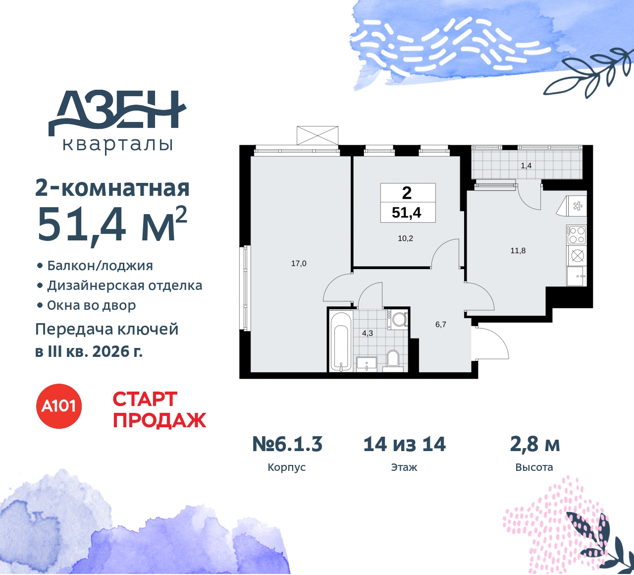 2-комн. квартира от застройщика с отделкой в ЖК "Дзен-кварталы" на 14 этаже. Общая площадь: 51.4 кв.м., жилая: 27.2 кв.м., площадь просторной кухни-столовой: 11.8 кв.м. Квартира угловая, очень светлая, естественная вентиляция при открытии окон. В квартире одна лоджия, один совмещенный санузел. Высота потолков 2.8 м. Дом монолитный, многоподъездный, переменной этажности, от 9 до 14 этажей. Квартира находится в 1-й секции высотой 14 этажей в корпусе 6.1.3. На этаже 5 квартир. В подъезде 1 пассажирский и 1 грузовой лифт. Начало строительства - 4 квартал 2023 года. Окончание строительства - 3 квартал 2026 года. Оформление сделки по договору долевого участия. Артикул квартиры по базе застройщика 41К-6.1.3-505. В шаговой доступности от жилого комплекса находятся станции метро (расстояние по прямой): «Новомосковская (Коммунарка)» (800 м), «Новомосковская» (800 м), «Потапово» (900 м), также недалеко от этого корпуса находятся станции метро: «Коммунарка», «Улица Горчакова», «Бульвар адмирала Ушакова», «Ольховая», «Бунинская аллея». ПРЕДЛОЖЕНИЯ ОТ ЗАСТРОЙЩИКА В ОКТЯБРЕ 2025: Ипотека от 13,9 % для всех! На весь срок. "Семейная ипотека" вернулась. Ставка от 3,5 % на весь срок! Без удорожания! Выгодное ипотечное комбо: Ипотека от 2200 р./мес. и от 6 % после рождения ребёнка! Ипотека для всех "Держи пять!" - ставка 5 % на 2 года! *более подробную информацию по скидкам и акциям уточняйте в отделе продаж Новый район «Дзен-кварталы» возводится на юго-западе столицы – вдоль береговой линии живописного Ивановского пруда и реки Варварки. В основе проекта – «сочетание несочетаемого», гармония простого и утончённого, природного и урбанистического – стиль Japandi, объединяющий скандинавскую функциональность и восточную созерцательность. В приятном соседстве с домами нового района живописный Ивановский пруд — его береговая линия проходит по территории «Дзен-кварталов». Здесь будет благоустроена набережная для отдыха жителей нового района — по авторскому проекту Группы компаний «А101». На территории района появятся два детских сада и крупный образовательный комплекс, в состав которого войдут детский сад и школа. Все они будут спроектированы на основе собственной концепции образовательной среды ГК «А101», разработанной экспертами в области педагогики, детский психологии и эргономики учебных пространств. Фасадные решения выполнены в современном архитектурном стиле, основанном на сочетании японского минимализма и скандинавской функциональности. Использованы природные оттенки спокойного японского пейзажа, материалы, имитирующие натуральные поверхности – штукатурка, облицовочная плитка разных размеров и текстур. Подобный стилистический подход делает пространство созерцательными и гармоничным. Для комфортного хранения габаритных и сезонных вещей на уровне подземного этажа спланированы удобные кладовые помещения. Доступ в них осуществляется на лифте. Отличная транспортная доступность. 2 станции метро, "Коммунарка" и "Потапово" в минутной шаговой доступности. Обстановки общественного транспорт, транспортные развязки и удобный выезд на трассу Солнцево – Бутово – Варшавское шоссе. (AQID02327440)