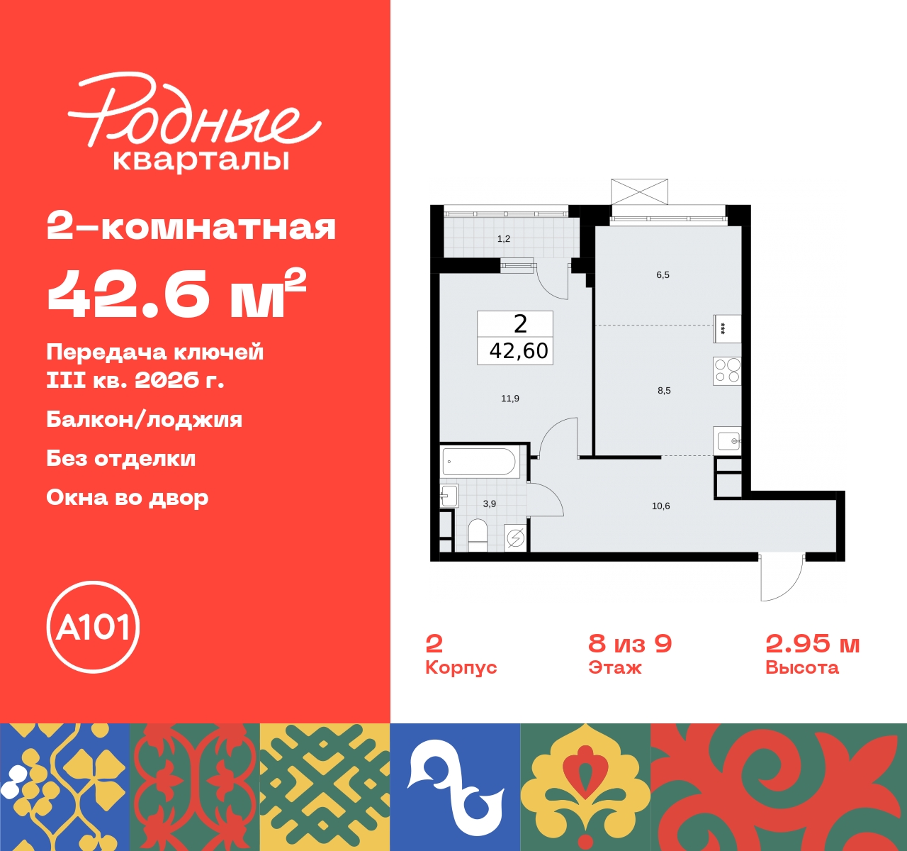 Двухкомнатная квартира с европланировкой в ЖК "Родные кварталы" на 8 этаже. Квартира без отделки, полностью готова к чистовой отделке и дальнейшему ремонту. Общая площадь: 42.6 кв.м., жилая: 18.4 кв.м., суммарная площадь гостиной-столовой с кухонной зоной: 15 кв.м. Европланировка, кухня-гостиная - идеальный вариант для тех, кто любит часто принимать гостей. Комнаты изолированные, все окна выходят на одну сторону. В квартире одна лоджия, один совмещенный санузел. Высота потолков 2.9 м. Дом монолитный, многоподъездный, высотой 9 этажей. Квартира находится в 9-й секции в корпусе 2. На этаже 8 квартир. В подъезде 1 грузовой лифт. Начало строительства - 4 квартал 2023 года. Окончание строительства - 3 квартал 2026 года. Оформление сделки по договору долевого участия. Артикул квартиры по базе застройщика 96К-2-427. ПРЕДЛОЖЕНИЯ ОТ ЗАСТРОЙЩИКА В ОКТЯБРЕ 2025: Ипотека от 13,9 % для всех! На весь срок. "Семейная ипотека" вернулась. Ставка от 3,5 % на весь срок! Без удорожания! Выгодное ипотечное комбо: Ипотека от 2200 р./мес. и от 6 % после рождения ребёнка! Ипотека для всех "Держи пять!" - ставка 5 % на 2 года! *более подробную информацию по скидкам и акциям уточняйте в отделе продаж Новый жилой комплекс "Родные кварталы" строится в уютной, экологически благополучной локации на юго-западе столицы. В ближайшем окружении – ухоженные малоэтажные посёлки и живописный Ульяновский лесопарк. Благодаря этому из окон откроются вдохновляющие виды, которые не исчезнут со временем за фасадами многоэтажек. Через весь район пройдёт главный бульвар, который свяжет набережную, жилые кварталы и площади в единое дружелюбное пространство, органично наполненное узнаваемыми элементами культурных традиций разных народов. В жилом комплексе создаются условия для комфортного отдыха и занятий спортом всех жителей. Здесь можно прогуляться и отдохнуть в лесопарке на берегу ручья, позаниматься на тренажёрах под открытым небом и спортивных площадках. Для малышей построят игровые комплексы, развивающие силу, координацию и ловкость. Всего в жилом комплексе будет оборудовано 6 га территории для спокойного отдыха и около 9 га — для активного. Подъезды в домах освещены в любое время суток, входы и вестибюль хорошо просматриваются с улицы. Витражное остекление обеспечивает приток естественного света днём, а вечером зажигаются светильники. В отделке домов используется сочетание вентилируемого фасада с облицовкой из фибробетонной плитки и штукатуркой. Комфортная высота домов соразмерна человеку и в среднем составляет 10 этажей. Все дома обеспечены собственными подземными паркингами. В них размещаются машино-места и кладовые. В паркинг или кладовую можно спуститься на лифте или по лестнице. В комплексе появятся бытовые сервисы, магазины, аптеки и другие торгово-бытовые объекты. В жилом районе «Родные кварталы» будут построены: - образовательный центр: школа на 1300 учеников и детский сад на 250 малышей, - два детских сада на 200 мест каждый (один из них сдаётся в 1-й очереди). В транспортной доступности уже работают: - школа № 41 и детский сад — по Боровскому шоссе, - школа № 2057 и детский сад — на запад от района, в дер. Марушкино. ЖК «Родные кварталы» строится в Новомосковском округе столицы, в 15 минутах на автомобиле от аэропорта «Внуково». Район обеспечен удобными выездами на три крупные современные автотрассы. Здес