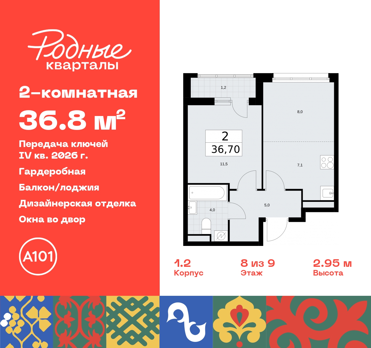 Двухкомнатная квартира с европланировкой и отделкой в ЖК "Родные кварталы" на 8 этаже. Общая площадь: 36.8 кв.м., жилая: 19.5 кв.м., общая площадь гостиной-столовой с кухонной зоной: 15.1 кв.м. Европейская планировка, зона гостиной комнаты объединена с кухней. Комнаты изолированные, все окна выходят на одну сторону. В квартире одна лоджия, один совмещенный санузел. Высота потолков 2.9 м. Имеется ниша под гардероб. Дом монолитный, многоподъездный, высотой 9 этажей. Квартира находится в 5-й секции в корпусе 1.2. На этаже 7 квартир. В подъезде 1 грузовой лифт. Начало строительства - 4 квартал 2023 года. Окончание строительства - 4 квартал 2026 года. Оформление сделки по договору долевого участия. Артикул квартиры по базе застройщика 96К-1.2-335. ПРЕДЛОЖЕНИЯ ОТ ЗАСТРОЙЩИКА В ОКТЯБРЕ 2025: Ипотека от 13,9 % для всех! На весь срок. "Семейная ипотека" вернулась. Ставка от 3,5 % на весь срок! Без удорожания! Выгодное ипотечное комбо: Ипотека от 2200 р./мес. и от 6 % после рождения ребёнка! Ипотека для всех "Держи пять!" - ставка 5 % на 2 года! *более подробную информацию по скидкам и акциям уточняйте в отделе продаж Новый жилой комплекс "Родные кварталы" строится в уютной, экологически благополучной локации на юго-западе столицы. В ближайшем окружении – ухоженные малоэтажные посёлки и живописный Ульяновский лесопарк. Благодаря этому из окон откроются вдохновляющие виды, которые не исчезнут со временем за фасадами многоэтажек. Через весь район пройдёт главный бульвар, который свяжет набережную, жилые кварталы и площади в единое дружелюбное пространство, органично наполненное узнаваемыми элементами культурных традиций разных народов. В жилом комплексе создаются условия для комфортного отдыха и занятий спортом всех жителей. Здесь можно прогуляться и отдохнуть в лесопарке на берегу ручья, позаниматься на тренажёрах под открытым небом и спортивных площадках. Для малышей построят игровые комплексы, развивающие силу, координацию и ловкость. Всего в жилом комплексе будет оборудовано 6 га территории для спокойного отдыха и около 9 га — для активного. Подъезды в домах освещены в любое время суток, входы и вестибюль хорошо просматриваются с улицы. Витражное остекление обеспечивает приток естественного света днём, а вечером зажигаются светильники. В отделке домов используется сочетание вентилируемого фасада с облицовкой из фибробетонной плитки и штукатуркой. Комфортная высота домов соразмерна человеку и в среднем составляет 10 этажей. Все дома обеспечены собственными подземными паркингами. В них размещаются машино-места и кладовые. В паркинг или кладовую можно спуститься на лифте или по лестнице. В комплексе появятся бытовые сервисы, магазины, аптеки и другие торгово-бытовые объекты. В жилом районе «Родные кварталы» будут построены: - образовательный центр: школа на 1300 учеников и детский сад на 250 малышей, - два детских сада на 200 мест каждый (один из них сдаётся в 1-й очереди). В транспортной доступности уже работают: - школа № 41 и детский сад — по Боровскому шоссе, - школа № 2057 и детский сад — на запад от района, в дер. Марушкино. ЖК «Родные кварталы» строится в Новомосковском округе столицы, в 15 минутах на автомобиле от аэропорта «Внуково». Район обеспечен удобными выездами на три крупные современные автотрассы. Здесь уже работает и активно развивается система наземного общественного 