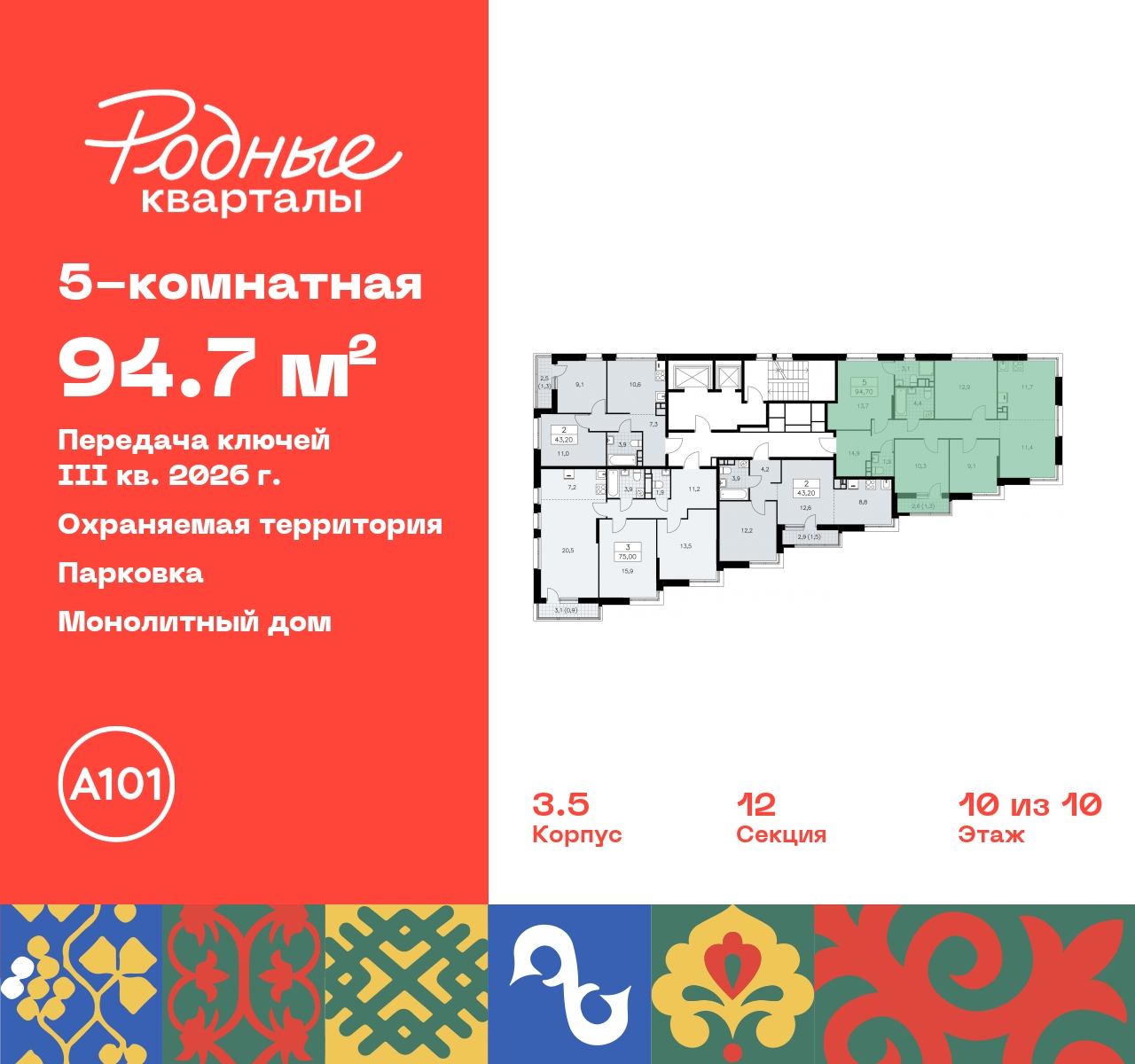 5-комн. квартира с европланировкой от застройщика в ЖК "Родные кварталы" на 10 этаже. Квартира без отделки, после оформления собственности можно делать ремонт. Общая площадь: 94.7 кв.м., жилая: 57.4 кв.м., суммарная площадь гостиной-столовой с кухонной зоной: 23.1 кв.м. Европейская планировка, зона гостиной комнаты объединена с кухней. Квартира без проходных комнат, окна выходят нa три cтopoны дома. В квартире один балкон, два совмещенных и один раздельный санузел. Высота потолков 2.95 м. Квартира находится в корпусе 3.5. Дом монолитный, одноподъездный, высотой 10 этажей. На этаже 4 квартиры. В подъезде 1 пассажирский и 1 грузовой лифт. Начало строительства - 2 квартал 2024 года. Окончание строительства - 3 квартал 2026 года. Оформление сделки по договору долевого участия. Артикул квартиры по базе застройщика 96К-3.5-567. ПРЕДЛОЖЕНИЯ ОТ ЗАСТРОЙЩИКА В ОКТЯБРЕ 2025: Ипотека от 13,9 % для всех! На весь срок. "Семейная ипотека" вернулась. Ставка от 3,5 % на весь срок! Без удорожания! Выгодное ипотечное комбо: Ипотека от 2200 р./мес. и от 6 % после рождения ребёнка! Ипотека для всех "Держи пять!" - ставка 5 % на 2 года! *более подробную информацию по скидкам и акциям уточняйте в отделе продаж Новый жилой комплекс "Родные кварталы" строится в уютной, экологически благополучной локации на юго-западе столицы. В ближайшем окружении – ухоженные малоэтажные посёлки и живописный Ульяновский лесопарк. Благодаря этому из окон откроются вдохновляющие виды, которые не исчезнут со временем за фасадами многоэтажек. Через весь район пройдёт главный бульвар, который свяжет набережную, жилые кварталы и площади в единое дружелюбное пространство, органично наполненное узнаваемыми элементами культурных традиций разных народов. В жилом комплексе создаются условия для комфортного отдыха и занятий спортом всех жителей. Здесь можно прогуляться и отдохнуть в лесопарке на берегу ручья, позаниматься на тренажёрах под открытым небом и спортивных площадках. Для малышей построят игровые комплексы, развивающие силу, координацию и ловкость. Всего в жилом комплексе будет оборудовано 6 га территории для спокойного отдыха и около 9 га — для активного. Подъезды в домах освещены в любое время суток, входы и вестибюль хорошо просматриваются с улицы. Витражное остекление обеспечивает приток естественного света днём, а вечером зажигаются светильники. В отделке домов используется сочетание вентилируемого фасада с облицовкой из фибробетонной плитки и штукатуркой. Комфортная высота домов соразмерна человеку и в среднем составляет 10 этажей. Все дома обеспечены собственными подземными паркингами. В них размещаются машино-места и кладовые. В паркинг или кладовую можно спуститься на лифте или по лестнице. В комплексе появятся бытовые сервисы, магазины, аптеки и другие торгово-бытовые объекты. В жилом районе «Родные кварталы» будут построены: - образовательный центр: школа на 1300 учеников и детский сад на 250 малышей, - два детских сада на 200 мест каждый (один из них сдаётся в 1-й очереди). В транспортной доступности уже работают: - школа № 41 и детский сад — по Боровскому шоссе, - школа № 2057 и детский сад — на запад от района, в дер. Марушкино. ЖК «Родные кварталы» строится в Новомосковском округе столицы, в 15 минутах на автомобиле от аэропорта «Внуково». Район обеспечен удобными выездами на три крупные современные автотрасс