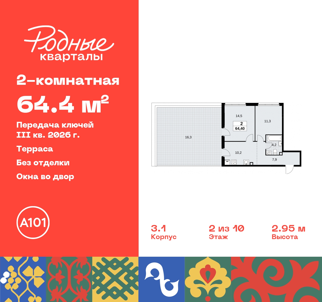 Продается 2-комн. квартира в ЖК "Родные кварталы" на 2 этаже. Квартира без отделки, новый собственник может сделать ремонт по своему дизайн-проекту. Общая площадь: 64.4 кв.м., жилая: 25.8 кв.м., площадь просторной кухни-столовой: 10.2 кв.м. Угловая квартира, идеально подойдет любителям тишины и панорамных видов. В квартире один балкон, один совмещенный санузел. Терраса представляет собой роскошную зону отдыха для проведение вечеров в кругу семьи и друзей или организация вечеринок. Высота потолков 2.95 м. Дом монолитный, черырехподъездный, высотой 10 этажей. Квартира находится в 1-й секции в корпусе 3.1. На этаже 5 квартир. В подъезде 1 грузовой лифт. Начало строительства - 2 квартал 2024 года. Окончание строительства - 3 квартал 2026 года. Оформление сделки по договору долевого участия. Артикул квартиры по базе застройщика 96К-3.1-2. ПРЕДЛОЖЕНИЯ ОТ ЗАСТРОЙЩИКА В ОКТЯБРЕ 2025: Ипотека от 13,9 % для всех! На весь срок. "Семейная ипотека" вернулась. Ставка от 3,5 % на весь срок! Без удорожания! Выгодное ипотечное комбо: Ипотека от 2200 р./мес. и от 6 % после рождения ребёнка! Ипотека для всех "Держи пять!" - ставка 5 % на 2 года! *более подробную информацию по скидкам и акциям уточняйте в отделе продаж Новый жилой комплекс "Родные кварталы" строится в уютной, экологически благополучной локации на юго-западе столицы. В ближайшем окружении – ухоженные малоэтажные посёлки и живописный Ульяновский лесопарк. Благодаря этому из окон откроются вдохновляющие виды, которые не исчезнут со временем за фасадами многоэтажек. Через весь район пройдёт главный бульвар, который свяжет набережную, жилые кварталы и площади в единое дружелюбное пространство, органично наполненное узнаваемыми элементами культурных традиций разных народов. В жилом комплексе создаются условия для комфортного отдыха и занятий спортом всех жителей. Здесь можно прогуляться и отдохнуть в лесопарке на берегу ручья, позаниматься на тренажёрах под открытым небом и спортивных площадках. Для малышей построят игровые комплексы, развивающие силу, координацию и ловкость. Всего в жилом комплексе будет оборудовано 6 га территории для спокойного отдыха и около 9 га — для активного. Подъезды в домах освещены в любое время суток, входы и вестибюль хорошо просматриваются с улицы. Витражное остекление обеспечивает приток естественного света днём, а вечером зажигаются светильники. В отделке домов используется сочетание вентилируемого фасада с облицовкой из фибробетонной плитки и штукатуркой. Комфортная высота домов соразмерна человеку и в среднем составляет 10 этажей. Все дома обеспечены собственными подземными паркингами. В них размещаются машино-места и кладовые. В паркинг или кладовую можно спуститься на лифте или по лестнице. В комплексе появятся бытовые сервисы, магазины, аптеки и другие торгово-бытовые объекты. В жилом районе «Родные кварталы» будут построены: - образовательный центр: школа на 1300 учеников и детский сад на 250 малышей, - два детских сада на 200 мест каждый (один из них сдаётся в 1-й очереди). В транспортной доступности уже работают: - школа № 41 и детский сад — по Боровскому шоссе, - школа № 2057 и детский сад — на запад от района, в дер. Марушкино. ЖК «Родные кварталы» строится в Новомосковском округе столицы, в 15 минутах на автомобиле от аэропорта «Внуково». Район обеспечен удобными выездами на три крупные совре