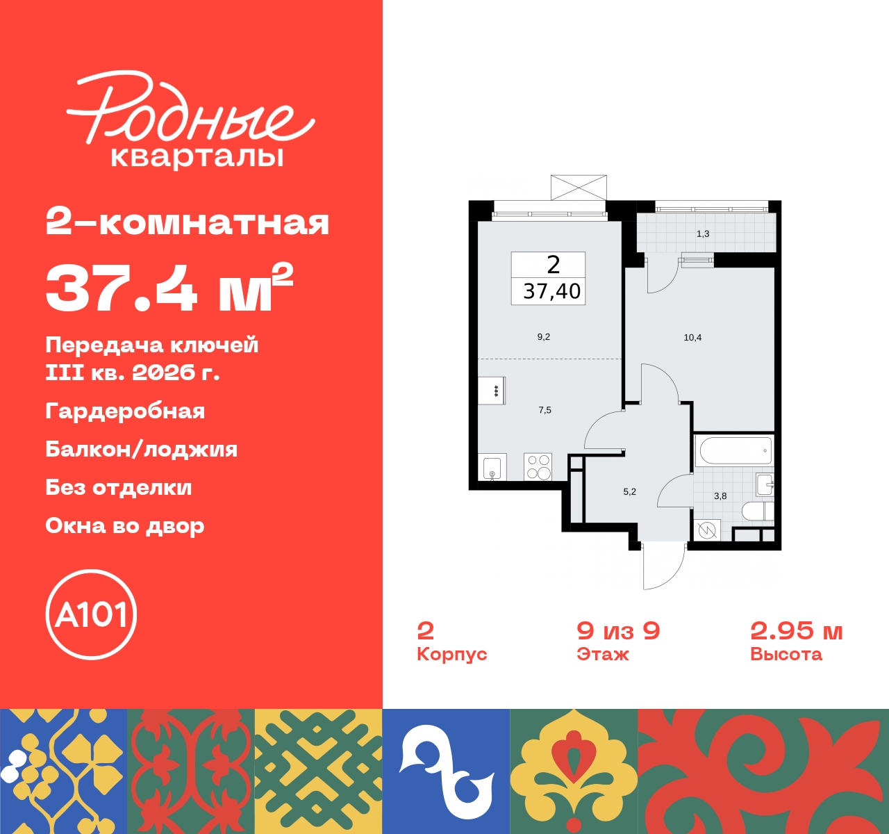 Просторная 2-комн. квартира с европланировкой в ЖК "Родные кварталы" на 9 этаже. Квартира без отделки, после оформления собственности можно делать ремонт. Общая площадь: 37.4 кв.м., жилая: 19.6 кв.м., общая площадь гостиной-столовой с кухонной зоной: 16.7 кв.м. Европейская планировка, кухня и гостиная объединены в одно просторное помещение. Комнаты изолированные, все окна выходят на одну сторону. В квартире одна лоджия, один совмещенный санузел. Высота потолков 2.9 м. Имеется ниша под гардероб. Дом монолитный, многоподъездный, высотой 9 этажей. Квартира находится в 9-й секции в корпусе 2. На этаже 8 квартир. В подъезде 1 грузовой лифт. Начало строительства - 4 квартал 2023 года. Окончание строительства - 3 квартал 2026 года. Оформление сделки по договору долевого участия. Артикул квартиры по базе застройщика 96К-2-436. ПРЕДЛОЖЕНИЯ ОТ ЗАСТРОЙЩИКА В ОКТЯБРЕ 2025: Ипотека от 13,9 % для всех! На весь срок. "Семейная ипотека" вернулась. Ставка от 3,5 % на весь срок! Без удорожания! Выгодное ипотечное комбо: Ипотека от 2200 р./мес. и от 6 % после рождения ребёнка! Ипотека для всех "Держи пять!" - ставка 5 % на 2 года! *более подробную информацию по скидкам и акциям уточняйте в отделе продаж Новый жилой комплекс "Родные кварталы" строится в уютной, экологически благополучной локации на юго-западе столицы. В ближайшем окружении – ухоженные малоэтажные посёлки и живописный Ульяновский лесопарк. Благодаря этому из окон откроются вдохновляющие виды, которые не исчезнут со временем за фасадами многоэтажек. Через весь район пройдёт главный бульвар, который свяжет набережную, жилые кварталы и площади в единое дружелюбное пространство, органично наполненное узнаваемыми элементами культурных традиций разных народов. В жилом комплексе создаются условия для комфортного отдыха и занятий спортом всех жителей. Здесь можно прогуляться и отдохнуть в лесопарке на берегу ручья, позаниматься на тренажёрах под открытым небом и спортивных площадках. Для малышей построят игровые комплексы, развивающие силу, координацию и ловкость. Всего в жилом комплексе будет оборудовано 6 га территории для спокойного отдыха и около 9 га — для активного. Подъезды в домах освещены в любое время суток, входы и вестибюль хорошо просматриваются с улицы. Витражное остекление обеспечивает приток естественного света днём, а вечером зажигаются светильники. В отделке домов используется сочетание вентилируемого фасада с облицовкой из фибробетонной плитки и штукатуркой. Комфортная высота домов соразмерна человеку и в среднем составляет 10 этажей. Все дома обеспечены собственными подземными паркингами. В них размещаются машино-места и кладовые. В паркинг или кладовую можно спуститься на лифте или по лестнице. В комплексе появятся бытовые сервисы, магазины, аптеки и другие торгово-бытовые объекты. В жилом районе «Родные кварталы» будут построены: - образовательный центр: школа на 1300 учеников и детский сад на 250 малышей, - два детских сада на 200 мест каждый (один из них сдаётся в 1-й очереди). В транспортной доступности уже работают: - школа № 41 и детский сад — по Боровскому шоссе, - школа № 2057 и детский сад — на запад от района, в дер. Марушкино. ЖК «Родные кварталы» строится в Новомосковском округе столицы, в 15 минутах на автомобиле от аэропорта «Внуково». Район обеспечен удобными выездами на три крупные современные автотра