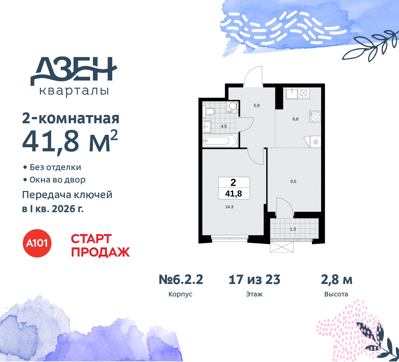 2-комн. квартира с европланировкой от застройщика в ЖК "Дзен-кварталы" на 17 этаже. Квартира без отделки, новый владелец может сделать ремонт по своему дизайн-проекту. Общая площадь: 41.8 кв.м., жилая: 23.3 кв.м., суммарная площадь гостиной-столовой с кухонной зоной: 15.8 кв.м. Европейская планировка, кухня-гостиная - идеальный вариант для тех, кто любит часто принимать гостей. Комнаты изолированные, все окна выходят на одну сторону. В квартире одна лоджия, один совмещенный санузел. Высота потолков 2.8 м. Эта квартира предлагается без отделки. Будут установлены стеклопакеты с повышенной тепло- и шумоизоляцией, в квартиру заведены все коммуникации. Вы сможете в полном объеме реализовать ваши идеи обустройства вашего комфортного дома. Квартира находится в корпусе 6.2.2. Дом монолитный, одноподъездный, высотой 23 этажа. На этаже 10 квартир. В подъезде 1 пассажирский и 2 грузовых лифта. Начало строительства - 4 квартал 2023 года. Окончание строительства - 1 квартал 2026 года. Оформление сделки по договору долевого участия. Артикул квартиры по базе застройщика 41К-6.2.2-471. В шаговой доступности от жилого комплекса расположены станции метро (расстояние по прямой): «Новомосковская (Коммунарка)» (800 м), «Новомосковская» (800 м), «Потапово» (900 м), также недалеко от этого корпуса расположены станции метро: «Коммунарка», «Улица Горчакова», «Бульвар адмирала Ушакова», «Ольховая», «Бунинская аллея». ПРЕДЛОЖЕНИЯ ОТ ЗАСТРОЙЩИКА В ОКТЯБРЕ 2025: Ипотека от 13,9 % для всех! На весь срок. "Семейная ипотека" вернулась. Ставка от 3,5 % на весь срок! Без удорожания! Выгодное ипотечное комбо: Ипотека от 2200 р./мес. и от 6 % после рождения ребёнка! Ипотека для всех "Держи пять!" - ставка 5 % на 2 года! *более подробную информацию по скидкам и акциям уточняйте в отделе продаж Новый район «Дзен-кварталы» возводится на юго-западе столицы – вдоль береговой линии живописного Ивановского пруда и реки Варварки. В основе проекта – «сочетание несочетаемого», гармония простого и утончённого, природного и урбанистического – стиль Japandi, объединяющий скандинавскую функциональность и восточную созерцательность. В приятном соседстве с домами нового района живописный Ивановский пруд — его береговая линия проходит по территории «Дзен-кварталов». Здесь будет благоустроена набережная для отдыха жителей нового района — по авторскому проекту Группы компаний «А101». На территории района появятся два детских сада и крупный образовательный комплекс, в состав которого войдут детский сад и школа. Все они будут спроектированы на основе собственной концепции образовательной среды ГК «А101», разработанной экспертами в области педагогики, детский психологии и эргономики учебных пространств. Фасадные решения выполнены в современном архитектурном стиле, основанном на сочетании японского минимализма и скандинавской функциональности. Использованы природные оттенки спокойного японского пейзажа, материалы, имитирующие натуральные поверхности – штукатурка, облицовочная плитка разных размеров и текстур. Подобный стилистический подход делает пространство созерцательными и гармоничным. Для комфортного хранения габаритных и сезонных вещей на уровне подземного этажа спланированы удобные кладовые помещения. Доступ в них осуществляется на лифте. Отличная транспортная доступность. 2 станции метро, "Коммунарка" и "Потапо