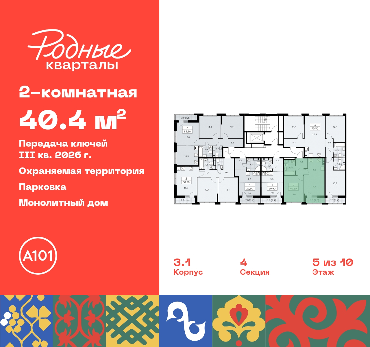 Просторная двухкомнатная квартира с европланировкой в ЖК "Родные кварталы" на 5 этаже. Квартира без отделки, после оформления собственности можно делать ремонт. Общая площадь: 40.4 кв.м., жилая: 21.2 кв.м., суммарная площадь гостиной-столовой с кухонной зоной: 22.5 кв.м. Европланировка, кухня и гостиная объединены в одно просторное помещение. Комнаты изолированные, все окна выходят на одну сторону. В квартире одна лоджия, один совмещенный санузел. Высота потолков 2.95 м. Дом монолитный, черырехподъездный, высотой 10 этажей. Квартира находится в 4-й секции в корпусе 3.1. На этаже 6 квартир. В подъезде 1 грузовой лифт. Начало строительства - 2 квартал 2024 года. Окончание строительства - 3 квартал 2026 года. Оформление сделки по договору долевого участия. Артикул квартиры по базе застройщика 96К-3.1-155. ПРЕДЛОЖЕНИЯ ОТ ЗАСТРОЙЩИКА В ОКТЯБРЕ 2025: Ипотека от 13,9 % для всех! На весь срок. "Семейная ипотека" вернулась. Ставка от 3,5 % на весь срок! Без удорожания! Выгодное ипотечное комбо: Ипотека от 2200 р./мес. и от 6 % после рождения ребёнка! Ипотека для всех "Держи пять!" - ставка 5 % на 2 года! *более подробную информацию по скидкам и акциям уточняйте в отделе продаж Новый жилой комплекс "Родные кварталы" строится в уютной, экологически благополучной локации на юго-западе столицы. В ближайшем окружении – ухоженные малоэтажные посёлки и живописный Ульяновский лесопарк. Благодаря этому из окон откроются вдохновляющие виды, которые не исчезнут со временем за фасадами многоэтажек. Через весь район пройдёт главный бульвар, который свяжет набережную, жилые кварталы и площади в единое дружелюбное пространство, органично наполненное узнаваемыми элементами культурных традиций разных народов. В жилом комплексе создаются условия для комфортного отдыха и занятий спортом всех жителей. Здесь можно прогуляться и отдохнуть в лесопарке на берегу ручья, позаниматься на тренажёрах под открытым небом и спортивных площадках. Для малышей построят игровые комплексы, развивающие силу, координацию и ловкость. Всего в жилом комплексе будет оборудовано 6 га территории для спокойного отдыха и около 9 га — для активного. Подъезды в домах освещены в любое время суток, входы и вестибюль хорошо просматриваются с улицы. Витражное остекление обеспечивает приток естественного света днём, а вечером зажигаются светильники. В отделке домов используется сочетание вентилируемого фасада с облицовкой из фибробетонной плитки и штукатуркой. Комфортная высота домов соразмерна человеку и в среднем составляет 10 этажей. Все дома обеспечены собственными подземными паркингами. В них размещаются машино-места и кладовые. В паркинг или кладовую можно спуститься на лифте или по лестнице. В комплексе появятся бытовые сервисы, магазины, аптеки и другие торгово-бытовые объекты. В жилом районе «Родные кварталы» будут построены: - образовательный центр: школа на 1300 учеников и детский сад на 250 малышей, - два детских сада на 200 мест каждый (один из них сдаётся в 1-й очереди). В транспортной доступности уже работают: - школа № 41 и детский сад — по Боровскому шоссе, - школа № 2057 и детский сад — на запад от района, в дер. Марушкино. ЖК «Родные кварталы» строится в Новомосковском округе столицы, в 15 минутах на автомобиле от аэропорта «Внуково». Район обеспечен удобными выездами на три крупные современные автотрассы. Здесь уже ра