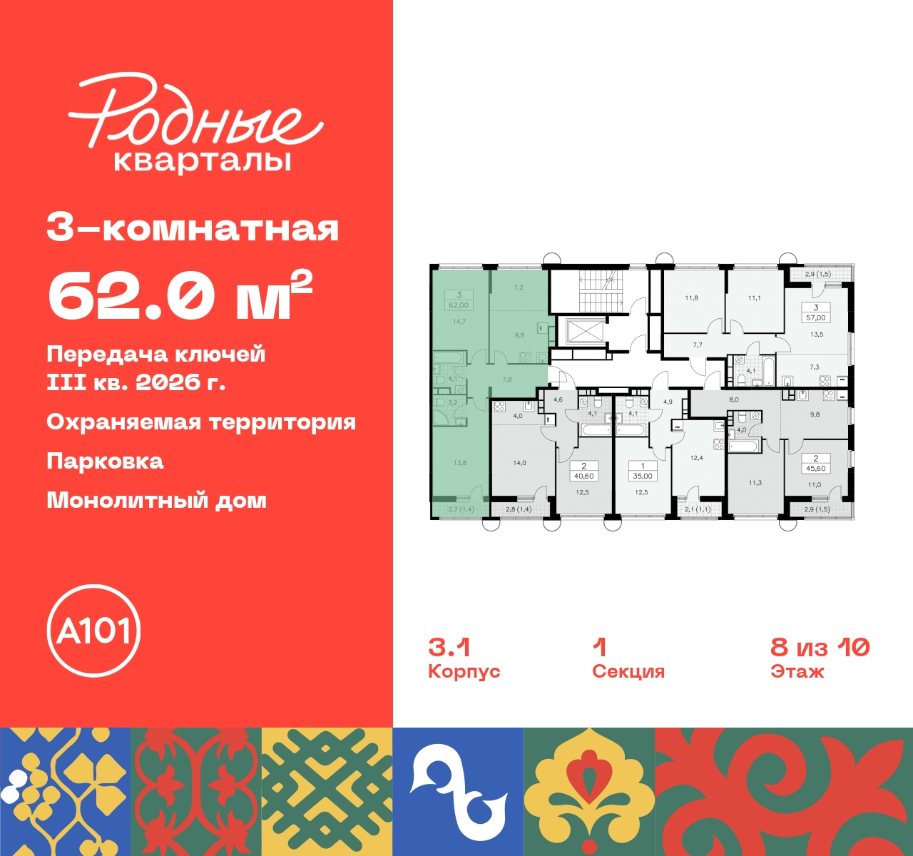 Трехкомнатная квартира с европланировкой в ЖК "Родные кварталы" на 8 этаже. Квартира без отделки, после получения ключей можно делать ремонт. Общая площадь: 62 кв.м., жилая: 35.7 кв.м., общая площадь гостиной-столовой с кухонной зоной: 17 кв.м. Европейская планировка, кухня-гостиная - идеальный вариант для тех, кто любит часто принимать гостей. Квартира - распашонка, без проходных комнат, окна выходят на paзные стороны дома. В квартире один балкон, два совмещенных санузла. Высота потолков 2.95 м. Дом монолитный, черырехподъездный, высотой 10 этажей. Квартира находится в 1-й секции в корпусе 3.1. На этаже 5 квартир. В подъезде 1 грузовой лифт. Начало строительства - 2 квартал 2024 года. Окончание строительства - 3 квартал 2026 года. Оформление сделки по договору долевого участия. Артикул квартиры по базе застройщика 96К-3.1-35. ПРЕДЛОЖЕНИЯ ОТ ЗАСТРОЙЩИКА В ОКТЯБРЕ 2025: Ипотека от 13,9 % для всех! На весь срок. "Семейная ипотека" вернулась. Ставка от 3,5 % на весь срок! Без удорожания! Выгодное ипотечное комбо: Ипотека от 2200 р./мес. и от 6 % после рождения ребёнка! Ипотека для всех "Держи пять!" - ставка 5 % на 2 года! *более подробную информацию по скидкам и акциям уточняйте в отделе продаж Новый жилой комплекс "Родные кварталы" строится в уютной, экологически благополучной локации на юго-западе столицы. В ближайшем окружении – ухоженные малоэтажные посёлки и живописный Ульяновский лесопарк. Благодаря этому из окон откроются вдохновляющие виды, которые не исчезнут со временем за фасадами многоэтажек. Через весь район пройдёт главный бульвар, который свяжет набережную, жилые кварталы и площади в единое дружелюбное пространство, органично наполненное узнаваемыми элементами культурных традиций разных народов. В жилом комплексе создаются условия для комфортного отдыха и занятий спортом всех жителей. Здесь можно прогуляться и отдохнуть в лесопарке на берегу ручья, позаниматься на тренажёрах под открытым небом и спортивных площадках. Для малышей построят игровые комплексы, развивающие силу, координацию и ловкость. Всего в жилом комплексе будет оборудовано 6 га территории для спокойного отдыха и около 9 га — для активного. Подъезды в домах освещены в любое время суток, входы и вестибюль хорошо просматриваются с улицы. Витражное остекление обеспечивает приток естественного света днём, а вечером зажигаются светильники. В отделке домов используется сочетание вентилируемого фасада с облицовкой из фибробетонной плитки и штукатуркой. Комфортная высота домов соразмерна человеку и в среднем составляет 10 этажей. Все дома обеспечены собственными подземными паркингами. В них размещаются машино-места и кладовые. В паркинг или кладовую можно спуститься на лифте или по лестнице. В комплексе появятся бытовые сервисы, магазины, аптеки и другие торгово-бытовые объекты. В жилом районе «Родные кварталы» будут построены: - образовательный центр: школа на 1300 учеников и детский сад на 250 малышей, - два детских сада на 200 мест каждый (один из них сдаётся в 1-й очереди). В транспортной доступности уже работают: - школа № 41 и детский сад — по Боровскому шоссе, - школа № 2057 и детский сад — на запад от района, в дер. Марушкино. ЖК «Родные кварталы» строится в Новомосковском округе столицы, в 15 минутах на автомобиле от аэропорта «Внуково». Район обеспечен удобными выездами на три крупные современные ав