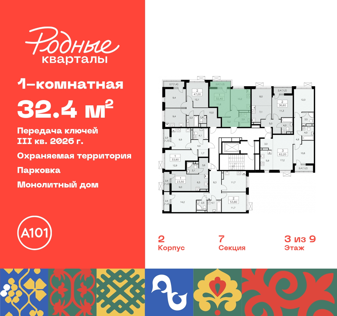 Продается 1-комн. квартира от застройщика в ЖК "Родные кварталы" на 3 этаже. Квартира без отделки, новый владелец может сделать ремонт по индивидуальному дизайн-проекту. Общая площадь: 32.4 кв.м., жилая: 11.8 кв.м., площадь просторной кухни-столовой: 10.2 кв.м. Все окна выходят на одну сторону. В квартире один балкон, один совмещенный санузел. Высота потолков 2.9 м. Имеется ниша под гардероб. Дом монолитный, многоподъездный, высотой 9 этажей. Квартира находится в 7-й секции в корпусе 2. На этаже 7 квартир. В подъезде 1 грузовой лифт. Начало строительства - 4 квартал 2023 года. Окончание строительства - 3 квартал 2026 года. Оформление сделки по договору долевого участия. Артикул квартиры по базе застройщика 96К-2-292. ПРЕДЛОЖЕНИЯ ОТ ЗАСТРОЙЩИКА В ОКТЯБРЕ 2025: Ипотека от 13,9 % для всех! На весь срок. "Семейная ипотека" вернулась. Ставка от 3,5 % на весь срок! Без удорожания! Выгодное ипотечное комбо: Ипотека от 2200 р./мес. и от 6 % после рождения ребёнка! Ипотека для всех "Держи пять!" - ставка 5 % на 2 года! *более подробную информацию по скидкам и акциям уточняйте в отделе продаж Новый жилой комплекс "Родные кварталы" строится в уютной, экологически благополучной локации на юго-западе столицы. В ближайшем окружении – ухоженные малоэтажные посёлки и живописный Ульяновский лесопарк. Благодаря этому из окон откроются вдохновляющие виды, которые не исчезнут со временем за фасадами многоэтажек. Через весь район пройдёт главный бульвар, который свяжет набережную, жилые кварталы и площади в единое дружелюбное пространство, органично наполненное узнаваемыми элементами культурных традиций разных народов. В жилом комплексе создаются условия для комфортного отдыха и занятий спортом всех жителей. Здесь можно прогуляться и отдохнуть в лесопарке на берегу ручья, позаниматься на тренажёрах под открытым небом и спортивных площадках. Для малышей построят игровые комплексы, развивающие силу, координацию и ловкость. Всего в жилом комплексе будет оборудовано 6 га территории для спокойного отдыха и около 9 га — для активного. Подъезды в домах освещены в любое время суток, входы и вестибюль хорошо просматриваются с улицы. Витражное остекление обеспечивает приток естественного света днём, а вечером зажигаются светильники. В отделке домов используется сочетание вентилируемого фасада с облицовкой из фибробетонной плитки и штукатуркой. Комфортная высота домов соразмерна человеку и в среднем составляет 10 этажей. Все дома обеспечены собственными подземными паркингами. В них размещаются машино-места и кладовые. В паркинг или кладовую можно спуститься на лифте или по лестнице. В комплексе появятся бытовые сервисы, магазины, аптеки и другие торгово-бытовые объекты. В жилом районе «Родные кварталы» будут построены: - образовательный центр: школа на 1300 учеников и детский сад на 250 малышей, - два детских сада на 200 мест каждый (один из них сдаётся в 1-й очереди). В транспортной доступности уже работают: - школа № 41 и детский сад — по Боровскому шоссе, - школа № 2057 и детский сад — на запад от района, в дер. Марушкино. ЖК «Родные кварталы» строится в Новомосковском округе столицы, в 15 минутах на автомобиле от аэропорта «Внуково». Район обеспечен удобными выездами на три крупные современные автотрассы. Здесь уже работает и активно развивается система наземного общественного транспорта, включая между