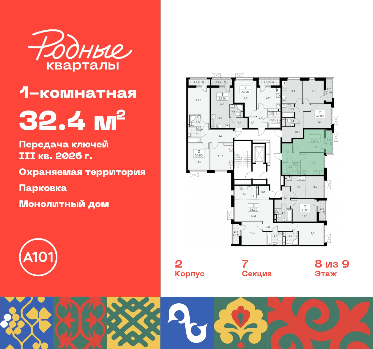 Просторная 1-комн. квартира в ЖК "Родные кварталы" на 8 этаже. Квартира без отделки, после оформления собственности можно делать ремонт. Общая площадь: 32.4 кв.м., жилая: 11.8 кв.м., площадь просторной кухни-столовой: 10.2 кв.м. Все окна выходят на одну сторону. В квартире один балкон, один совмещенный санузел. Высота потолков 2.9 м. Имеется ниша под гардероб. Дом монолитный, многоподъездный, высотой 9 этажей. Квартира находится в 7-й секции в корпусе 2. На этаже 7 квартир. В подъезде 1 грузовой лифт. Начало строительства - 4 квартал 2023 года. Окончание строительства - 3 квартал 2026 года. Оформление сделки по договору долевого участия. Артикул квартиры по базе застройщика 96К-2-327. ПРЕДЛОЖЕНИЯ ОТ ЗАСТРОЙЩИКА В ОКТЯБРЕ 2025: Ипотека от 13,9 % для всех! На весь срок. "Семейная ипотека" вернулась. Ставка от 3,5 % на весь срок! Без удорожания! Выгодное ипотечное комбо: Ипотека от 2200 р./мес. и от 6 % после рождения ребёнка! Ипотека для всех "Держи пять!" - ставка 5 % на 2 года! *более подробную информацию по скидкам и акциям уточняйте в отделе продаж Новый жилой комплекс "Родные кварталы" строится в уютной, экологически благополучной локации на юго-западе столицы. В ближайшем окружении – ухоженные малоэтажные посёлки и живописный Ульяновский лесопарк. Благодаря этому из окон откроются вдохновляющие виды, которые не исчезнут со временем за фасадами многоэтажек. Через весь район пройдёт главный бульвар, который свяжет набережную, жилые кварталы и площади в единое дружелюбное пространство, органично наполненное узнаваемыми элементами культурных традиций разных народов. В жилом комплексе создаются условия для комфортного отдыха и занятий спортом всех жителей. Здесь можно прогуляться и отдохнуть в лесопарке на берегу ручья, позаниматься на тренажёрах под открытым небом и спортивных площадках. Для малышей построят игровые комплексы, развивающие силу, координацию и ловкость. Всего в жилом комплексе будет оборудовано 6 га территории для спокойного отдыха и около 9 га — для активного. Подъезды в домах освещены в любое время суток, входы и вестибюль хорошо просматриваются с улицы. Витражное остекление обеспечивает приток естественного света днём, а вечером зажигаются светильники. В отделке домов используется сочетание вентилируемого фасада с облицовкой из фибробетонной плитки и штукатуркой. Комфортная высота домов соразмерна человеку и в среднем составляет 10 этажей. Все дома обеспечены собственными подземными паркингами. В них размещаются машино-места и кладовые. В паркинг или кладовую можно спуститься на лифте или по лестнице. В комплексе появятся бытовые сервисы, магазины, аптеки и другие торгово-бытовые объекты. В жилом районе «Родные кварталы» будут построены: - образовательный центр: школа на 1300 учеников и детский сад на 250 малышей, - два детских сада на 200 мест каждый (один из них сдаётся в 1-й очереди). В транспортной доступности уже работают: - школа № 41 и детский сад — по Боровскому шоссе, - школа № 2057 и детский сад — на запад от района, в дер. Марушкино. ЖК «Родные кварталы» строится в Новомосковском округе столицы, в 15 минутах на автомобиле от аэропорта «Внуково». Район обеспечен удобными выездами на три крупные современные автотрассы. Здесь уже работает и активно развивается система наземного общественного транспорта, включая междугородние рейсы. Интенсивное разви