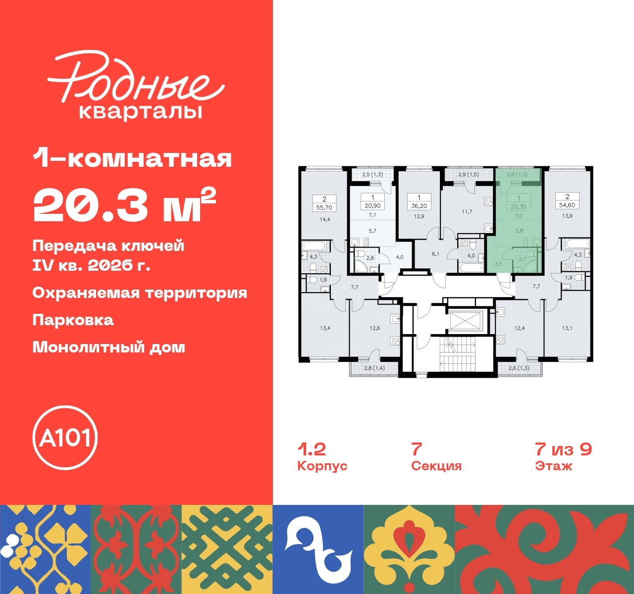 Однокомнатная квартира-студия от застройщика с отделкой в ЖК "Родные кварталы" на 7 этаже. Общая площадь: 20.3 кв.м., площадь гостиной 12.8 кв.м., из которых 5.8 кв.м. выделено под кухонную зону. Все окна выходят на одну сторону. В квартире один балкон, один совмещенный санузел. Высота потолков 2.9 м. Дом монолитный, многоподъездный, высотой 9 этажей. Квартира находится в 6-й секции в корпусе 1.2. На этаже 5 квартир. В подъезде 1 грузовой лифт. Начало строительства - 4 квартал 2023 года. Окончание строительства - 4 квартал 2026 года. Оформление сделки по договору долевого участия. Артикул квартиры по базе застройщика 96К-1.2-376. ПРЕДЛОЖЕНИЯ ОТ ЗАСТРОЙЩИКА В ОКТЯБРЕ 2025: Ипотека от 13,9 % для всех! На весь срок. "Семейная ипотека" вернулась. Ставка от 3,5 % на весь срок! Без удорожания! Выгодное ипотечное комбо: Ипотека от 2200 р./мес. и от 6 % после рождения ребёнка! Ипотека для всех "Держи пять!" - ставка 5 % на 2 года! *более подробную информацию по скидкам и акциям уточняйте в отделе продаж Новый жилой комплекс "Родные кварталы" строится в уютной, экологически благополучной локации на юго-западе столицы. В ближайшем окружении – ухоженные малоэтажные посёлки и живописный Ульяновский лесопарк. Благодаря этому из окон откроются вдохновляющие виды, которые не исчезнут со временем за фасадами многоэтажек. Через весь район пройдёт главный бульвар, который свяжет набережную, жилые кварталы и площади в единое дружелюбное пространство, органично наполненное узнаваемыми элементами культурных традиций разных народов. В жилом комплексе создаются условия для комфортного отдыха и занятий спортом всех жителей. Здесь можно прогуляться и отдохнуть в лесопарке на берегу ручья, позаниматься на тренажёрах под открытым небом и спортивных площадках. Для малышей построят игровые комплексы, развивающие силу, координацию и ловкость. Всего в жилом комплексе будет оборудовано 6 га территории для спокойного отдыха и около 9 га — для активного. Подъезды в домах освещены в любое время суток, входы и вестибюль хорошо просматриваются с улицы. Витражное остекление обеспечивает приток естественного света днём, а вечером зажигаются светильники. В отделке домов используется сочетание вентилируемого фасада с облицовкой из фибробетонной плитки и штукатуркой. Комфортная высота домов соразмерна человеку и в среднем составляет 10 этажей. Все дома обеспечены собственными подземными паркингами. В них размещаются машино-места и кладовые. В паркинг или кладовую можно спуститься на лифте или по лестнице. В комплексе появятся бытовые сервисы, магазины, аптеки и другие торгово-бытовые объекты. В жилом районе «Родные кварталы» будут построены: - образовательный центр: школа на 1300 учеников и детский сад на 250 малышей, - два детских сада на 200 мест каждый (один из них сдаётся в 1-й очереди). В транспортной доступности уже работают: - школа № 41 и детский сад — по Боровскому шоссе, - школа № 2057 и детский сад — на запад от района, в дер. Марушкино. ЖК «Родные кварталы» строится в Новомосковском округе столицы, в 15 минутах на автомобиле от аэропорта «Внуково». Район обеспечен удобными выездами на три крупные современные автотрассы. Здесь уже работает и активно развивается система наземного общественного транспорта, включая междугородние рейсы. Интенсивное развитие локации обеспечивают две действующие станции крупн