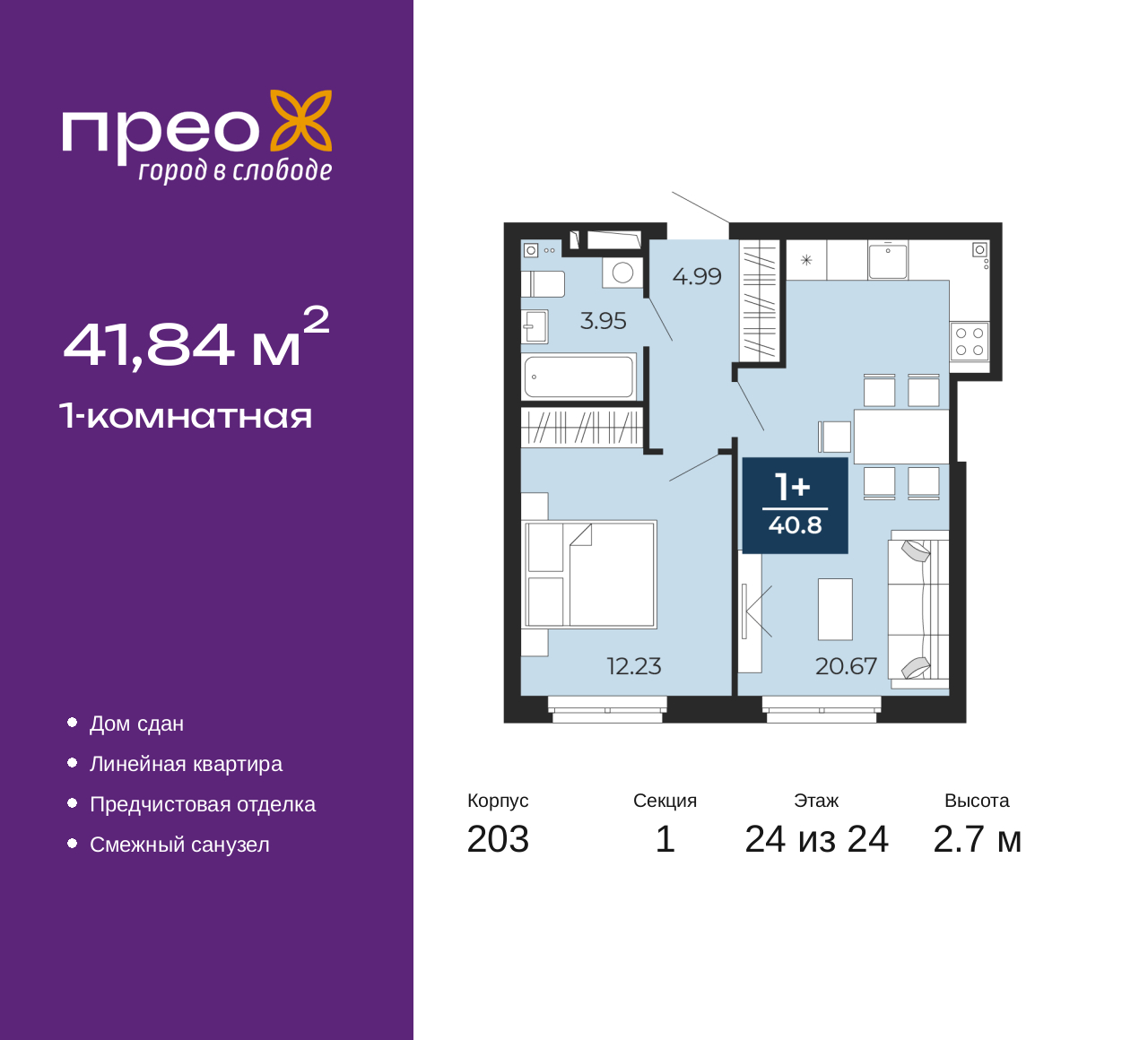 Продается однокомнатная квартира от застройщика с предчистовой отделкой в ЖК "Прео" на 24 этаже. Общая площадь: 41.84 кв.м., жилая: 12.23 кв.м., площадь просторной кухни-столовой: 20.67 кв.м. Все окна выходят на одну сторону. В квартире один совмещенный санузел. Высота потолков 2.7 м. Квартира находится в корпусе 203. Дом монолитный, одноподъездный, высотой 24 этажа. На этаже 14 квартир. В подъезде 2 грузовых лифта. Строительство окончено, дом сдан в 4 квартале 2024 года. Оформление сделки по договору купли-продажи. Преображенский — один из самых привлекательных районов для жизни! Это полностью самостоятельный жилой район с точки зрения инфраструктуры. Преображенский находится между Московским и Червишевским трактами в квартале улиц Закалужская — Вьюжная — Александра Протозанова. Не нужно ждать, когда появится инфраструктура — переезжайте на всё готовое. Вблизи расположены действующие школа и детский сад. В этом году откроется еще один сад, а в следующем году — школа. По соседству с Преображенским запланировано строительство городского парка «Комарово» площадью 38 гектар. За 10 минут можно доехать на автомобиле до крупных ТРЦ: «Лента», «Кристалл», «Леруа Мерлен», «Метро» и «Ашан». С 2018 года в районе открыт Соседский центр — пространство, созданное для формирования добрососедской среды, совместного досуга, общения и реализации соседских инициатив. Здесь проходят встречи соседей, а также сами жители района организовывают мероприятия. Организатором такого события может стать любой желающий. В квартирах выполнена качественная предчистовая отделка. Гладкие стены с финишным выравниванием по маякам. Ровный потолок для установки натяжного потолка. Установлены пятикамерные окна с двойным стеклопакетом (3 стекла). Дизайнерские холлы с видеонаблюдением, безбарьерным и прозрачным входом – всегда светло и спокойно. На первом этаже есть просторные колясочные, где все жители могут оставлять свои коляски и велосипеды. В Преображенском есть всё, что нужно для активного отдыха и занятий спортом. Мы сделали большое футбольное поле с безопасным покрытием. Также установили хоккейный корт, который оборудован по всем необходимым стандартам. Во дворах можно делать упражнения на специальных площадках с турниками. Весь район мы обустроили велодорожками, которые связаны в единый маршрут. У нас есть сухие фонтаны, бьющие из земли, деревья, веревки, сетки, скалодром, газон, песок и резинка — осталось просто дать своему ребенку право на свободную игру. По-настоящему хорошие дворы — это те, которые дети предпочитают соцсетям и телевизору. Аккредитация в банках: ПАО Банк «ВТБ», ОАО «Альфа-Банк», «Сбербанк России», ПАО «Газпромбанк», ПАО «Банк Уралсиб» и других. (AQID02278478)