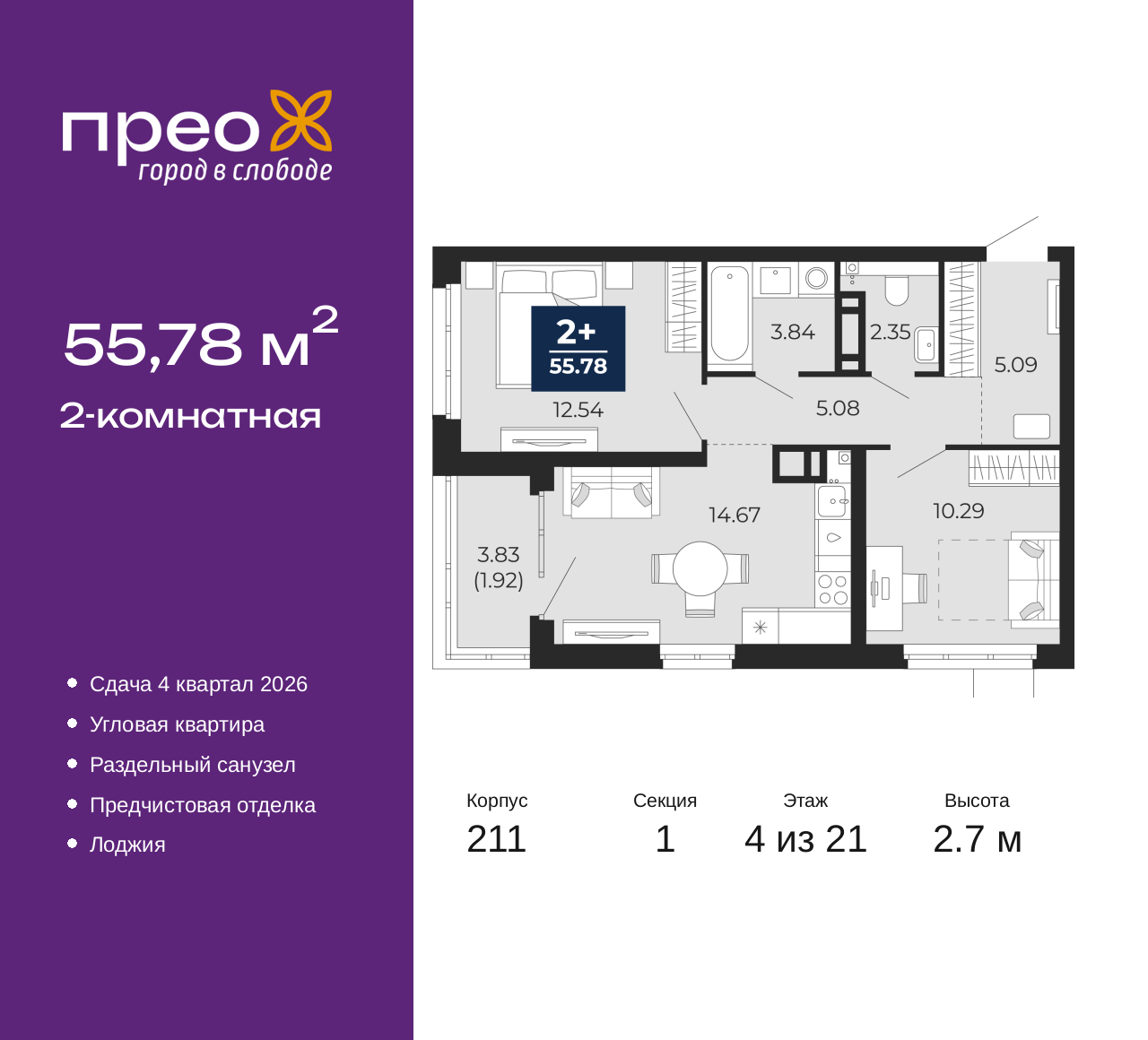 Просторная двухкомнатная квартира с предчистовой отделкой в ЖК "Прео" на 4 этаже. Общая площадь: 55.78 кв.м., жилая: 22.83 кв.м., площадь просторной кухни-столовой: 14.67 кв.м. Угловая квартира, очень светлая, естественная вентиляция при открытии окон. В квартире одна лоджия, один раздельный санузел. Высота потолков 2.7 м. Дом монолитный, черырехподъездный, переменной этажности, от 14 до 21 этажей. Квартира находится в 1-й секции высотой 21 этаж в корпусе 211. На этаже 8 квартир. В подъезде 1 пассажирский и 1 грузовой лифт. Окончание строительства - 4 квартал 2026 года. Оформление сделки по договору долевого участия. Преображенский — один из самых привлекательных районов для жизни! Это полностью самостоятельный жилой район с точки зрения инфраструктуры. Преображенский находится между Московским и Червишевским трактами в квартале улиц Закалужская — Вьюжная — Александра Протозанова. Не нужно ждать, когда появится инфраструктура — переезжайте на всё готовое. Вблизи расположены действующие школа и детский сад. В этом году откроется еще один сад, а в следующем году — школа. По соседству с Преображенским запланировано строительство городского парка «Комарово» площадью 38 гектар. За 10 минут можно доехать на автомобиле до крупных ТРЦ: «Лента», «Кристалл», «Леруа Мерлен», «Метро» и «Ашан». С 2018 года в районе открыт Соседский центр — пространство, созданное для формирования добрососедской среды, совместного досуга, общения и реализации соседских инициатив. Здесь проходят встречи соседей, а также сами жители района организовывают мероприятия. Организатором такого события может стать любой желающий. В квартирах выполнена качественная предчистовая отделка. Гладкие стены с финишным выравниванием по маякам. Ровный потолок для установки натяжного потолка. Установлены пятикамерные окна с двойным стеклопакетом (3 стекла). Дизайнерские холлы с видеонаблюдением, безбарьерным и прозрачным входом – всегда светло и спокойно. На первом этаже есть просторные колясочные, где все жители могут оставлять свои коляски и велосипеды. В Преображенском есть всё, что нужно для активного отдыха и занятий спортом. Мы сделали большое футбольное поле с безопасным покрытием. Также установили хоккейный корт, который оборудован по всем необходимым стандартам. Во дворах можно делать упражнения на специальных площадках с турниками. Весь район мы обустроили велодорожками, которые связаны в единый маршрут. У нас есть сухие фонтаны, бьющие из земли, деревья, веревки, сетки, скалодром, газон, песок и резинка — осталось просто дать своему ребенку право на свободную игру. По-настоящему хорошие дворы — это те, которые дети предпочитают соцсетям и телевизору. Аккредитация в банках: «Сбербанк России», ПАО «Газпромбанк», ОАО «Альфа-Банк», ПАО «Банк Уралсиб», ПАО Банк «ВТБ» и других. (AQID02427616)