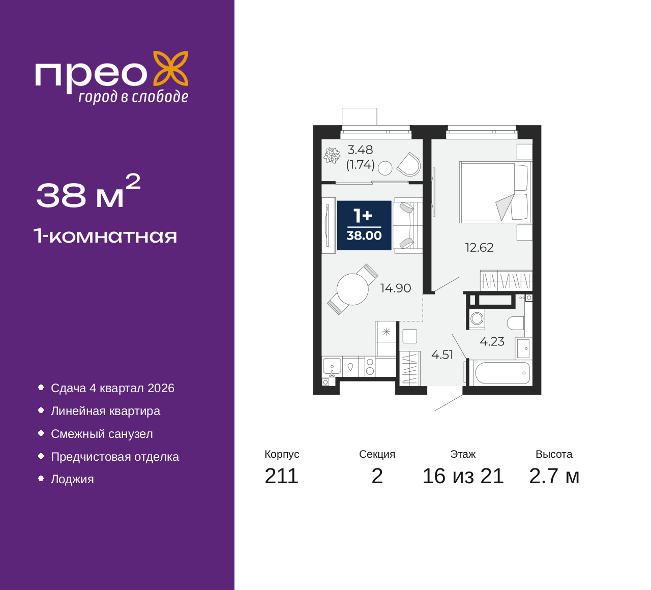 Однокомнатная квартира от застройщика с предчистовой отделкой в ЖК "Прео" на 16 этаже. Общая площадь: 38 кв.м., жилая: 12.62 кв.м., площадь просторной кухни-столовой: 14.9 кв.м. Все окна выходят на одну сторону. В квартире одна лоджия, один совмещенный санузел. Высота потолков 2.7 м. Дом монолитный, черырехподъездный, переменной этажности, от 14 до 21 этажей. Квартира находится во 2-й секции высотой 21 этаж в корпусе 211. На этаже 10 квартир. В подъезде 1 пассажирский и 1 грузовой лифт. Окончание строительства - 4 квартал 2026 года. Оформление сделки по договору долевого участия. Преображенский — один из самых привлекательных районов для жизни! Это полностью самостоятельный жилой район с точки зрения инфраструктуры. Преображенский находится между Московским и Червишевским трактами в квартале улиц Закалужская — Вьюжная — Александра Протозанова. Не нужно ждать, когда появится инфраструктура — переезжайте на всё готовое. Вблизи расположены действующие школа и детский сад. В этом году откроется еще один сад, а в следующем году — школа. По соседству с Преображенским запланировано строительство городского парка «Комарово» площадью 38 гектар. За 10 минут можно доехать на автомобиле до крупных ТРЦ: «Лента», «Кристалл», «Леруа Мерлен», «Метро» и «Ашан». С 2018 года в районе открыт Соседский центр — пространство, созданное для формирования добрососедской среды, совместного досуга, общения и реализации соседских инициатив. Здесь проходят встречи соседей, а также сами жители района организовывают мероприятия. Организатором такого события может стать любой желающий. В квартирах выполнена качественная предчистовая отделка. Гладкие стены с финишным выравниванием по маякам. Ровный потолок для установки натяжного потолка. Установлены пятикамерные окна с двойным стеклопакетом (3 стекла). Дизайнерские холлы с видеонаблюдением, безбарьерным и прозрачным входом – всегда светло и спокойно. На первом этаже есть просторные колясочные, где все жители могут оставлять свои коляски и велосипеды. В Преображенском есть всё, что нужно для активного отдыха и занятий спортом. Мы сделали большое футбольное поле с безопасным покрытием. Также установили хоккейный корт, который оборудован по всем необходимым стандартам. Во дворах можно делать упражнения на специальных площадках с турниками. Весь район мы обустроили велодорожками, которые связаны в единый маршрут. У нас есть сухие фонтаны, бьющие из земли, деревья, веревки, сетки, скалодром, газон, песок и резинка — осталось просто дать своему ребенку право на свободную игру. По-настоящему хорошие дворы — это те, которые дети предпочитают соцсетям и телевизору. Аккредитация в банках: ПАО «Газпромбанк», ОАО «Альфа-Банк», ПАО «Банк Уралсиб», ПАО Банк «ВТБ», «Сбербанк России» и других. (AQID02427493)