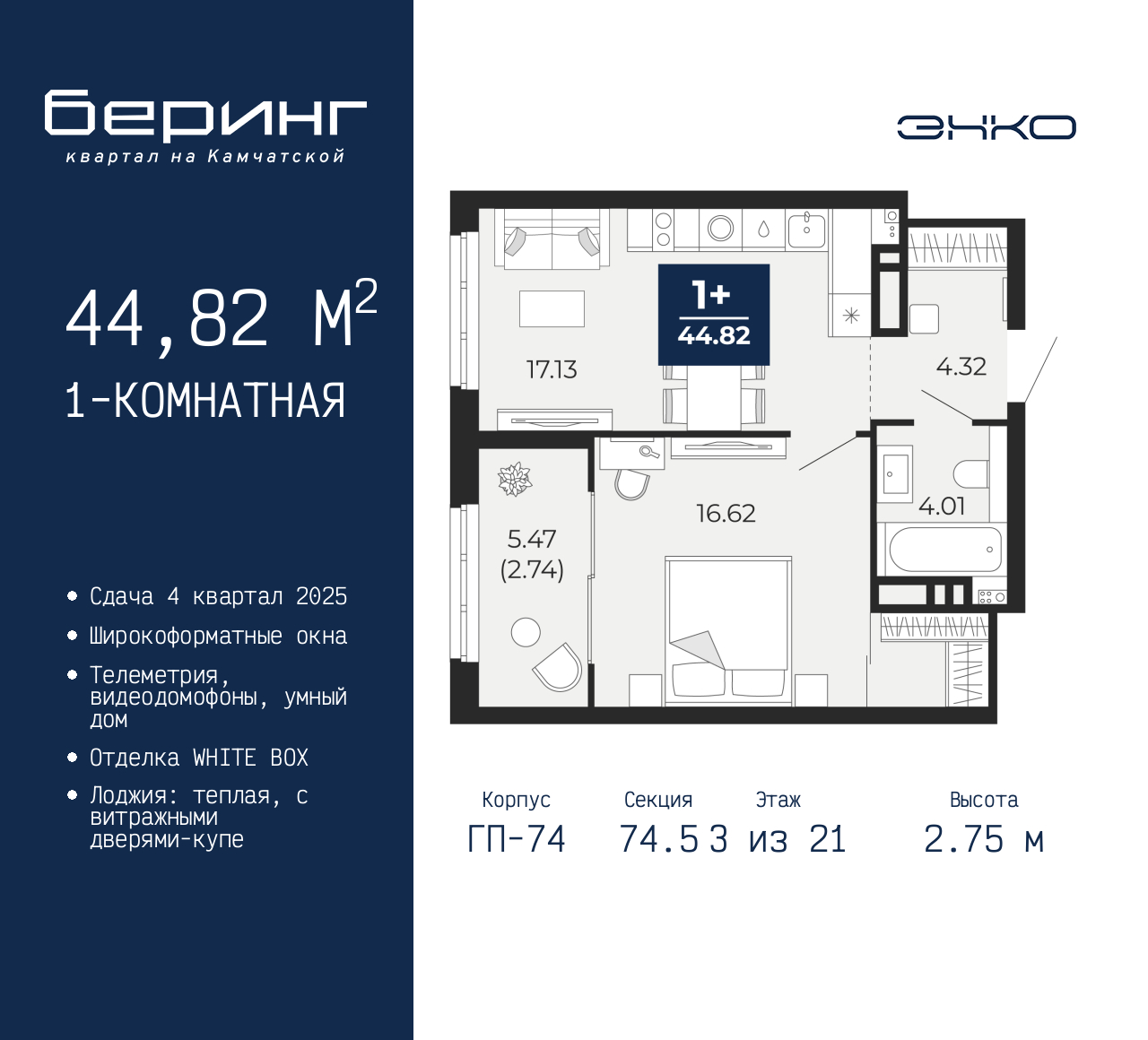 Однокомнатная квартира от застройщика в ЖК "Беринг" на 3 этаже. Квартира без отделки, полностью готова к ремонту. Общая площадь: 44.82 кв.м., жилая: 16.62 кв.м., площадь просторной кухни-столовой: 17.13 кв.м. Все окна выходят на одну сторону. В квартире одна лоджия, один совмещенный санузел. Высота потолков 2.75 м. Дом монолитный, многоподъездный, переменной этажности, от 9 до 21 этажей. Квартира находится в 74.5-й секции высотой 21 этаж в корпусе ГП-74. На этаже 7 квартир. В подъезде 1 пассажирский и 1 грузовой лифт. Окончание строительства - 4 квартал 2025 года. Оформление сделки по договору долевого участия. Подобно знаменитому исследователю, мы чувствуем себя первооткрывателями этой локации. Хотим показать новую суть места, сформировать для вас жизненный опыт, которого ещё не было. Беринг — район зелёного цвета. Беринг — район, который откроется вам с другой стороны. Впечатлит новым уровнем комфорта и качеством жизни. Беринг — открытие на карте города. Первый квартал расположен в районе Тура, в границах улиц: Камчатская – Западносибирская – Энтузиастов. Вокруг уже есть всё для того, чтобы ежедневная рутина была лишь частью жизни и не доставляла дискомфорта. Школы и детские сады, магазины и аптеки, поликлиника, места для семейного отдыха, пеших и велопрогулок, и даже рыбалки. Масштабное озеленение дворов — визитная карточка ЭНКО и ваш оазис спокойствия, чтобы отвлечься от повседневности. Раскидистые деревья, кустарники, травы и цветы — осталось остановиться, вдохнуть и расслабиться, глядя на эту природную красоту. Стилистика подъездов продолжает концепцию Беринга, вдохновлённого Камчаткой: сдержанный, но при этом впечатляющий дизайн соседствует с удобством и функциональностью. (AQID02315816)