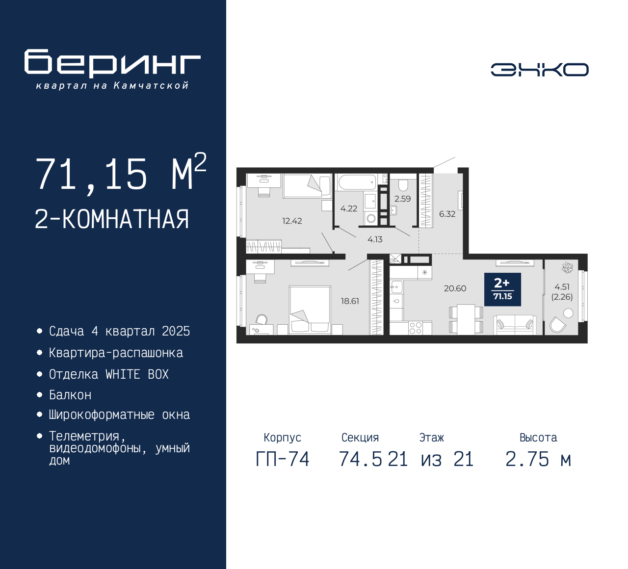 Продается двухкомнатная квартира от застройщика в ЖК "Беринг" на 21 этаже. Квартира без отделки, полностью готова к чистовой отделке и дальнейшему ремонту. Общая площадь: 71.15 кв.м., жилая: 31.03 кв.м., площадь просторной кухни-столовой: 20.6 кв.м. Квартира - распашонка, без проходных комнат, окна выходят на paзные стороны дома. В квартире один балкон, один раздельный санузел. Высота потолков 2.75 м. Дом монолитный, многоподъездный, переменной этажности, от 9 до 21 этажей. Квартира находится в 74.5-й секции высотой 21 этаж в корпусе ГП-74. На этаже 7 квартир. В подъезде 1 пассажирский и 1 грузовой лифт. Окончание строительства - 4 квартал 2025 года. Оформление сделки по договору долевого участия. Подобно знаменитому исследователю, мы чувствуем себя первооткрывателями этой локации. Хотим показать новую суть места, сформировать для вас жизненный опыт, которого ещё не было. Беринг — район зелёного цвета. Беринг — район, который откроется вам с другой стороны. Впечатлит новым уровнем комфорта и качеством жизни. Беринг — открытие на карте города. Первый квартал расположен в районе Тура, в границах улиц: Камчатская – Западносибирская – Энтузиастов. Вокруг уже есть всё для того, чтобы ежедневная рутина была лишь частью жизни и не доставляла дискомфорта. Школы и детские сады, магазины и аптеки, поликлиника, места для семейного отдыха, пеших и велопрогулок, и даже рыбалки. Масштабное озеленение дворов — визитная карточка ЭНКО и ваш оазис спокойствия, чтобы отвлечься от повседневности. Раскидистые деревья, кустарники, травы и цветы — осталось остановиться, вдохнуть и расслабиться, глядя на эту природную красоту. Стилистика подъездов продолжает концепцию Беринга, вдохновлённого Камчаткой: сдержанный, но при этом впечатляющий дизайн соседствует с удобством и функциональностью. (AQID02316264)