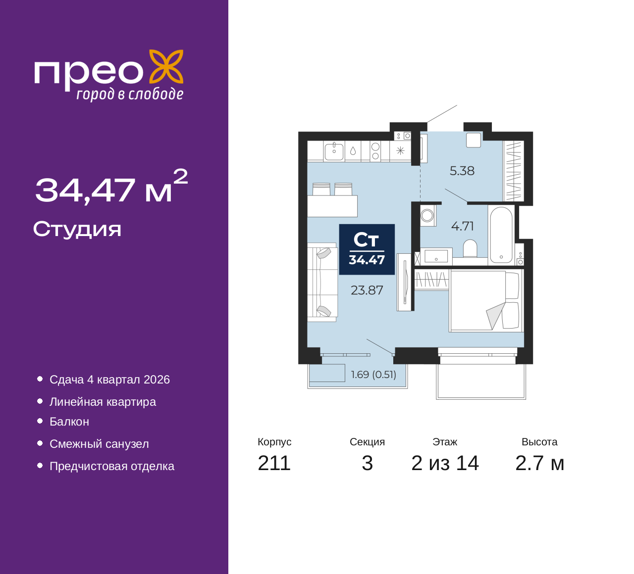1-комн. квартира-студия от застройщика с предчистовой отделкой в ЖК "Прео" на 2 этаже. Общая площадь: 34.47 кв.м., площадь гостиной 23.87 кв.м., из которых 10 кв.м. выделено под кухонную зону. Все окна выходят на одну сторону. В квартире один балкон, один совмещенный санузел. Высота потолков 2.7 м. Дом монолитный, черырехподъездный, переменной этажности, от 14 до 21 этажей. Квартира находится в 3-й секции высотой 14 этажей в корпусе 211. На этаже 6 квартир. В подъезде 1 пассажирский и 1 грузовой лифт. Окончание строительства - 4 квартал 2026 года. Оформление сделки по договору долевого участия. Преображенский — один из самых привлекательных районов для жизни! Это полностью самостоятельный жилой район с точки зрения инфраструктуры. Преображенский находится между Московским и Червишевским трактами в квартале улиц Закалужская — Вьюжная — Александра Протозанова. Не нужно ждать, когда появится инфраструктура — переезжайте на всё готовое. Вблизи расположены действующие школа и детский сад. В этом году откроется еще один сад, а в следующем году — школа. По соседству с Преображенским запланировано строительство городского парка «Комарово» площадью 38 гектар. За 10 минут можно доехать на автомобиле до крупных ТРЦ: «Лента», «Кристалл», «Леруа Мерлен», «Метро» и «Ашан». С 2018 года в районе открыт Соседский центр — пространство, созданное для формирования добрососедской среды, совместного досуга, общения и реализации соседских инициатив. Здесь проходят встречи соседей, а также сами жители района организовывают мероприятия. Организатором такого события может стать любой желающий. В квартирах выполнена качественная предчистовая отделка. Гладкие стены с финишным выравниванием по маякам. Ровный потолок для установки натяжного потолка. Установлены пятикамерные окна с двойным стеклопакетом (3 стекла). Дизайнерские холлы с видеонаблюдением, безбарьерным и прозрачным входом – всегда светло и спокойно. На первом этаже есть просторные колясочные, где все жители могут оставлять свои коляски и велосипеды. В Преображенском есть всё, что нужно для активного отдыха и занятий спортом. Мы сделали большое футбольное поле с безопасным покрытием. Также установили хоккейный корт, который оборудован по всем необходимым стандартам. Во дворах можно делать упражнения на специальных площадках с турниками. Весь район мы обустроили велодорожками, которые связаны в единый маршрут. У нас есть сухие фонтаны, бьющие из земли, деревья, веревки, сетки, скалодром, газон, песок и резинка — осталось просто дать своему ребенку право на свободную игру. По-настоящему хорошие дворы — это те, которые дети предпочитают соцсетям и телевизору. Аккредитация в банках: ПАО «Банк Уралсиб», «Сбербанк России», ОАО «Альфа-Банк», ПАО Банк «ВТБ», ПАО «Газпромбанк» и других. (AQID02427473)