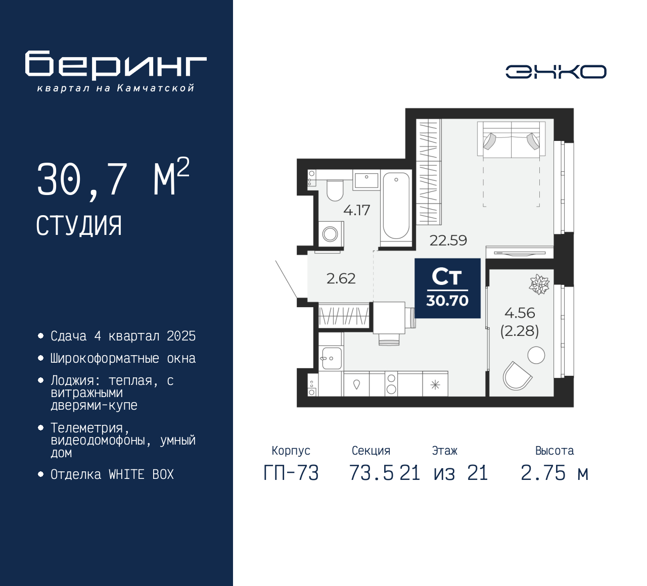 • Общая площадь 30.7 м²