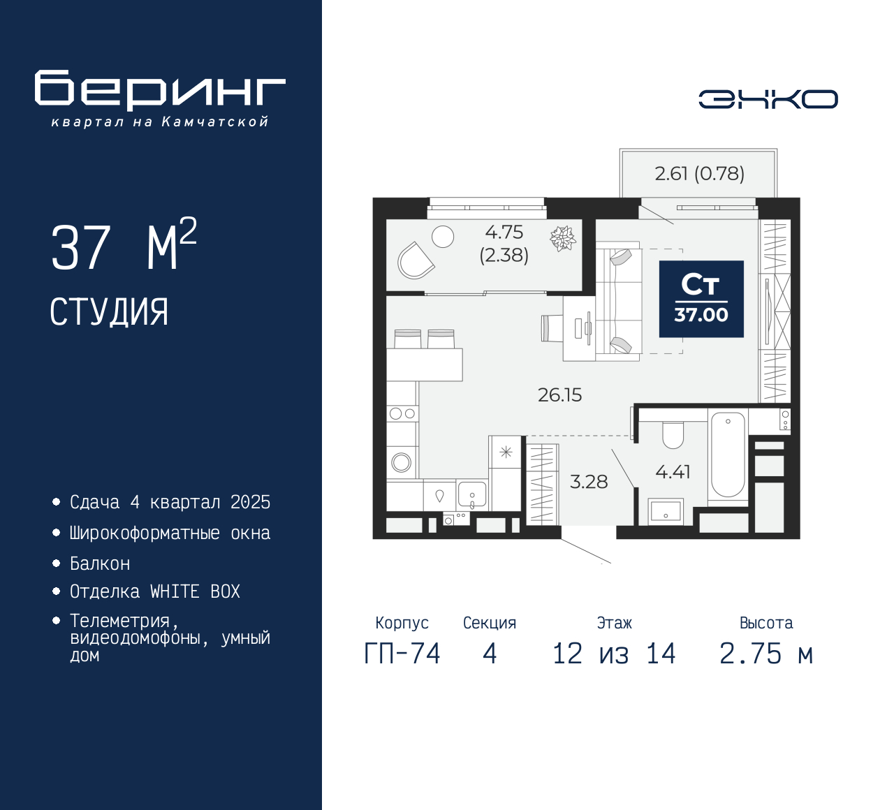 1-комн. квартира-студия от застройщика в ЖК "Беринг" на 12 этаже. Квартира без отделки, после оформления собственности можно делать ремонт. Общая площадь: 37 кв.м., площадь гостиной 26.15 кв.м., из которых 5 кв.м. выделено под кухонную зону. Все окна выходят на одну сторону. В квартире один балкон, один совмещенный санузел. Высота потолков 2.75 м. Дом монолитный, многоподъездный, переменной этажности, от 9 до 21 этажей. Квартира находится в 4-й секции высотой 14 этажей в корпусе ГП-74. На этаже 7 квартир. В подъезде 1 пассажирский и 1 грузовой лифт. Окончание строительства - 4 квартал 2025 года. Оформление сделки по договору долевого участия. Подобно знаменитому исследователю, мы чувствуем себя первооткрывателями этой локации. Хотим показать новую суть места, сформировать для вас жизненный опыт, которого ещё не было. Беринг — район зелёного цвета. Беринг — район, который откроется вам с другой стороны. Впечатлит новым уровнем комфорта и качеством жизни. Беринг — открытие на карте города. Первый квартал расположен в районе Тура, в границах улиц: Камчатская – Западносибирская – Энтузиастов. Вокруг уже есть всё для того, чтобы ежедневная рутина была лишь частью жизни и не доставляла дискомфорта. Школы и детские сады, магазины и аптеки, поликлиника, места для семейного отдыха, пеших и велопрогулок, и даже рыбалки. Масштабное озеленение дворов — визитная карточка ЭНКО и ваш оазис спокойствия, чтобы отвлечься от повседневности. Раскидистые деревья, кустарники, травы и цветы — осталось остановиться, вдохнуть и расслабиться, глядя на эту природную красоту. Стилистика подъездов продолжает концепцию Беринга, вдохновлённого Камчаткой: сдержанный, но при этом впечатляющий дизайн соседствует с удобством и функциональностью. (AQID02315726)