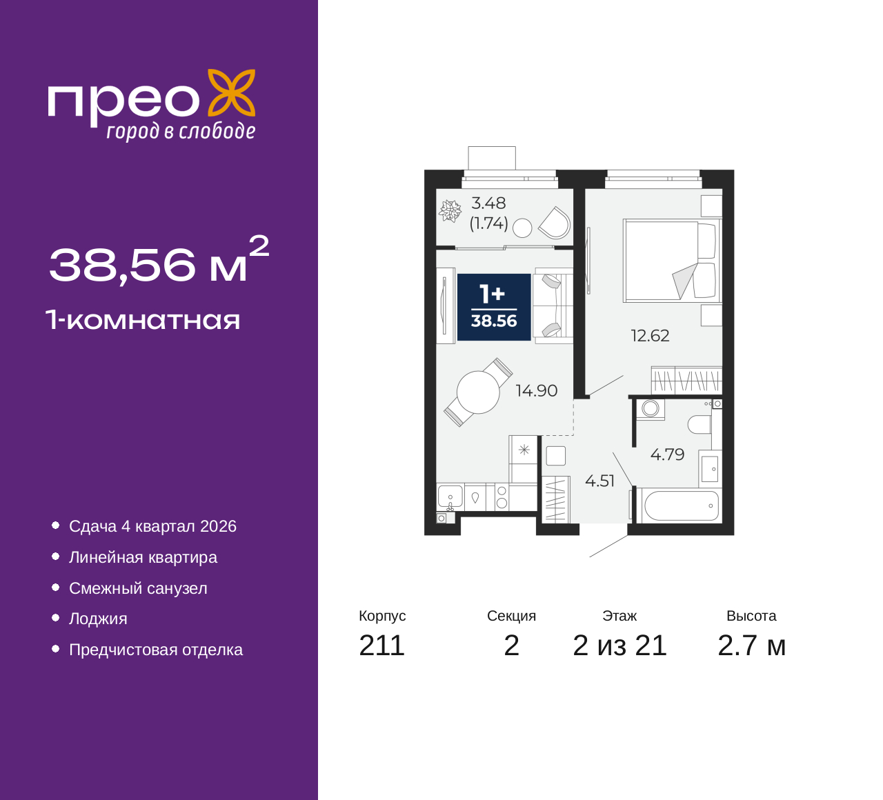 Однокомнатная квартира с предчистовой отделкой в ЖК "Прео" на 2 этаже. Общая площадь: 38.56 кв.м., жилая: 12.62 кв.м., площадь просторной кухни-столовой: 14.9 кв.м. Все окна выходят на одну сторону. В квартире одна лоджия, один совмещенный санузел. Высота потолков 2.7 м. Дом монолитный, черырехподъездный, переменной этажности, от 14 до 21 этажей. Квартира находится во 2-й секции высотой 21 этаж в корпусе 211. На этаже 10 квартир. В подъезде 1 пассажирский и 1 грузовой лифт. Окончание строительства - 4 квартал 2026 года. Оформление сделки по договору долевого участия. Преображенский — один из самых привлекательных районов для жизни! Это полностью самостоятельный жилой район с точки зрения инфраструктуры. Преображенский находится между Московским и Червишевским трактами в квартале улиц Закалужская — Вьюжная — Александра Протозанова. Не нужно ждать, когда появится инфраструктура — переезжайте на всё готовое. Вблизи расположены действующие школа и детский сад. В этом году откроется еще один сад, а в следующем году — школа. По соседству с Преображенским запланировано строительство городского парка «Комарово» площадью 38 гектар. За 10 минут можно доехать на автомобиле до крупных ТРЦ: «Лента», «Кристалл», «Леруа Мерлен», «Метро» и «Ашан». С 2018 года в районе открыт Соседский центр — пространство, созданное для формирования добрососедской среды, совместного досуга, общения и реализации соседских инициатив. Здесь проходят встречи соседей, а также сами жители района организовывают мероприятия. Организатором такого события может стать любой желающий. В квартирах выполнена качественная предчистовая отделка. Гладкие стены с финишным выравниванием по маякам. Ровный потолок для установки натяжного потолка. Установлены пятикамерные окна с двойным стеклопакетом (3 стекла). Дизайнерские холлы с видеонаблюдением, безбарьерным и прозрачным входом – всегда светло и спокойно. На первом этаже есть просторные колясочные, где все жители могут оставлять свои коляски и велосипеды. В Преображенском есть всё, что нужно для активного отдыха и занятий спортом. Мы сделали большое футбольное поле с безопасным покрытием. Также установили хоккейный корт, который оборудован по всем необходимым стандартам. Во дворах можно делать упражнения на специальных площадках с турниками. Весь район мы обустроили велодорожками, которые связаны в единый маршрут. У нас есть сухие фонтаны, бьющие из земли, деревья, веревки, сетки, скалодром, газон, песок и резинка — осталось просто дать своему ребенку право на свободную игру. По-настоящему хорошие дворы — это те, которые дети предпочитают соцсетям и телевизору. Аккредитация в банках: ПАО «Банк Уралсиб», ПАО «Газпромбанк», ОАО «Альфа-Банк», ПАО Банк «ВТБ», «Сбербанк России» и других. (AQID02427502)