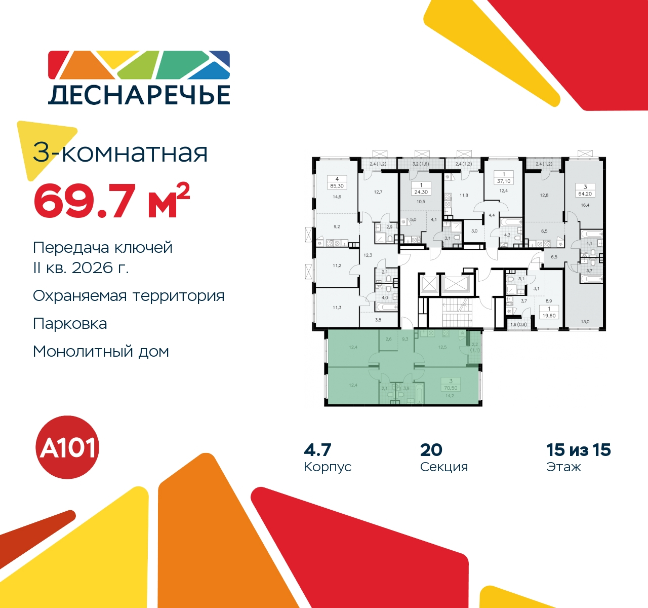 Продается 3-комн. квартира с отделкой в ЖК "Деснаречье" на 15 этаже. Общая площадь: 69.7 кв.м., жилая: 39 кв.м., площадь просторной кухни-столовой: 12.1 кв.м. Квартира - распашонка, без проходных комнат, окна выходят на paзные стороны дома. В квартире одна лоджия, один совмещенный и один раздельный санузел. Высота потолков 2.99 м. Эта квартира будет сдана с дизайнеркой отделкой "под ключ". Специально для вас мы разработали несколько решений дизайнерской отделки. В отделке используются только современный высококлассные материалы, на все работы предоставляется гарантия. В таком случае вы оплачиваете отделку в сегодняшних ценах, а эту стоимость вы можете разнести в ипотечных платежах. Имеется ниша под гардероб. Дом монолитный, трехподъездный, высотой 15 этажей. Квартира находится во 2-й секции в корпусе 4.7. На этаже 6 квартир. В подъезде 1 пассажирский и 1 грузовой лифт. Начало строительства - 3 квартал 2023 года. Окончание строительства - 2 квартал 2026 года. Оформление сделки по договору долевого участия. Артикул квартиры по базе застройщика 88К-4.7-1606. ПРЕДЛОЖЕНИЯ ОТ ЗАСТРОЙЩИКА В ОКТЯБРЕ 2025: Ипотека от 13,9 % для всех! На весь срок. "Семейная ипотека" вернулась. Ставка от 3,5 % на весь срок! Без удорожания! Выгодное ипотечное комбо: Ипотека от 2200 р./мес. и от 6 % после рождения ребёнка! Ипотека для всех "Держи пять!" - ставка 5 % на 2 года! *более подробную информацию по скидкам и акциям уточняйте в отделе продаж Масштабный проект "Деснаречье" на юго-западе Москвы, который включает три новых района («квартала»), объединённые общей идеей – воплотить в реальность мечты современных жителей столицы об интересном, комфортном и разноплановом городском пространстве в окружении рек и лесов, словно сошедших с полотен русских живописцев: - «Берег» оценят все, кому близка водная стихия: плеск волн, солнечные блики и прогулки вдоль тихого течения речи. - «Лес» утопает в зелени парков и лесов. Здесь соблюдён идеальный баланс загородного спокойствия и столичного комфорта. - «Парк», самый энергичный и яркий, отличается высокой концентрацией пространств для спорта и творчества. Жилой комплекс "Деснаречье" расположится в 12 км от МКАД по современному Калужскому шоссе. Внешний облик зданий соответствует современному стилю и стандартам, характерным и для других популярных проектов ГК «А101»: сочетание контрастных тонов, большое количество остекления, в котором отражается небо, гармония с природным окружением. Весь город - в вашем районе. Находиться на территории «15-минутного города» значит иметь всё необходимое для полноценной жизни в шаговой доступности. Маршруты в районе «Деснаречье» выстроены так, чтобы добраться до магазинов, парков, школ, салонов услуг и других объектов можно было всего за несколько минут пешком или на велосипеде. Двор закрытый от машин – это тишина, комфорт и безопасность, поэтому все машино-места (включая «семейные» и увеличенные, с возможностью установки роллетных шкафов) находятся в подземном паркинге. В паркинги можно спуститься на лифте из любого подъезда или по лестнице. Рядом с «Деснаречьем» в 2027 году планируется открытие станции метро «Десна», до которой будет удобно добраться пешком или на велосипеде. Дорога на автомобиле до перехватывающих парковок станций «Ольховая» и «Прокшино» займёт около 10 минут. В процессе реализации проекта будут появляться нов