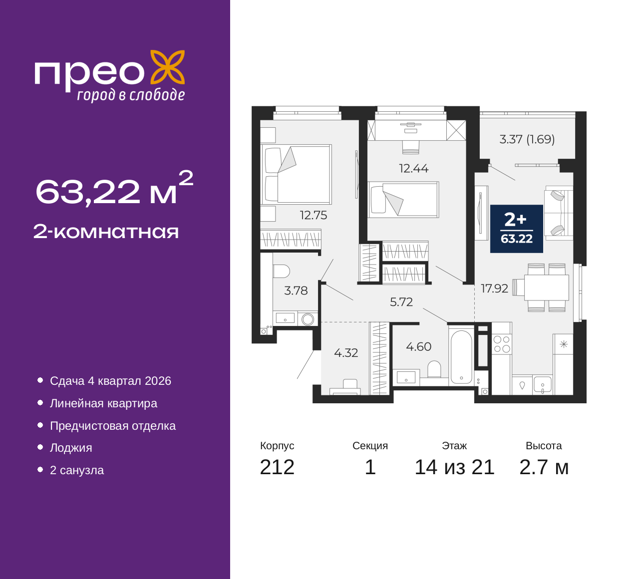 Просторная двухкомнатная квартира с предчистовой отделкой в ЖК "Прео" на 14 этаже. Общая площадь: 63.22 кв.м., жилая: 25.19 кв.м., площадь просторной кухни-столовой: 17.92 кв.м. Комнаты изолированные, все окна выходят на одну сторону. В квартире одна лоджия, один совмещенный и один раздельный санузел. Высота потолков 2.7 м. Квартира находится в корпусе 212. Дом монолитный, одноподъездный, высотой 21 этаж. На этаже 8 квартир. В подъезде 2 пассажирских и 1 грузовой лифт. Окончание строительства - 4 квартал 2026 года. Оформление сделки по договору долевого участия. Преображенский — один из самых привлекательных районов для жизни! Это полностью самостоятельный жилой район с точки зрения инфраструктуры. Преображенский находится между Московским и Червишевским трактами в квартале улиц Закалужская — Вьюжная — Александра Протозанова. Не нужно ждать, когда появится инфраструктура — переезжайте на всё готовое. Вблизи расположены действующие школа и детский сад. В этом году откроется еще один сад, а в следующем году — школа. По соседству с Преображенским запланировано строительство городского парка «Комарово» площадью 38 гектар. За 10 минут можно доехать на автомобиле до крупных ТРЦ: «Лента», «Кристалл», «Леруа Мерлен», «Метро» и «Ашан». С 2018 года в районе открыт Соседский центр — пространство, созданное для формирования добрососедской среды, совместного досуга, общения и реализации соседских инициатив. Здесь проходят встречи соседей, а также сами жители района организовывают мероприятия. Организатором такого события может стать любой желающий. В квартирах выполнена качественная предчистовая отделка. Гладкие стены с финишным выравниванием по маякам. Ровный потолок для установки натяжного потолка. Установлены пятикамерные окна с двойным стеклопакетом (3 стекла). Дизайнерские холлы с видеонаблюдением, безбарьерным и прозрачным входом – всегда светло и спокойно. На первом этаже есть просторные колясочные, где все жители могут оставлять свои коляски и велосипеды. В Преображенском есть всё, что нужно для активного отдыха и занятий спортом. Мы сделали большое футбольное поле с безопасным покрытием. Также установили хоккейный корт, который оборудован по всем необходимым стандартам. Во дворах можно делать упражнения на специальных площадках с турниками. Весь район мы обустроили велодорожками, которые связаны в единый маршрут. У нас есть сухие фонтаны, бьющие из земли, деревья, веревки, сетки, скалодром, газон, песок и резинка — осталось просто дать своему ребенку право на свободную игру. По-настоящему хорошие дворы — это те, которые дети предпочитают соцсетям и телевизору. Аккредитация в банках: ПАО Банк «ВТБ», ПАО «Газпромбанк», ПАО «Банк Уралсиб», «Сбербанк России», ОАО «Альфа-Банк» и других. (AQID02427673)
