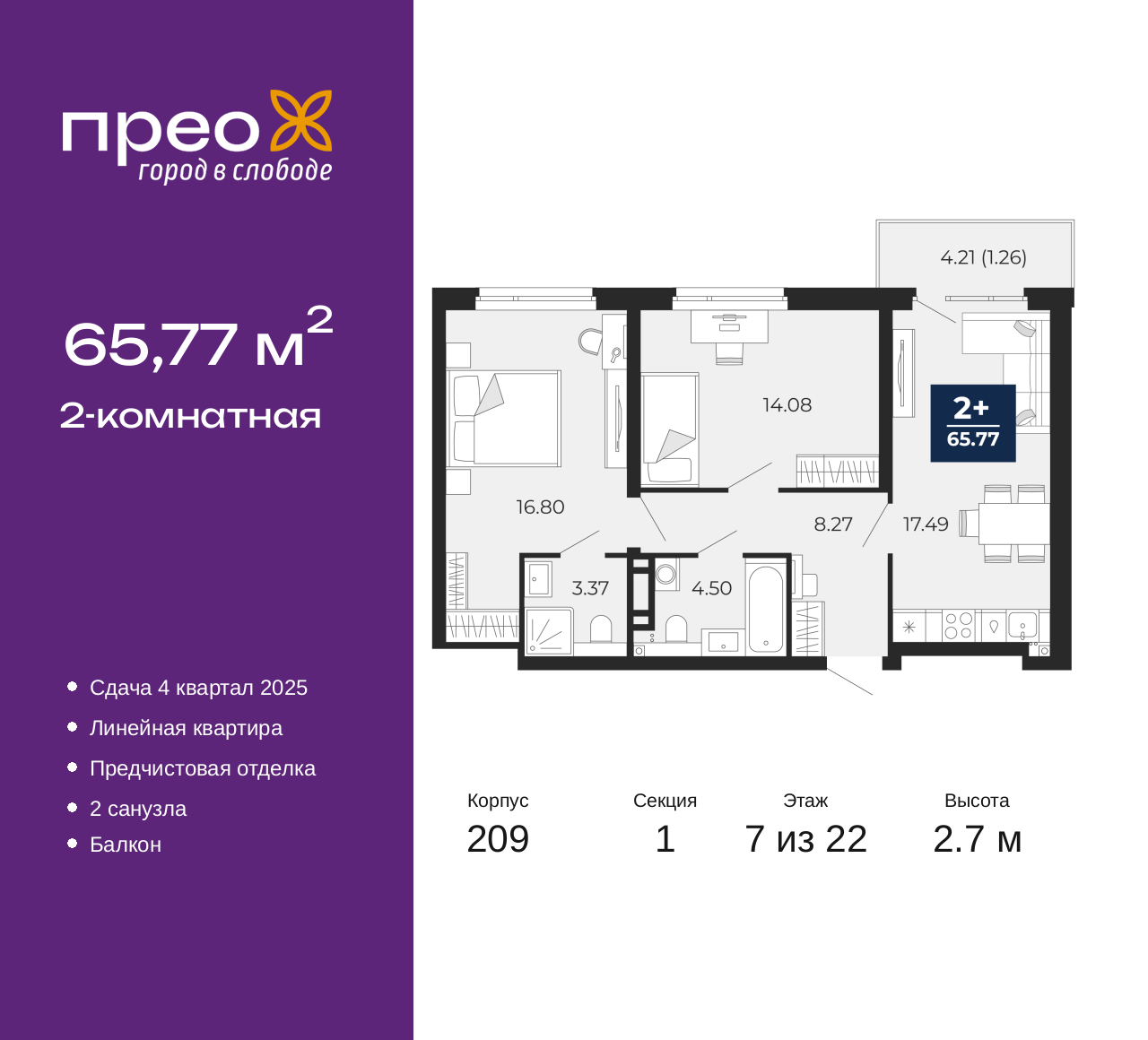 2-комн. квартира с предчистовой отделкой в ЖК "Прео" на 7 этаже. Общая площадь: 65.77 кв.м., жилая: 30.88 кв.м., площадь просторной кухни-столовой: 17.49 кв.м. Комнаты изолированные, все окна выходят на одну сторону. В квартире один балкон, два совмещенных санузла. Высота потолков 2.7 м. Квартира находится в корпусе 209. Дом монолитный, одноподъездный, высотой 22 этажа. На этаже 8 квартир. В подъезде 1 пассажирский и 1 грузовой лифт. Окончание строительства - 4 квартал 2025 года. Оформление сделки по договору долевого участия. Преображенский — один из самых привлекательных районов для жизни! Это полностью самостоятельный жилой район с точки зрения инфраструктуры. Преображенский находится между Московским и Червишевским трактами в квартале улиц Закалужская — Вьюжная — Александра Протозанова. Не нужно ждать, когда появится инфраструктура — переезжайте на всё готовое. Вблизи расположены действующие школа и детский сад. В этом году откроется еще один сад, а в следующем году — школа. По соседству с Преображенским запланировано строительство городского парка «Комарово» площадью 38 гектар. За 10 минут можно доехать на автомобиле до крупных ТРЦ: «Лента», «Кристалл», «Леруа Мерлен», «Метро» и «Ашан». С 2018 года в районе открыт Соседский центр — пространство, созданное для формирования добрососедской среды, совместного досуга, общения и реализации соседских инициатив. Здесь проходят встречи соседей, а также сами жители района организовывают мероприятия. Организатором такого события может стать любой желающий. В квартирах выполнена качественная предчистовая отделка. Гладкие стены с финишным выравниванием по маякам. Ровный потолок для установки натяжного потолка. Установлены пятикамерные окна с двойным стеклопакетом (3 стекла). Дизайнерские холлы с видеонаблюдением, безбарьерным и прозрачным входом – всегда светло и спокойно. На первом этаже есть просторные колясочные, где все жители могут оставлять свои коляски и велосипеды. В Преображенском есть всё, что нужно для активного отдыха и занятий спортом. Мы сделали большое футбольное поле с безопасным покрытием. Также установили хоккейный корт, который оборудован по всем необходимым стандартам. Во дворах можно делать упражнения на специальных площадках с турниками. Весь район мы обустроили велодорожками, которые связаны в единый маршрут. У нас есть сухие фонтаны, бьющие из земли, деревья, веревки, сетки, скалодром, газон, песок и резинка — осталось просто дать своему ребенку право на свободную игру. По-настоящему хорошие дворы — это те, которые дети предпочитают соцсетям и телевизору. Аккредитация в банках: ОАО «Альфа-Банк», ПАО «Банк Уралсиб», ПАО «Газпромбанк», «Сбербанк России», ПАО Банк «ВТБ» и других. (AQID02434722)