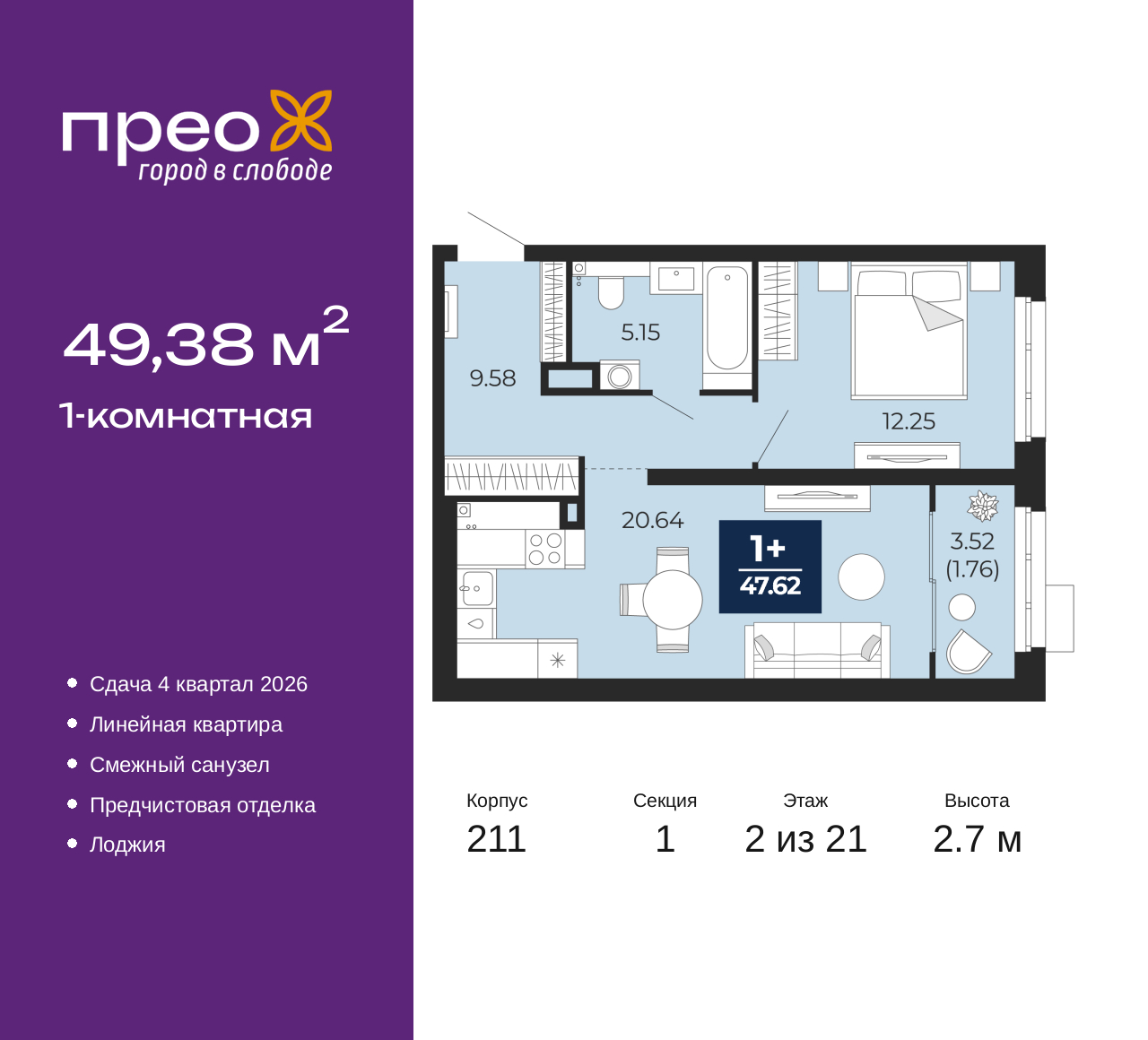 1-комн. квартира с предчистовой отделкой в ЖК "Прео" на 2 этаже. Общая площадь: 49.38 кв.м., жилая: 12.25 кв.м., площадь просторной кухни-столовой: 20.64 кв.м. Все окна выходят на одну сторону. В квартире одна лоджия, один совмещенный санузел. Высота потолков 2.7 м. Дом монолитный, черырехподъездный, переменной этажности, от 14 до 21 этажей. Квартира находится в 1-й секции высотой 21 этаж в корпусе 211. На этаже 8 квартир. В подъезде 1 пассажирский и 1 грузовой лифт. Окончание строительства - 4 квартал 2026 года. Оформление сделки по договору долевого участия. Преображенский — один из самых привлекательных районов для жизни! Это полностью самостоятельный жилой район с точки зрения инфраструктуры. Преображенский находится между Московским и Червишевским трактами в квартале улиц Закалужская — Вьюжная — Александра Протозанова. Не нужно ждать, когда появится инфраструктура — переезжайте на всё готовое. Вблизи расположены действующие школа и детский сад. В этом году откроется еще один сад, а в следующем году — школа. По соседству с Преображенским запланировано строительство городского парка «Комарово» площадью 38 гектар. За 10 минут можно доехать на автомобиле до крупных ТРЦ: «Лента», «Кристалл», «Леруа Мерлен», «Метро» и «Ашан». С 2018 года в районе открыт Соседский центр — пространство, созданное для формирования добрососедской среды, совместного досуга, общения и реализации соседских инициатив. Здесь проходят встречи соседей, а также сами жители района организовывают мероприятия. Организатором такого события может стать любой желающий. В квартирах выполнена качественная предчистовая отделка. Гладкие стены с финишным выравниванием по маякам. Ровный потолок для установки натяжного потолка. Установлены пятикамерные окна с двойным стеклопакетом (3 стекла). Дизайнерские холлы с видеонаблюдением, безбарьерным и прозрачным входом – всегда светло и спокойно. На первом этаже есть просторные колясочные, где все жители могут оставлять свои коляски и велосипеды. В Преображенском есть всё, что нужно для активного отдыха и занятий спортом. Мы сделали большое футбольное поле с безопасным покрытием. Также установили хоккейный корт, который оборудован по всем необходимым стандартам. Во дворах можно делать упражнения на специальных площадках с турниками. Весь район мы обустроили велодорожками, которые связаны в единый маршрут. У нас есть сухие фонтаны, бьющие из земли, деревья, веревки, сетки, скалодром, газон, песок и резинка — осталось просто дать своему ребенку право на свободную игру. По-настоящему хорошие дворы — это те, которые дети предпочитают соцсетям и телевизору. Аккредитация в банках: ОАО «Альфа-Банк», ПАО «Банк Уралсиб», ПАО Банк «ВТБ», ПАО «Газпромбанк», «Сбербанк России» и других. (AQID02446395)