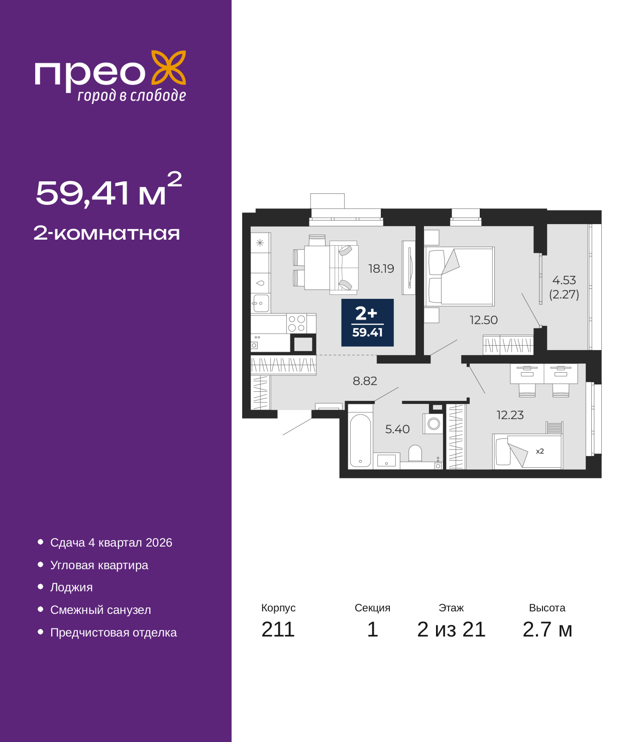 2-комн. квартира с предчистовой отделкой в ЖК "Прео" на 2 этаже. Общая площадь: 59.41 кв.м., жилая: 24.73 кв.м., площадь просторной кухни-столовой: 18.19 кв.м. Квартира угловая, идеально подойдет любителям тишины и панорамных видов. В квартире одна лоджия, один совмещенный санузел. Высота потолков 2.7 м. Дом монолитный, черырехподъездный, переменной этажности, от 14 до 21 этажей. Квартира находится в 1-й секции высотой 21 этаж в корпусе 211. На этаже 8 квартир. В подъезде 1 пассажирский и 1 грузовой лифт. Окончание строительства - 4 квартал 2026 года. Оформление сделки по договору долевого участия. Преображенский — один из самых привлекательных районов для жизни! Это полностью самостоятельный жилой район с точки зрения инфраструктуры. Преображенский находится между Московским и Червишевским трактами в квартале улиц Закалужская — Вьюжная — Александра Протозанова. Не нужно ждать, когда появится инфраструктура — переезжайте на всё готовое. Вблизи расположены действующие школа и детский сад. В этом году откроется еще один сад, а в следующем году — школа. По соседству с Преображенским запланировано строительство городского парка «Комарово» площадью 38 гектар. За 10 минут можно доехать на автомобиле до крупных ТРЦ: «Лента», «Кристалл», «Леруа Мерлен», «Метро» и «Ашан». С 2018 года в районе открыт Соседский центр — пространство, созданное для формирования добрососедской среды, совместного досуга, общения и реализации соседских инициатив. Здесь проходят встречи соседей, а также сами жители района организовывают мероприятия. Организатором такого события может стать любой желающий. В квартирах выполнена качественная предчистовая отделка. Гладкие стены с финишным выравниванием по маякам. Ровный потолок для установки натяжного потолка. Установлены пятикамерные окна с двойным стеклопакетом (3 стекла). Дизайнерские холлы с видеонаблюдением, безбарьерным и прозрачным входом – всегда светло и спокойно. На первом этаже есть просторные колясочные, где все жители могут оставлять свои коляски и велосипеды. В Преображенском есть всё, что нужно для активного отдыха и занятий спортом. Мы сделали большое футбольное поле с безопасным покрытием. Также установили хоккейный корт, который оборудован по всем необходимым стандартам. Во дворах можно делать упражнения на специальных площадках с турниками. Весь район мы обустроили велодорожками, которые связаны в единый маршрут. У нас есть сухие фонтаны, бьющие из земли, деревья, веревки, сетки, скалодром, газон, песок и резинка — осталось просто дать своему ребенку право на свободную игру. По-настоящему хорошие дворы — это те, которые дети предпочитают соцсетям и телевизору. Аккредитация в банках: ПАО «Банк Уралсиб», ПАО «Газпромбанк», «Сбербанк России», ОАО «Альфа-Банк», ПАО Банк «ВТБ» и других. (AQID02427640)