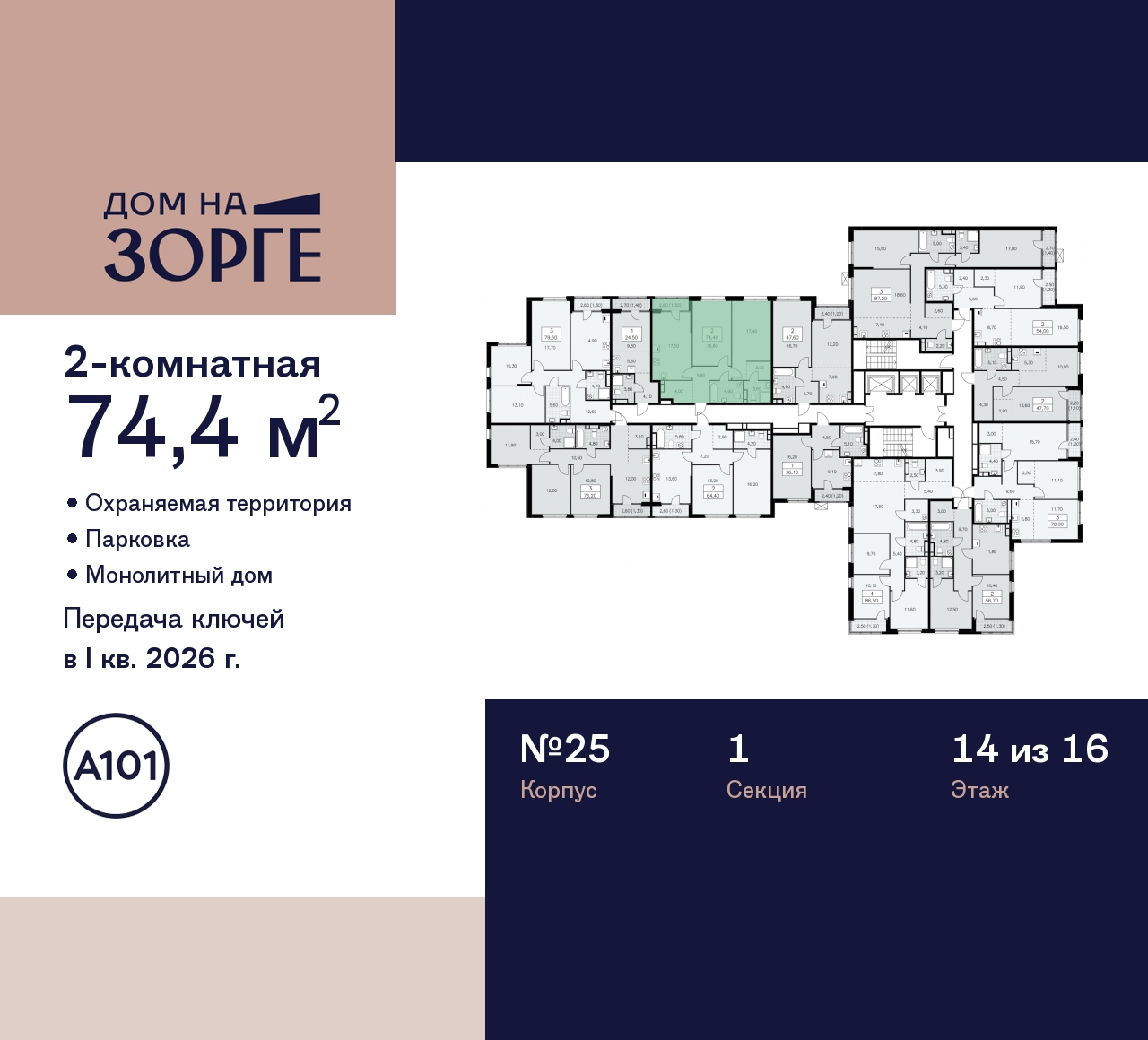2-комн. квартира от застройщика с предчистовой отделкой в ЖК "Дом на Зорге" на 14 этаже. Общая площадь: 74.4 кв.м., жилая: 34.2 кв.м., площадь просторной кухни-столовой: 17.5 кв.м. Комнаты изолированные, все окна выходят на одну сторону. В квартире одна лоджия, два совмещенных санузла. Высота потолков 3.1 м. Имеется ниша под гардероб. Дом монолитный, двухподъездный, высотой 16 этажей. Квартира находится в 1-й секции в корпусе 25. На этаже 13 квартир. В подъезде 2 пассажирских и 1 грузовой лифт. Начало строительства - 2 квартал 2023 года. Окончание строительства - 1 квартал 2026 года. Оформление сделки по договору долевого участия. Артикул квартиры по базе застройщика 25К-25-168. В шаговой доступности от дома расположены станции метро (расстояние по прямой): «Зорге» (500 м), «Октябрьское поле» (800 м), «Панфиловская» (900 м), «Сокол» (1.6 км), «Хорошево» (1.6 км). ПРЕДЛОЖЕНИЯ ОТ ЗАСТРОЙЩИКА В ОКТЯБРЕ 2025: Ипотека от 13,9 % для всех! На весь срок. "Семейная ипотека" вернулась. Ставка от 3,5 % на весь срок! Без удорожания! Выгодное ипотечное комбо: Ипотека от 2200 р./мес. и от 6 % после рождения ребёнка! Ипотека для всех "Держи пять!" - ставка 5 % на 2 года! *более подробную информацию по скидкам и акциям уточняйте в отделе продаж "Дом на Зорге"» бизнес-класса возводится в престижном районе «Сокол» с исторической «сталинской» застройкой и статусными жилыми комплексами на границе с Хорошёвским районом Северо-Западного АО. До действующей станции метро (и МЦК) «Зорге» всего 350 метров. «Дом на Зорге» отличается элегантным и статусным внешним видом – идеально соответствует «дресс-коду» исторического окружения и в тоже время обращает на себя внимание. Вентилируемые фасады облицованы фиброцементными и керамогранитными панелями, которые повторяют фактуру натурального камня и бетона. Кондиционеры скроют корзины и стильные блоки, расположенные в декоративных элементах фасада. Мягкая архитектурно-художественная подсветка подчеркнёт благородный экстерьер дома. Сформированная инфраструктура района предоставит жителям богатый выбор мест для отдыха, шопинга и занятий спортом. На первом этаже «Дома на Зорге» откроются уютные магазины, атмосферные кафе и салоны красоты с отличным сервисом. Здесь предусмотрено всё для удобства, позитивного настроения и безопасности жителей. В закрытый двор не войдут посторонние. Автомобили останутся за периметром или в подземном паркинге. Две 16-этажных секции дома соединит лобби с дизайнерской отделкой. Оно станет стильным общественным пространством и главным входом для жителей, также ведущим в скрытый от посторонних глаз приватный внутренний двор. Всего в локации – более четырёх десятков разнообразных учебных учреждений для детей, включая легендарную «Курчатовскую школу». В шаговой доступности находятся корпуса школы № 1251 имени генерала Шарля де Голля – с дошкольным отделением. На территории дома будут благоустроены общий и приватный (доступный только жителям) дворы. Дизайн каждой функциональной зоны уникален, а вместе они подчёркивают благородный архитектурный стиль здания. В основе цветовых решений – «отражение» фасадов, мягкие природные оттенки. (AQID02221134)
