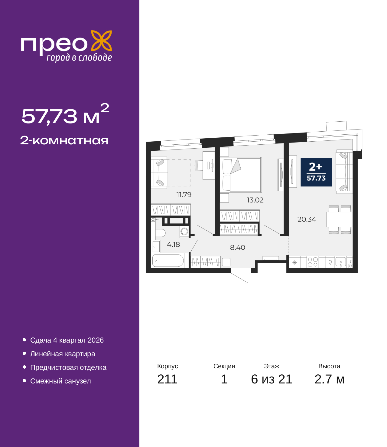 - Общая площадь 57.73 м²