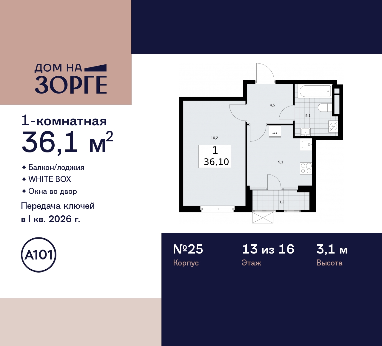 Продается 1-комн. квартира от застройщика с предчистовой отделкой в ЖК "Дом на Зорге" на 13 этаже. Общая площадь: 36.1 кв.м., жилая: 16.2 кв.м., площадь просторной кухни-столовой: 9.1 кв.м. Все окна выходят на одну сторону. В квартире одна лоджия, один совмещенный санузел. Высота потолков 3.1 м. Дом монолитный, двухподъездный, высотой 16 этажей. Квартира находится в 1-й секции в корпусе 25. На этаже 13 квартир. В подъезде 2 пассажирских и 1 грузовой лифт. Начало строительства - 2 квартал 2023 года. Окончание строительства - 1 квартал 2026 года. Оформление сделки по договору долевого участия. Артикул квартиры по базе застройщика 25К-25-150. В шаговой доступности от дома находятся станции метро (расстояние по прямой): «Зорге» (500 м), «Октябрьское поле» (800 м), «Панфиловская» (900 м), «Сокол» (1.6 км), «Хорошево» (1.6 км). ПРЕДЛОЖЕНИЯ ОТ ЗАСТРОЙЩИКА В ОКТЯБРЕ 2025: Ипотека от 13,9 % для всех! На весь срок. "Семейная ипотека" вернулась. Ставка от 3,5 % на весь срок! Без удорожания! Выгодное ипотечное комбо: Ипотека от 2200 р./мес. и от 6 % после рождения ребёнка! Ипотека для всех "Держи пять!" - ставка 5 % на 2 года! *более подробную информацию по скидкам и акциям уточняйте в отделе продаж "Дом на Зорге"» бизнес-класса возводится в престижном районе «Сокол» с исторической «сталинской» застройкой и статусными жилыми комплексами на границе с Хорошёвским районом Северо-Западного АО. До действующей станции метро (и МЦК) «Зорге» всего 350 метров. «Дом на Зорге» отличается элегантным и статусным внешним видом – идеально соответствует «дресс-коду» исторического окружения и в тоже время обращает на себя внимание. Вентилируемые фасады облицованы фиброцементными и керамогранитными панелями, которые повторяют фактуру натурального камня и бетона. Кондиционеры скроют корзины и стильные блоки, расположенные в декоративных элементах фасада. Мягкая архитектурно-художественная подсветка подчеркнёт благородный экстерьер дома. Сформированная инфраструктура района предоставит жителям богатый выбор мест для отдыха, шопинга и занятий спортом. На первом этаже «Дома на Зорге» откроются уютные магазины, атмосферные кафе и салоны красоты с отличным сервисом. Здесь предусмотрено всё для удобства, позитивного настроения и безопасности жителей. В закрытый двор не войдут посторонние. Автомобили останутся за периметром или в подземном паркинге. Две 16-этажных секции дома соединит лобби с дизайнерской отделкой. Оно станет стильным общественным пространством и главным входом для жителей, также ведущим в скрытый от посторонних глаз приватный внутренний двор. Всего в локации – более четырёх десятков разнообразных учебных учреждений для детей, включая легендарную «Курчатовскую школу». В шаговой доступности находятся корпуса школы № 1251 имени генерала Шарля де Голля – с дошкольным отделением. На территории дома будут благоустроены общий и приватный (доступный только жителям) дворы. Дизайн каждой функциональной зоны уникален, а вместе они подчёркивают благородный архитектурный стиль здания. В основе цветовых решений – «отражение» фасадов, мягкие природные оттенки. (AQID02221116)