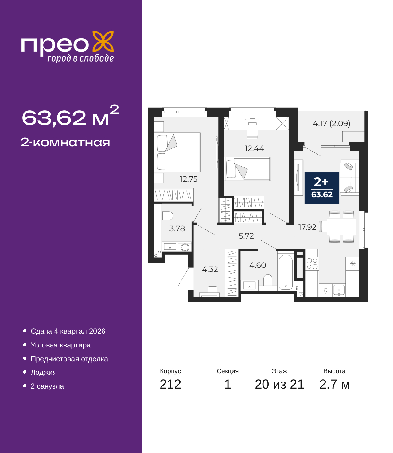 - Общая площадь 63.62 м²
