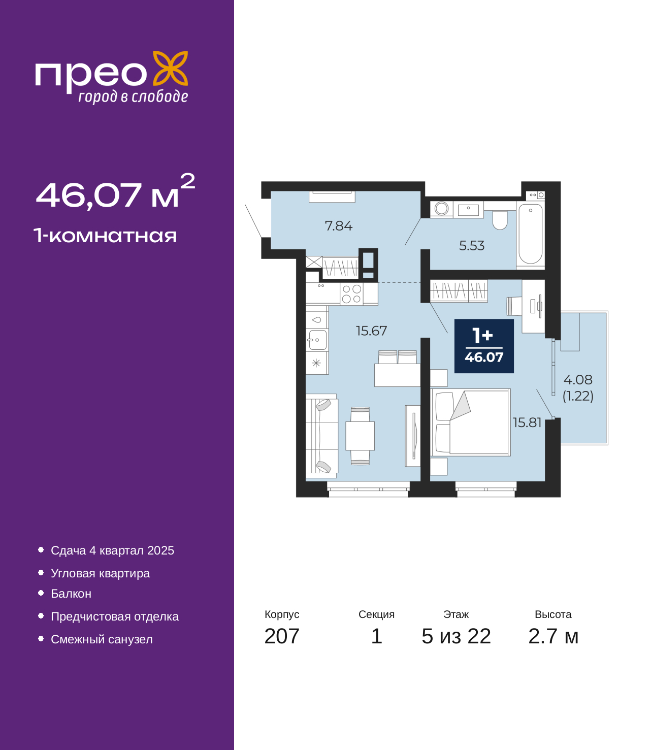 Просторная однокомнатная квартира с предчистовой отделкой в ЖК "Прео" на 5 этаже. Общая площадь: 46.07 кв.м., жилая: 15.81 кв.м., площадь просторной кухни-столовой: 15.67 кв.м. Угловая квартира, очень светлая, естественная вентиляция при открытии окон. В квартире один балкон, один совмещенный санузел. Высота потолков 2.7 м. Дом монолитный, двухподъездный, высотой 22 этажа. Квартира находится в 1-й секции в корпусе 207. На этаже 8 квартир. В подъезде 1 пассажирский и 1 грузовой лифт. Окончание строительства - 4 квартал 2025 года. Оформление сделки по договору долевого участия. Преображенский — один из самых привлекательных районов для жизни! Это полностью самостоятельный жилой район с точки зрения инфраструктуры. Преображенский находится между Московским и Червишевским трактами в квартале улиц Закалужская — Вьюжная — Александра Протозанова. Не нужно ждать, когда появится инфраструктура — переезжайте на всё готовое. Вблизи расположены действующие школа и детский сад. В этом году откроется еще один сад, а в следующем году — школа. По соседству с Преображенским запланировано строительство городского парка «Комарово» площадью 38 гектар. За 10 минут можно доехать на автомобиле до крупных ТРЦ: «Лента», «Кристалл», «Леруа Мерлен», «Метро» и «Ашан». С 2018 года в районе открыт Соседский центр — пространство, созданное для формирования добрососедской среды, совместного досуга, общения и реализации соседских инициатив. Здесь проходят встречи соседей, а также сами жители района организовывают мероприятия. Организатором такого события может стать любой желающий. В квартирах выполнена качественная предчистовая отделка. Гладкие стены с финишным выравниванием по маякам. Ровный потолок для установки натяжного потолка. Установлены пятикамерные окна с двойным стеклопакетом (3 стекла). Дизайнерские холлы с видеонаблюдением, безбарьерным и прозрачным входом – всегда светло и спокойно. На первом этаже есть просторные колясочные, где все жители могут оставлять свои коляски и велосипеды. В Преображенском есть всё, что нужно для активного отдыха и занятий спортом. Мы сделали большое футбольное поле с безопасным покрытием. Также установили хоккейный корт, который оборудован по всем необходимым стандартам. Во дворах можно делать упражнения на специальных площадках с турниками. Весь район мы обустроили велодорожками, которые связаны в единый маршрут. У нас есть сухие фонтаны, бьющие из земли, деревья, веревки, сетки, скалодром, газон, песок и резинка — осталось просто дать своему ребенку право на свободную игру. По-настоящему хорошие дворы — это те, которые дети предпочитают соцсетям и телевизору. Аккредитация в банках: ПАО «Банк Уралсиб», ПАО Банк «ВТБ», ПАО «Газпромбанк», ОАО «Альфа-Банк», «Сбербанк России» и других. (AQID02434687)