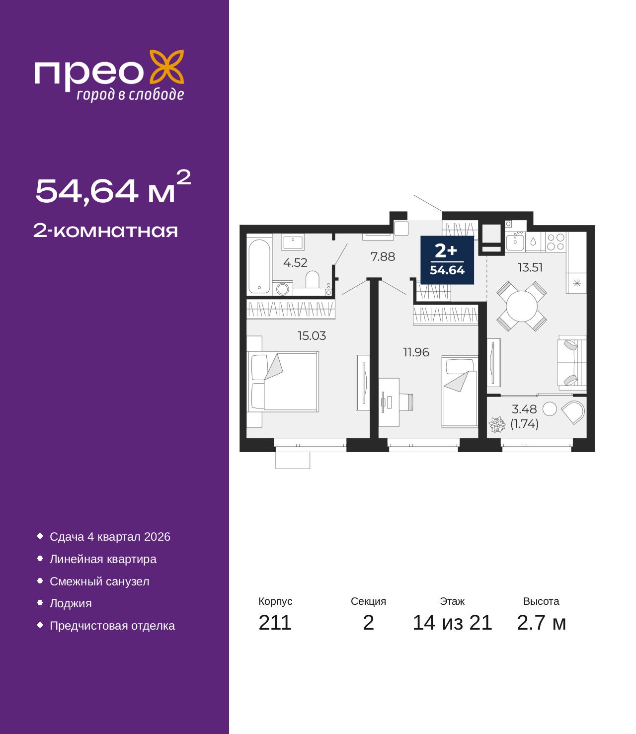 Двухкомнатная квартира от застройщика с предчистовой отделкой в ЖК "Прео" на 14 этаже. Общая площадь: 54.64 кв.м., жилая: 26.99 кв.м., площадь просторной кухни-столовой: 13.51 кв.м. Комнаты изолированные, все окна выходят на одну сторону. В квартире одна лоджия, один совмещенный санузел. Высота потолков 2.7 м. Дом монолитный, черырехподъездный, переменной этажности, от 14 до 21 этажей. Квартира находится во 2-й секции высотой 21 этаж в корпусе 211. На этаже 10 квартир. В подъезде 1 пассажирский и 1 грузовой лифт. Окончание строительства - 4 квартал 2026 года. Оформление сделки по договору долевого участия. Преображенский — один из самых привлекательных районов для жизни! Это полностью самостоятельный жилой район с точки зрения инфраструктуры. Преображенский находится между Московским и Червишевским трактами в квартале улиц Закалужская — Вьюжная — Александра Протозанова. Не нужно ждать, когда появится инфраструктура — переезжайте на всё готовое. Вблизи расположены действующие школа и детский сад. В этом году откроется еще один сад, а в следующем году — школа. По соседству с Преображенским запланировано строительство городского парка «Комарово» площадью 38 гектар. За 10 минут можно доехать на автомобиле до крупных ТРЦ: «Лента», «Кристалл», «Леруа Мерлен», «Метро» и «Ашан». С 2018 года в районе открыт Соседский центр — пространство, созданное для формирования добрососедской среды, совместного досуга, общения и реализации соседских инициатив. Здесь проходят встречи соседей, а также сами жители района организовывают мероприятия. Организатором такого события может стать любой желающий. В квартирах выполнена качественная предчистовая отделка. Гладкие стены с финишным выравниванием по маякам. Ровный потолок для установки натяжного потолка. Установлены пятикамерные окна с двойным стеклопакетом (3 стекла). Дизайнерские холлы с видеонаблюдением, безбарьерным и прозрачным входом – всегда светло и спокойно. На первом этаже есть просторные колясочные, где все жители могут оставлять свои коляски и велосипеды. В Преображенском есть всё, что нужно для активного отдыха и занятий спортом. Мы сделали большое футбольное поле с безопасным покрытием. Также установили хоккейный корт, который оборудован по всем необходимым стандартам. Во дворах можно делать упражнения на специальных площадках с турниками. Весь район мы обустроили велодорожками, которые связаны в единый маршрут. У нас есть сухие фонтаны, бьющие из земли, деревья, веревки, сетки, скалодром, газон, песок и резинка — осталось просто дать своему ребенку право на свободную игру. По-настоящему хорошие дворы — это те, которые дети предпочитают соцсетям и телевизору. Аккредитация в банках: ПАО «Газпромбанк», ПАО «Банк Уралсиб», ПАО Банк «ВТБ», ОАО «Альфа-Банк», «Сбербанк России» и других. (AQID02427599)
