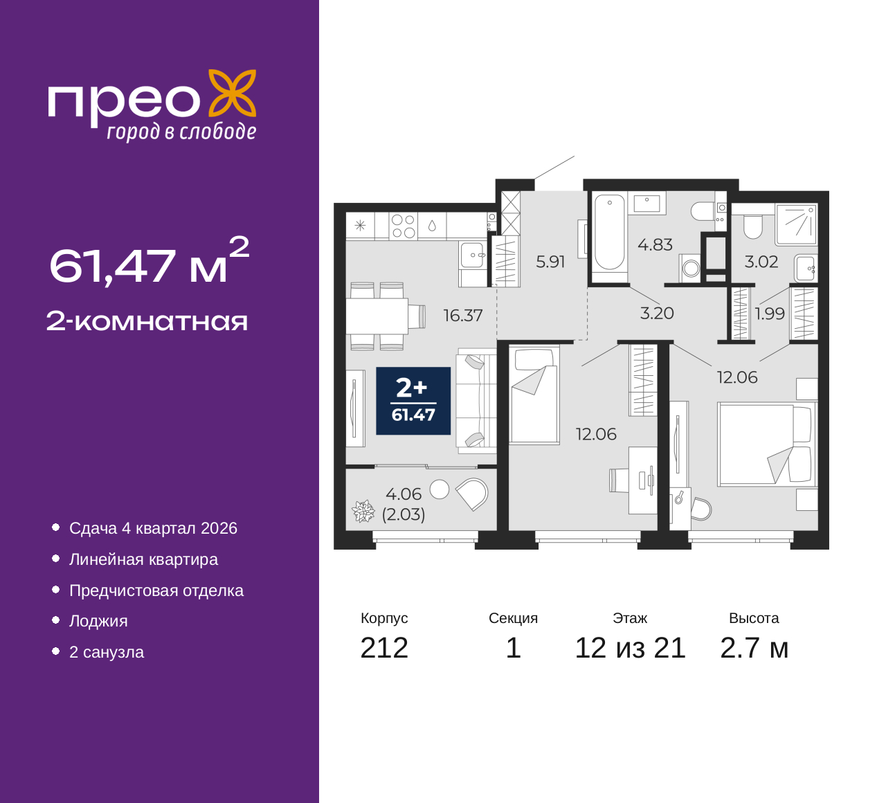 Просторная 2-комн. квартира с предчистовой отделкой в ЖК "Прео" на 12 этаже. Общая площадь: 61.47 кв.м., жилая: 24.12 кв.м., площадь просторной кухни-столовой: 16.37 кв.м. Комнаты изолированные, все окна выходят на одну сторону. В квартире одна лоджия, два совмещенных санузла. Высота потолков 2.7 м. Квартира находится в корпусе 212. Дом монолитный, одноподъездный, высотой 21 этаж. На этаже 8 квартир. В подъезде 2 пассажирских и 1 грузовой лифт. Окончание строительства - 4 квартал 2026 года. Оформление сделки по договору долевого участия. Преображенский — один из самых привлекательных районов для жизни! Это полностью самостоятельный жилой район с точки зрения инфраструктуры. Преображенский находится между Московским и Червишевским трактами в квартале улиц Закалужская — Вьюжная — Александра Протозанова. Не нужно ждать, когда появится инфраструктура — переезжайте на всё готовое. Вблизи расположены действующие школа и детский сад. В этом году откроется еще один сад, а в следующем году — школа. По соседству с Преображенским запланировано строительство городского парка «Комарово» площадью 38 гектар. За 10 минут можно доехать на автомобиле до крупных ТРЦ: «Лента», «Кристалл», «Леруа Мерлен», «Метро» и «Ашан». С 2018 года в районе открыт Соседский центр — пространство, созданное для формирования добрососедской среды, совместного досуга, общения и реализации соседских инициатив. Здесь проходят встречи соседей, а также сами жители района организовывают мероприятия. Организатором такого события может стать любой желающий. В квартирах выполнена качественная предчистовая отделка. Гладкие стены с финишным выравниванием по маякам. Ровный потолок для установки натяжного потолка. Установлены пятикамерные окна с двойным стеклопакетом (3 стекла). Дизайнерские холлы с видеонаблюдением, безбарьерным и прозрачным входом – всегда светло и спокойно. На первом этаже есть просторные колясочные, где все жители могут оставлять свои коляски и велосипеды. В Преображенском есть всё, что нужно для активного отдыха и занятий спортом. Мы сделали большое футбольное поле с безопасным покрытием. Также установили хоккейный корт, который оборудован по всем необходимым стандартам. Во дворах можно делать упражнения на специальных площадках с турниками. Весь район мы обустроили велодорожками, которые связаны в единый маршрут. У нас есть сухие фонтаны, бьющие из земли, деревья, веревки, сетки, скалодром, газон, песок и резинка — осталось просто дать своему ребенку право на свободную игру. По-настоящему хорошие дворы — это те, которые дети предпочитают соцсетям и телевизору. Аккредитация в банках: «Сбербанк России», ПАО Банк «ВТБ», ПАО «Газпромбанк», ОАО «Альфа-Банк», ПАО «Банк Уралсиб» и других. (AQID02427648)