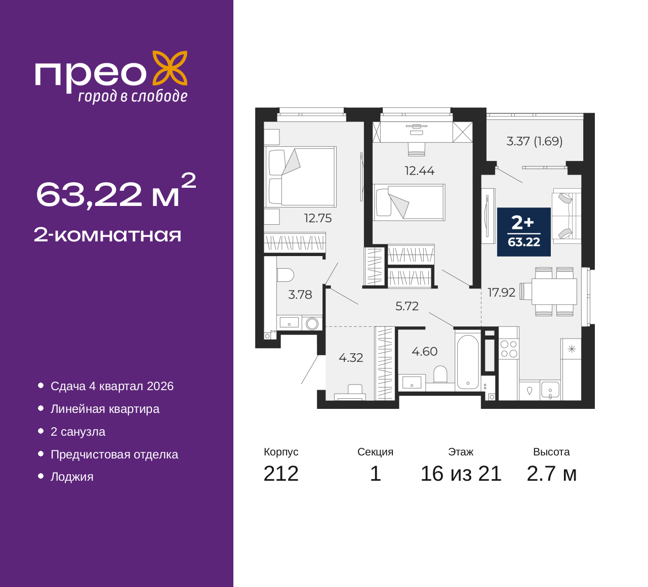 Двухкомнатная квартира от застройщика с предчистовой отделкой в ЖК "Прео" на 16 этаже. Общая площадь: 63.22 кв.м., жилая: 25.19 кв.м., площадь просторной кухни-столовой: 17.92 кв.м. Комнаты изолированные, все окна выходят на одну сторону. В квартире одна лоджия, один совмещенный и один раздельный санузел. Высота потолков 2.7 м. Квартира находится в корпусе 212. Дом монолитный, одноподъездный, высотой 21 этаж. На этаже 8 квартир. В подъезде 2 пассажирских и 1 грузовой лифт. Окончание строительства - 4 квартал 2026 года. Оформление сделки по договору долевого участия. Преображенский — один из самых привлекательных районов для жизни! Это полностью самостоятельный жилой район с точки зрения инфраструктуры. Преображенский находится между Московским и Червишевским трактами в квартале улиц Закалужская — Вьюжная — Александра Протозанова. Не нужно ждать, когда появится инфраструктура — переезжайте на всё готовое. Вблизи расположены действующие школа и детский сад. В этом году откроется еще один сад, а в следующем году — школа. По соседству с Преображенским запланировано строительство городского парка «Комарово» площадью 38 гектар. За 10 минут можно доехать на автомобиле до крупных ТРЦ: «Лента», «Кристалл», «Леруа Мерлен», «Метро» и «Ашан». С 2018 года в районе открыт Соседский центр — пространство, созданное для формирования добрососедской среды, совместного досуга, общения и реализации соседских инициатив. Здесь проходят встречи соседей, а также сами жители района организовывают мероприятия. Организатором такого события может стать любой желающий. В квартирах выполнена качественная предчистовая отделка. Гладкие стены с финишным выравниванием по маякам. Ровный потолок для установки натяжного потолка. Установлены пятикамерные окна с двойным стеклопакетом (3 стекла). Дизайнерские холлы с видеонаблюдением, безбарьерным и прозрачным входом – всегда светло и спокойно. На первом этаже есть просторные колясочные, где все жители могут оставлять свои коляски и велосипеды. В Преображенском есть всё, что нужно для активного отдыха и занятий спортом. Мы сделали большое футбольное поле с безопасным покрытием. Также установили хоккейный корт, который оборудован по всем необходимым стандартам. Во дворах можно делать упражнения на специальных площадках с турниками. Весь район мы обустроили велодорожками, которые связаны в единый маршрут. У нас есть сухие фонтаны, бьющие из земли, деревья, веревки, сетки, скалодром, газон, песок и резинка — осталось просто дать своему ребенку право на свободную игру. По-настоящему хорошие дворы — это те, которые дети предпочитают соцсетям и телевизору. Аккредитация в банках: ОАО «Альфа-Банк», ПАО «Банк Уралсиб», «Сбербанк России», ПАО Банк «ВТБ», ПАО «Газпромбанк» и других. (AQID02427669)